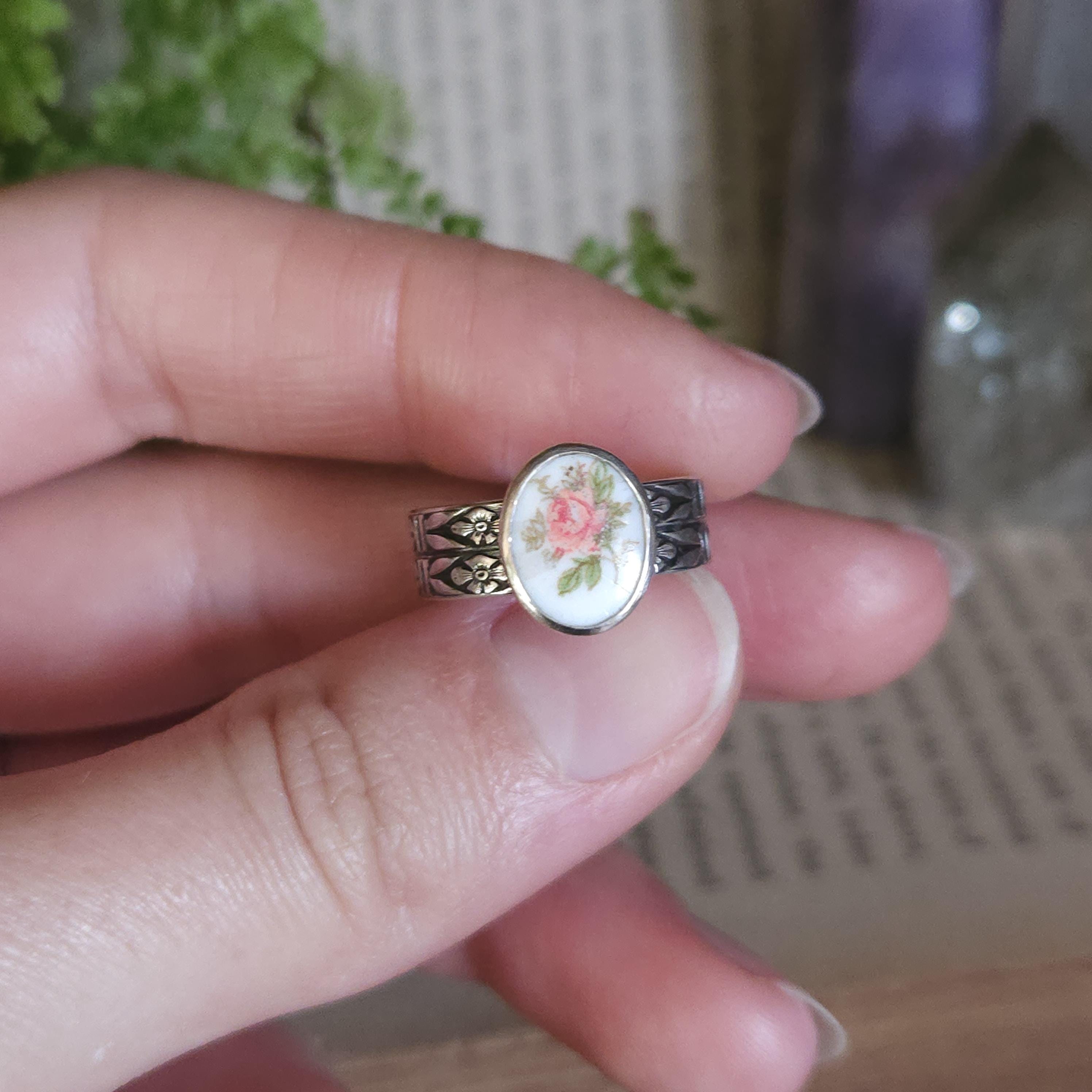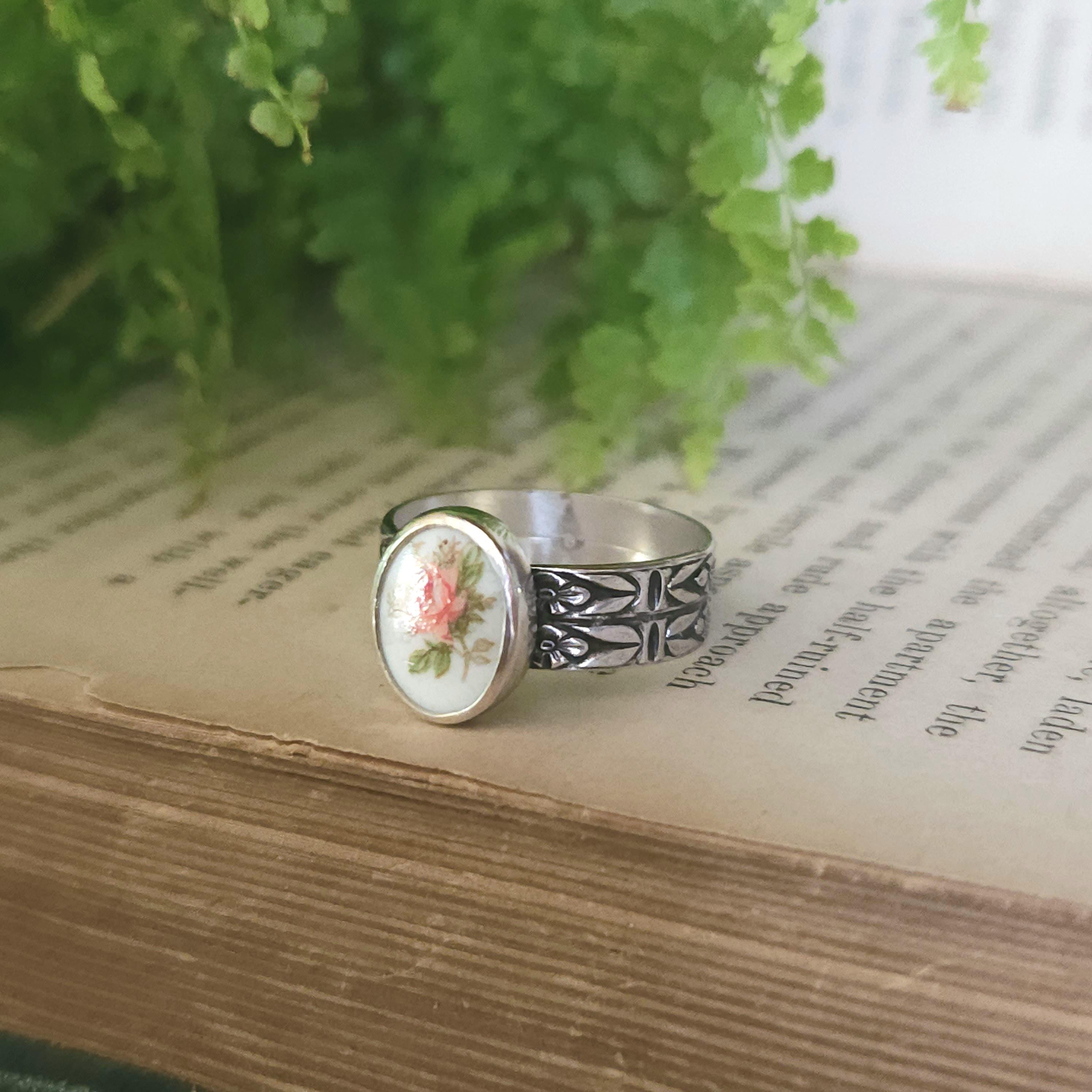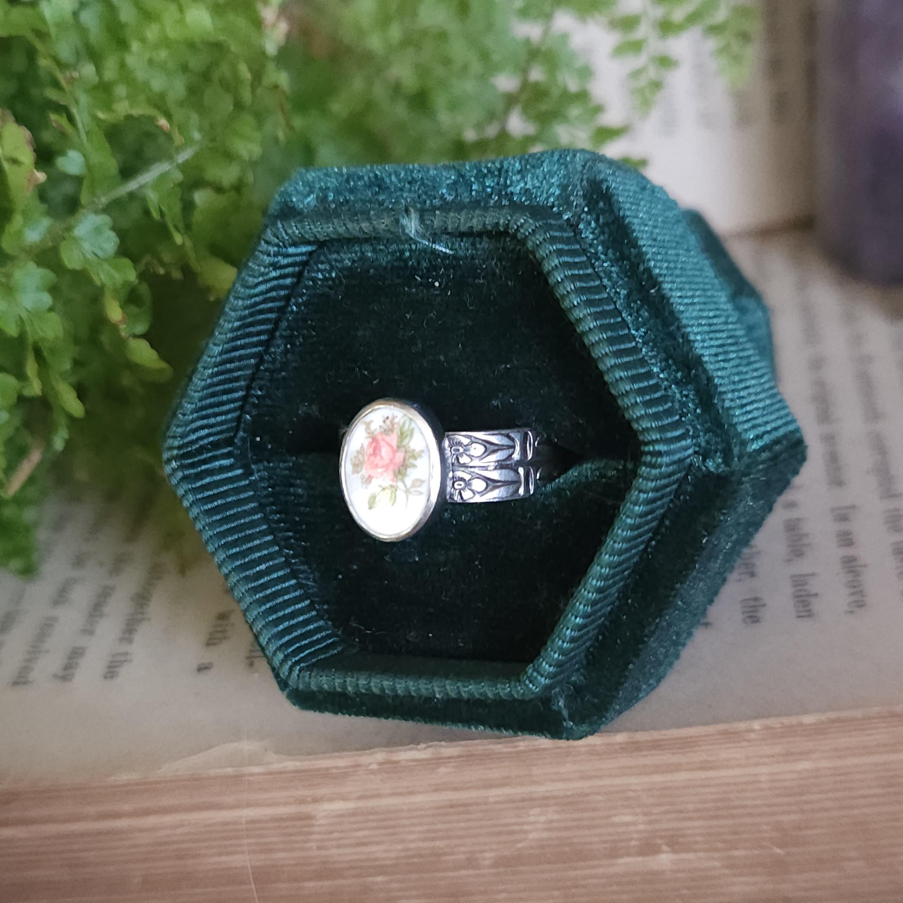 One of a kind handcrafted gemstone ring made using sterling silver and a vintage hand painted glass cabochon from Japan