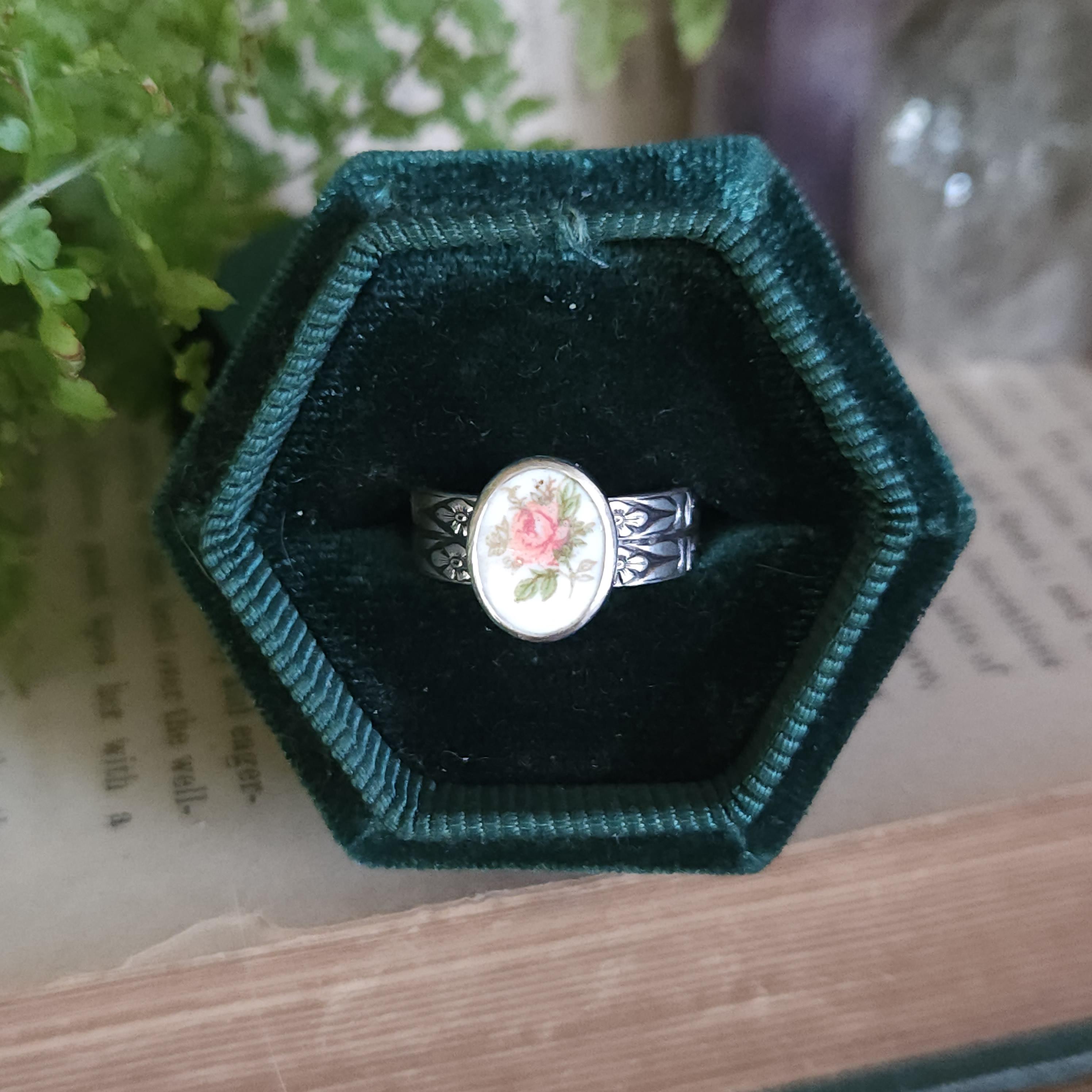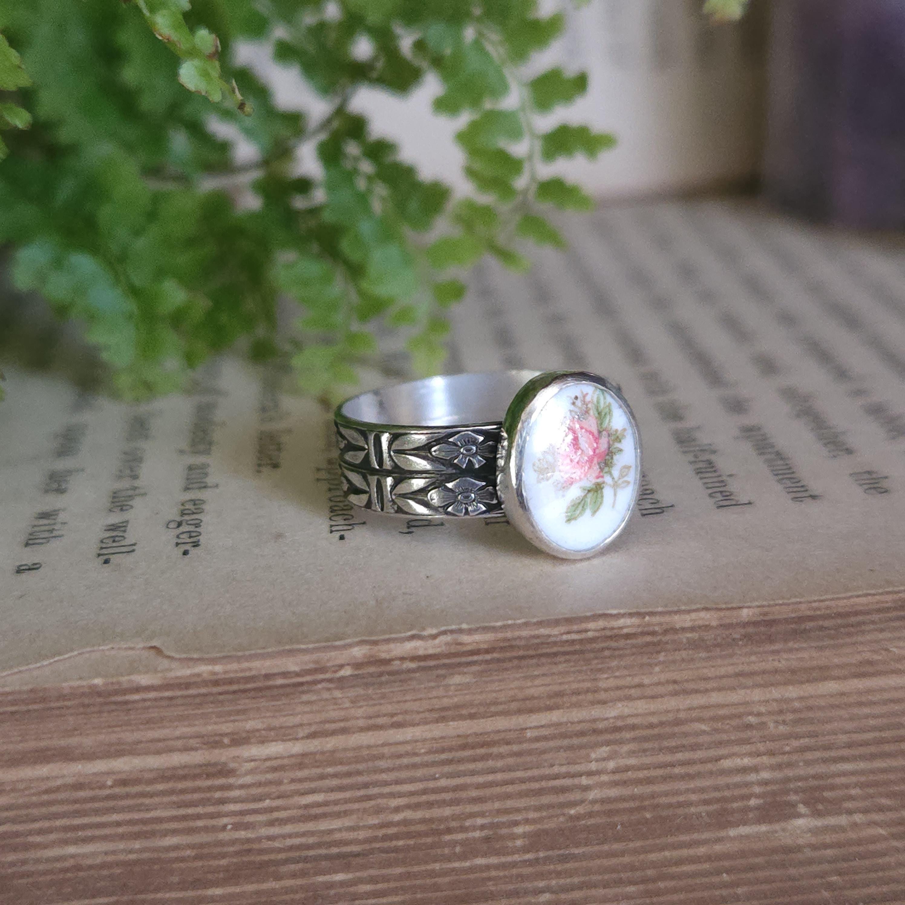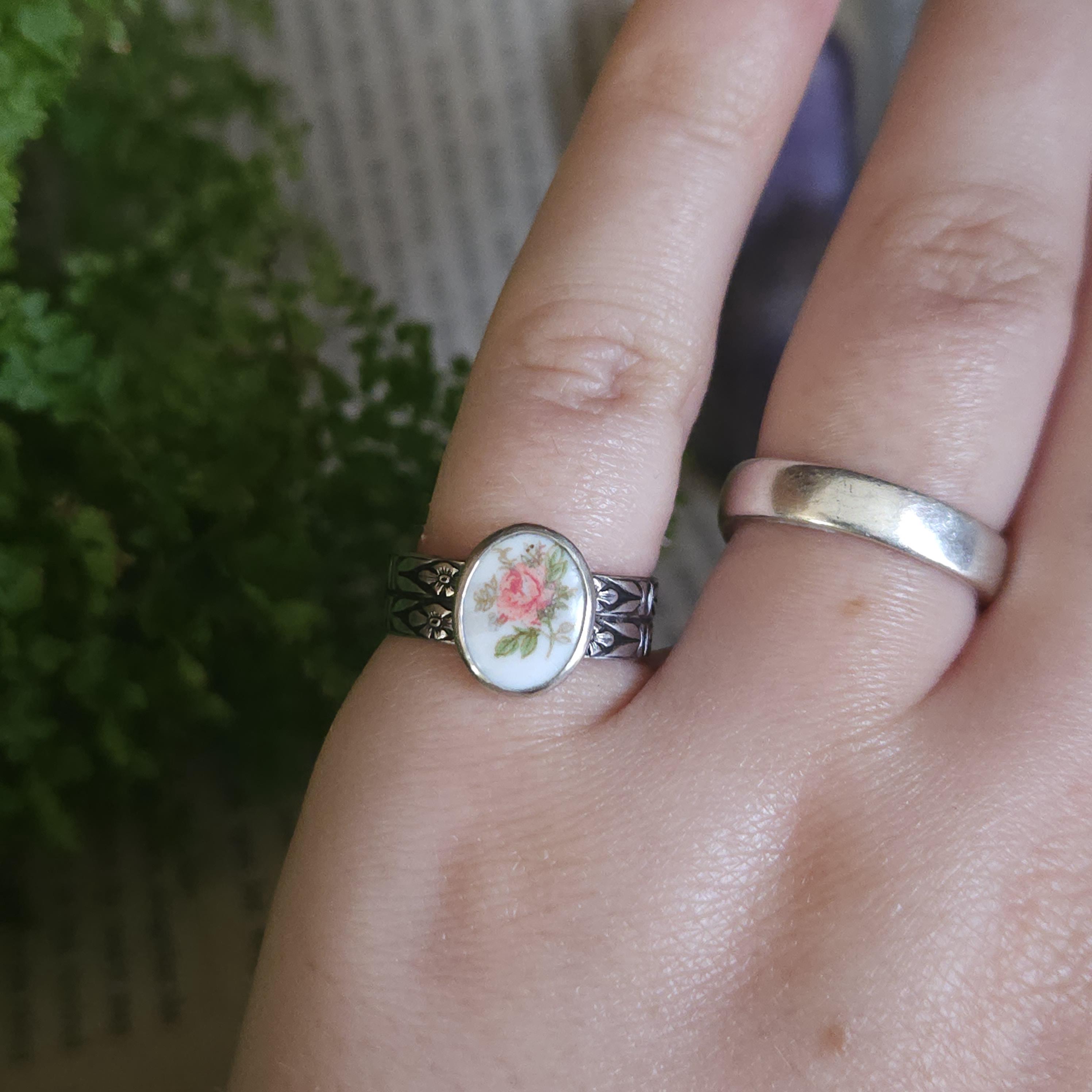 One of a kind handcrafted gemstone ring made using sterling silver and a vintage hand painted glass cabochon from Japan