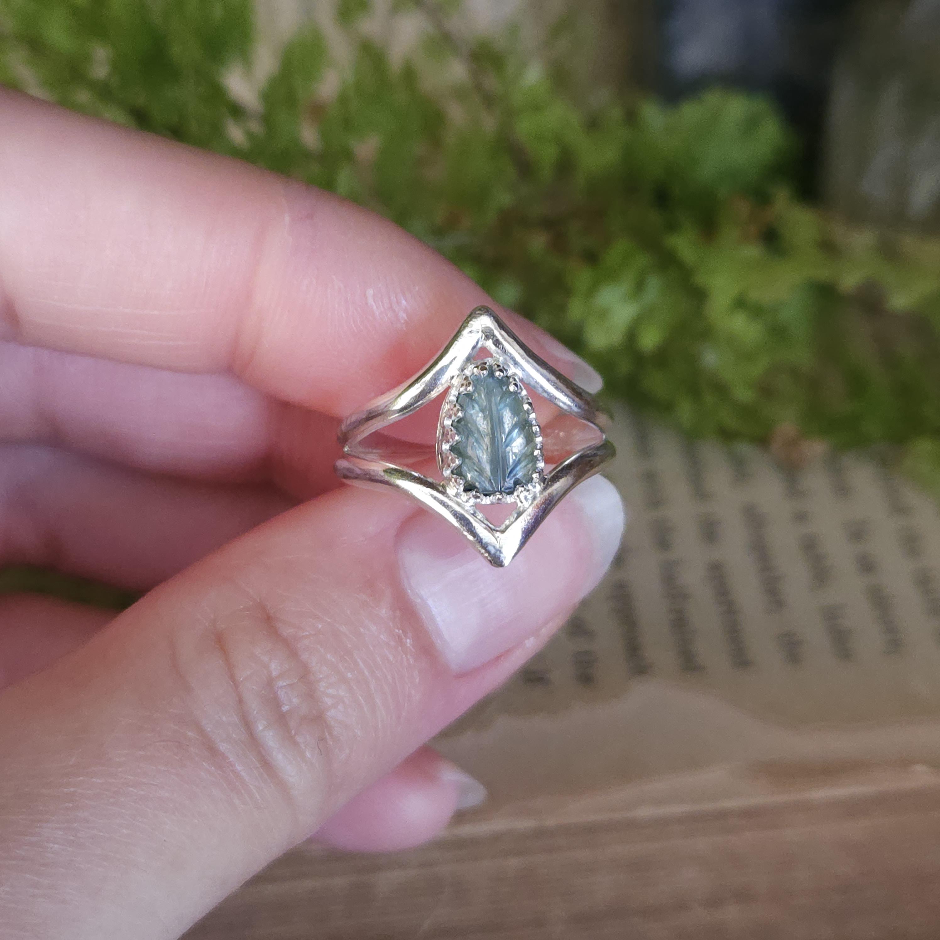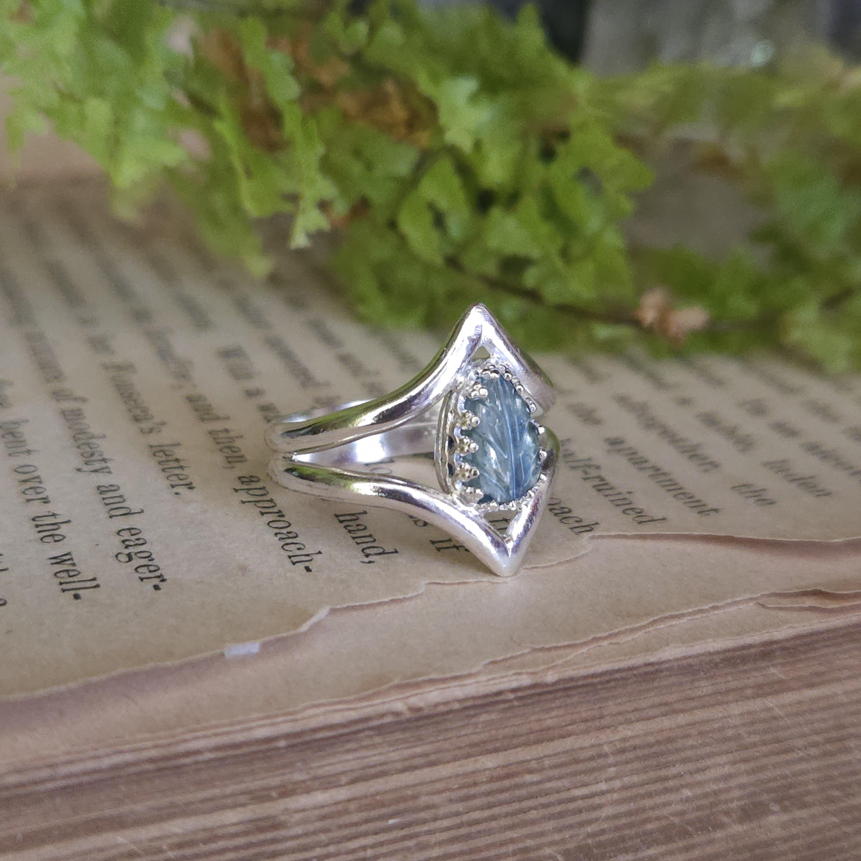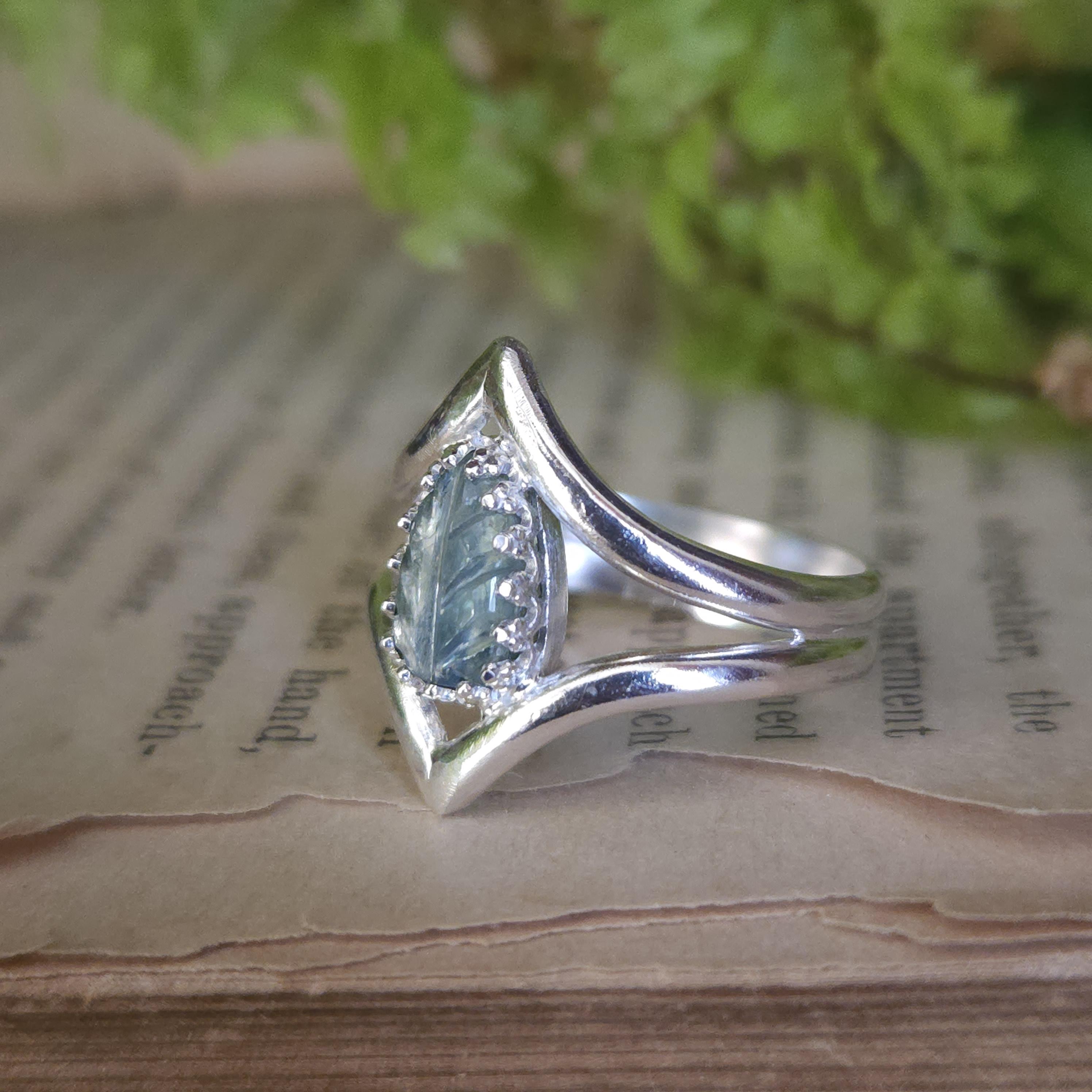 One of a kind handcrafted gemstone ring made using sterling silver and a hand carved mint green kyanite leaf. Kyanite is a relatively soft stone. Please keep this in mind and avoid banging it on any hard surfaces