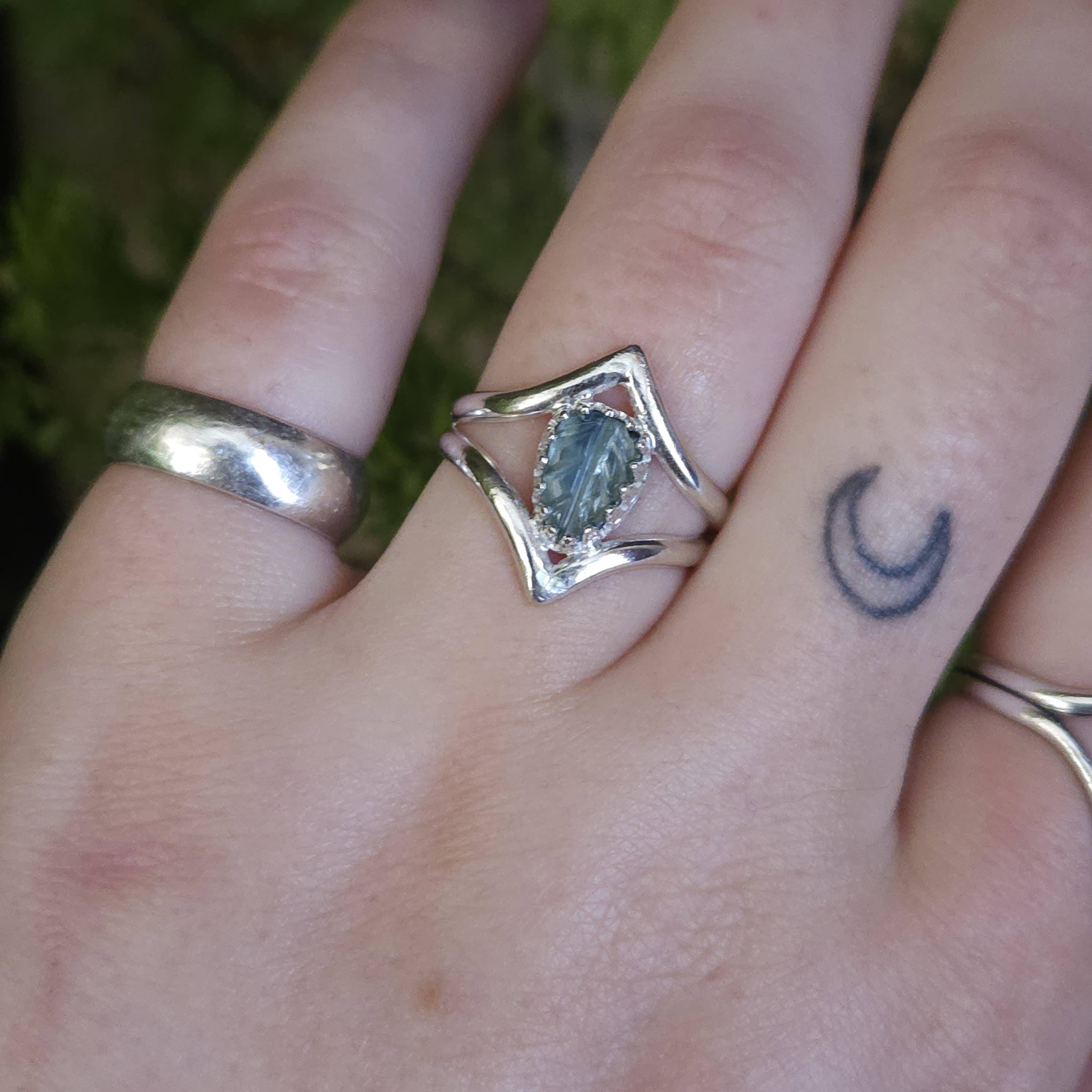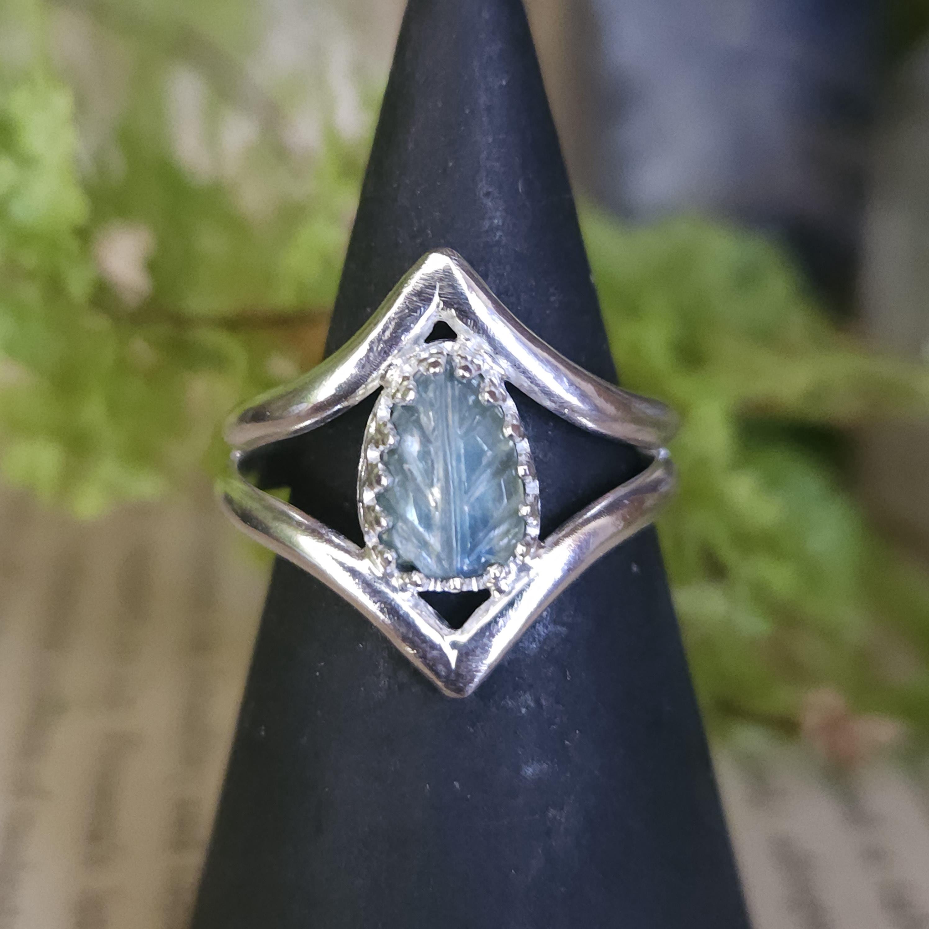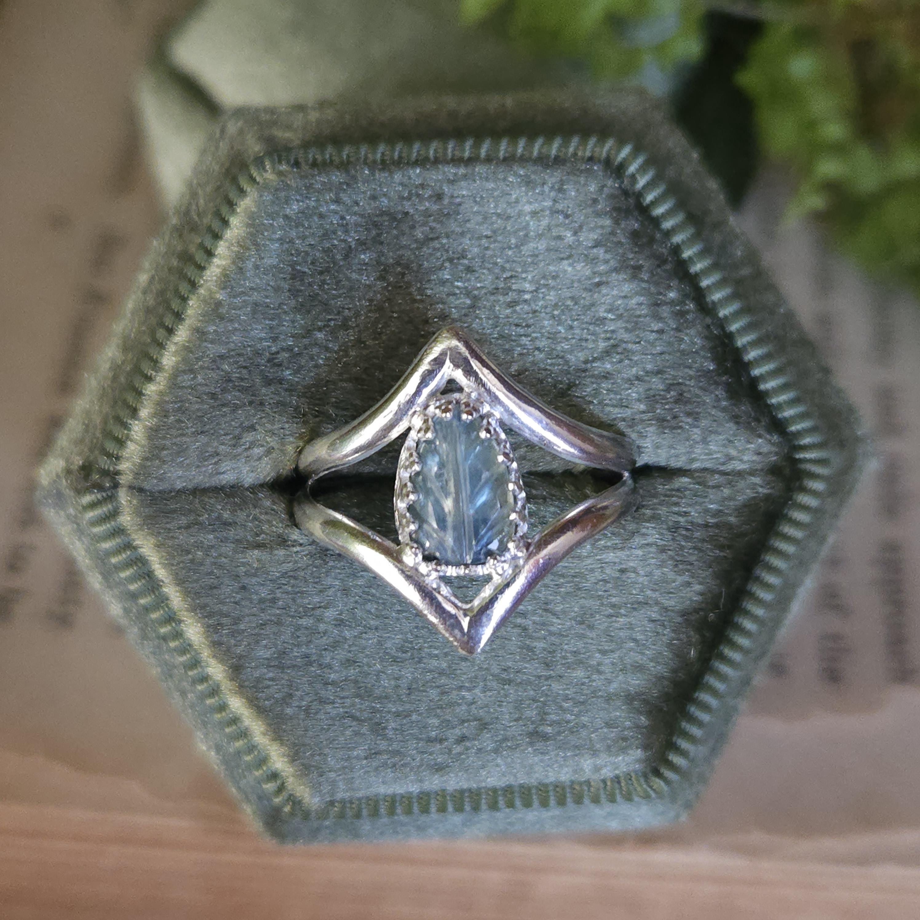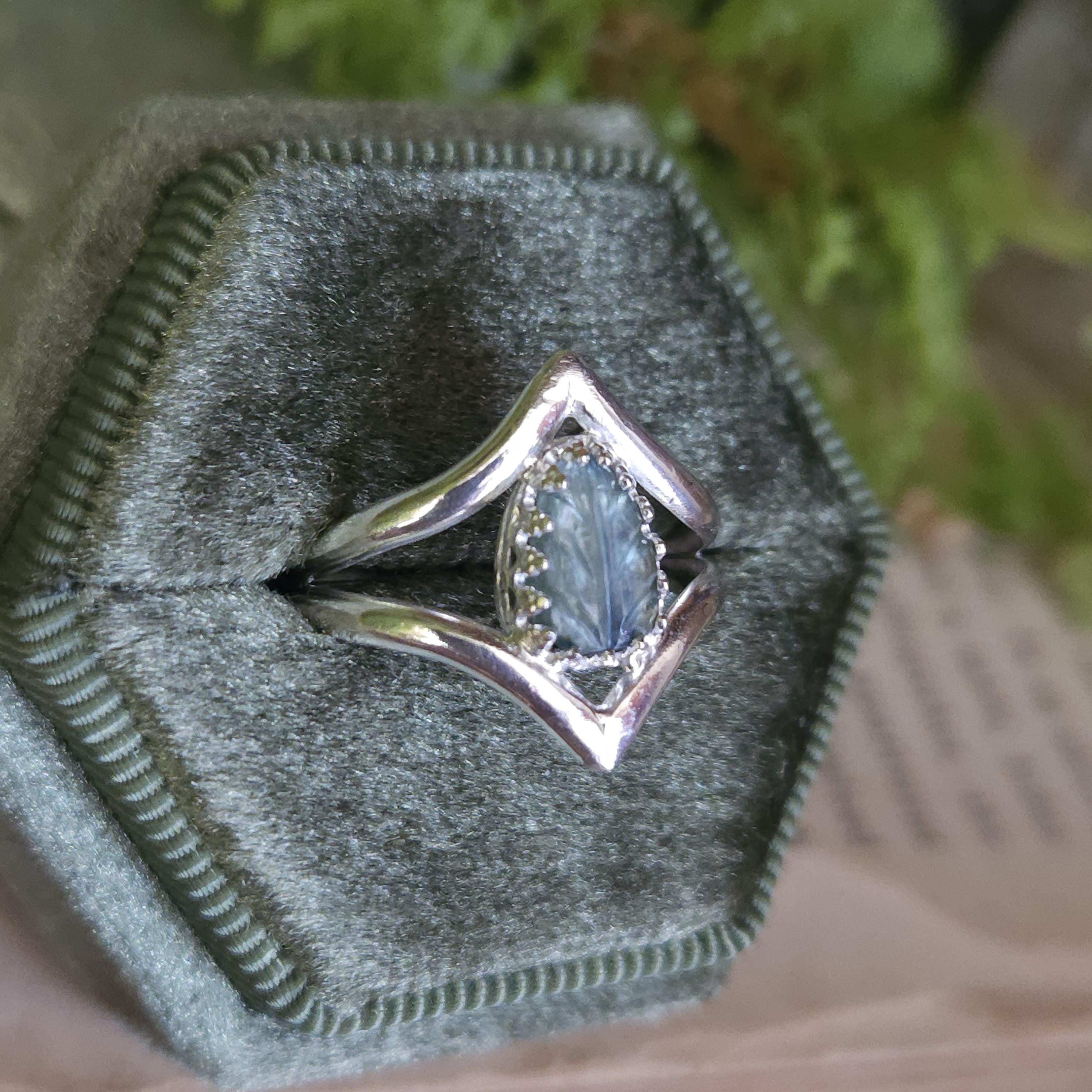 One of a kind handcrafted gemstone ring made using sterling silver and a hand carved mint green kyanite leaf. Kyanite is a relatively soft stone. Please keep this in mind and avoid banging it on any hard surfaces