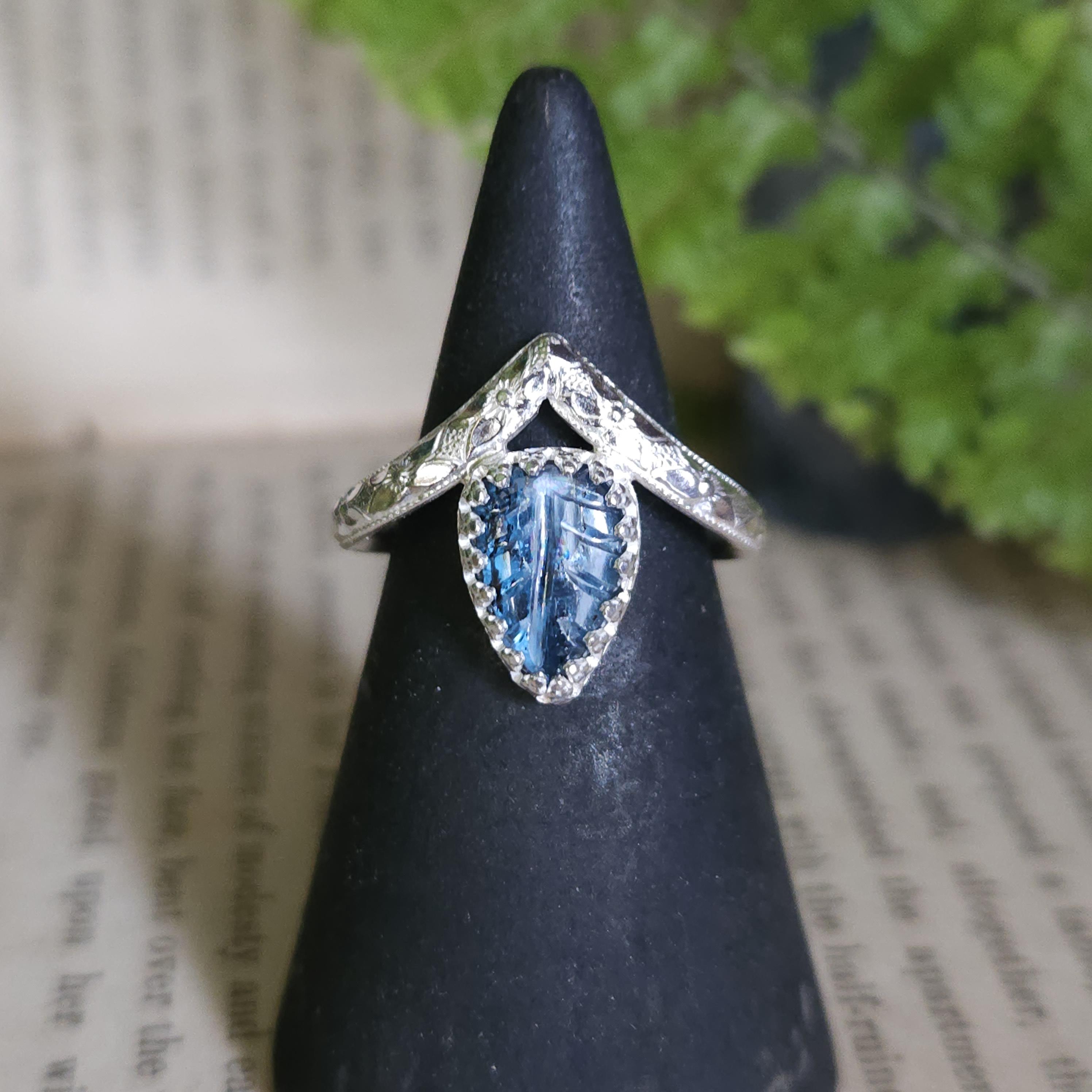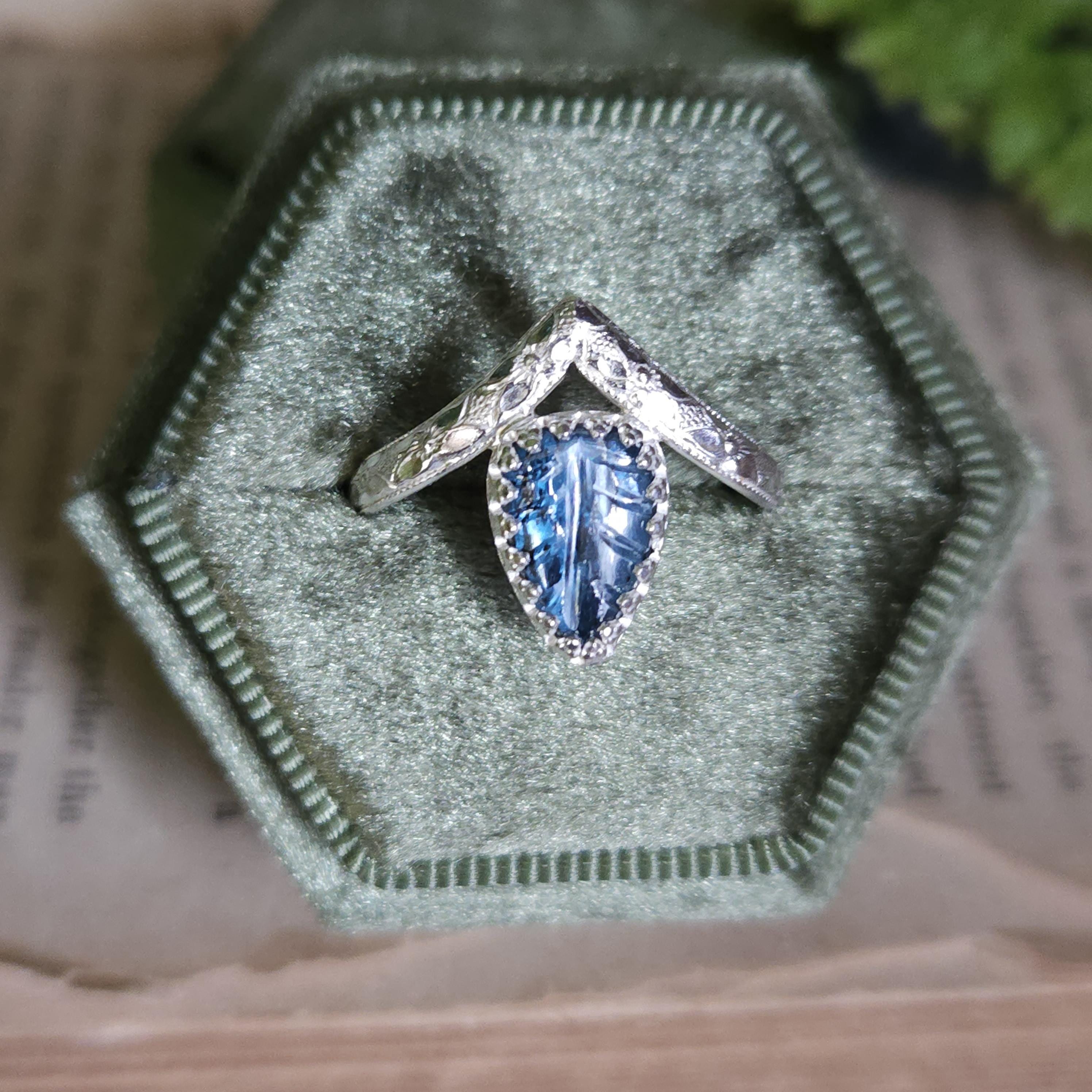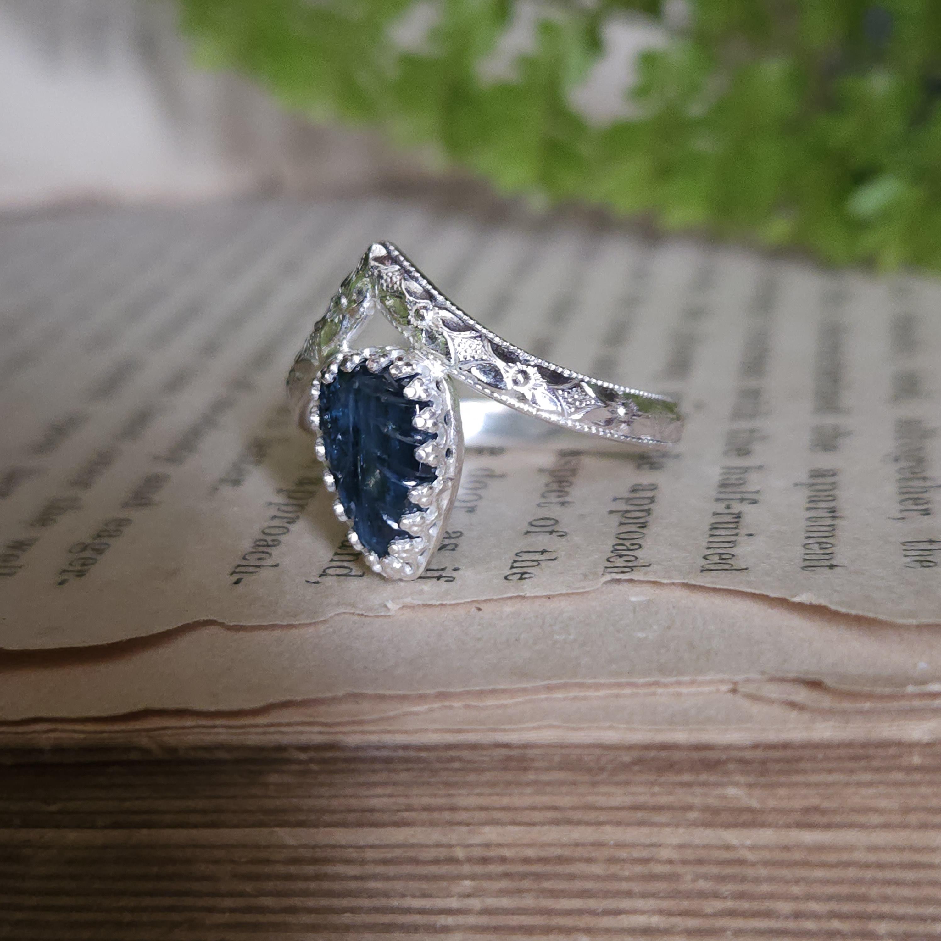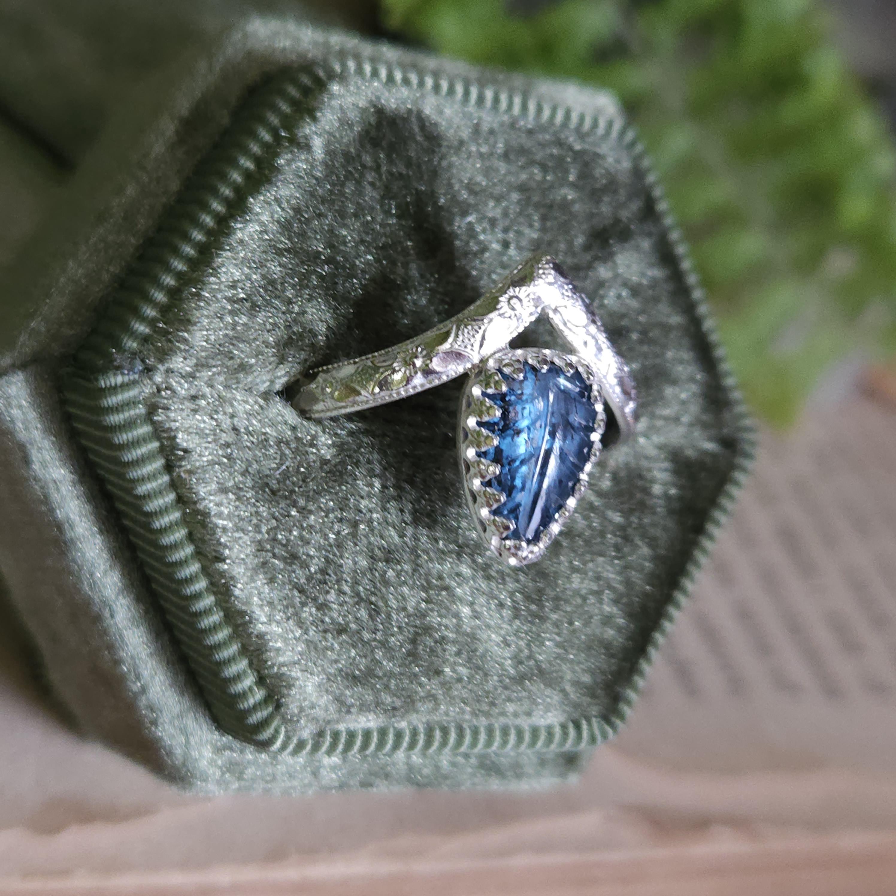 One of a kind handcrafted gemstone ring made using sterling silver and teal blue kyanite. Kyanite is a relatively soft stone. Please keep this in mind and avoid knocking it on hard surfaces.
