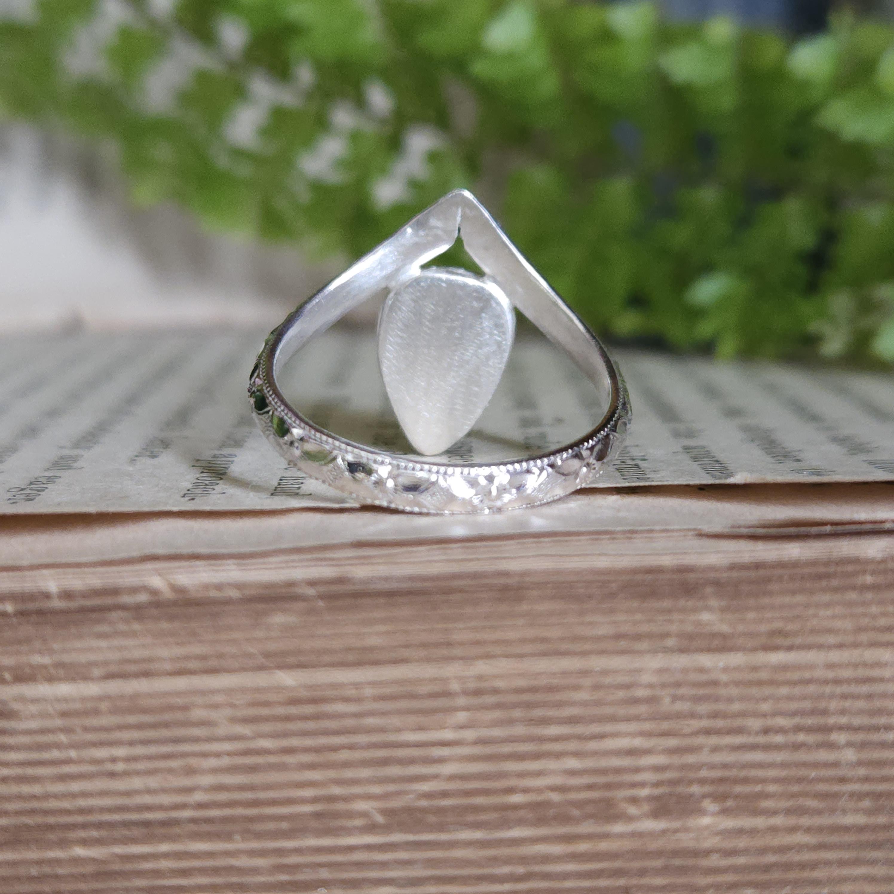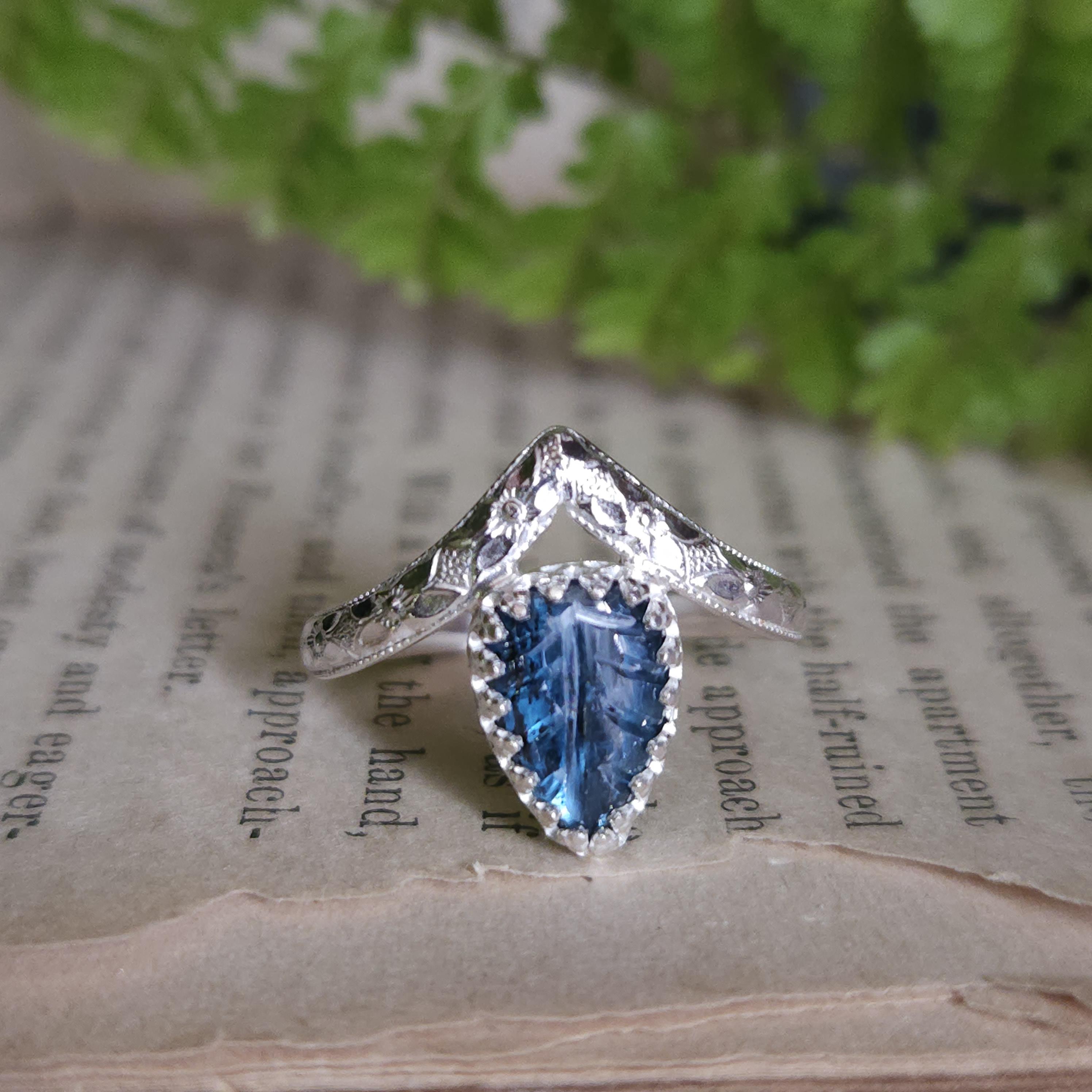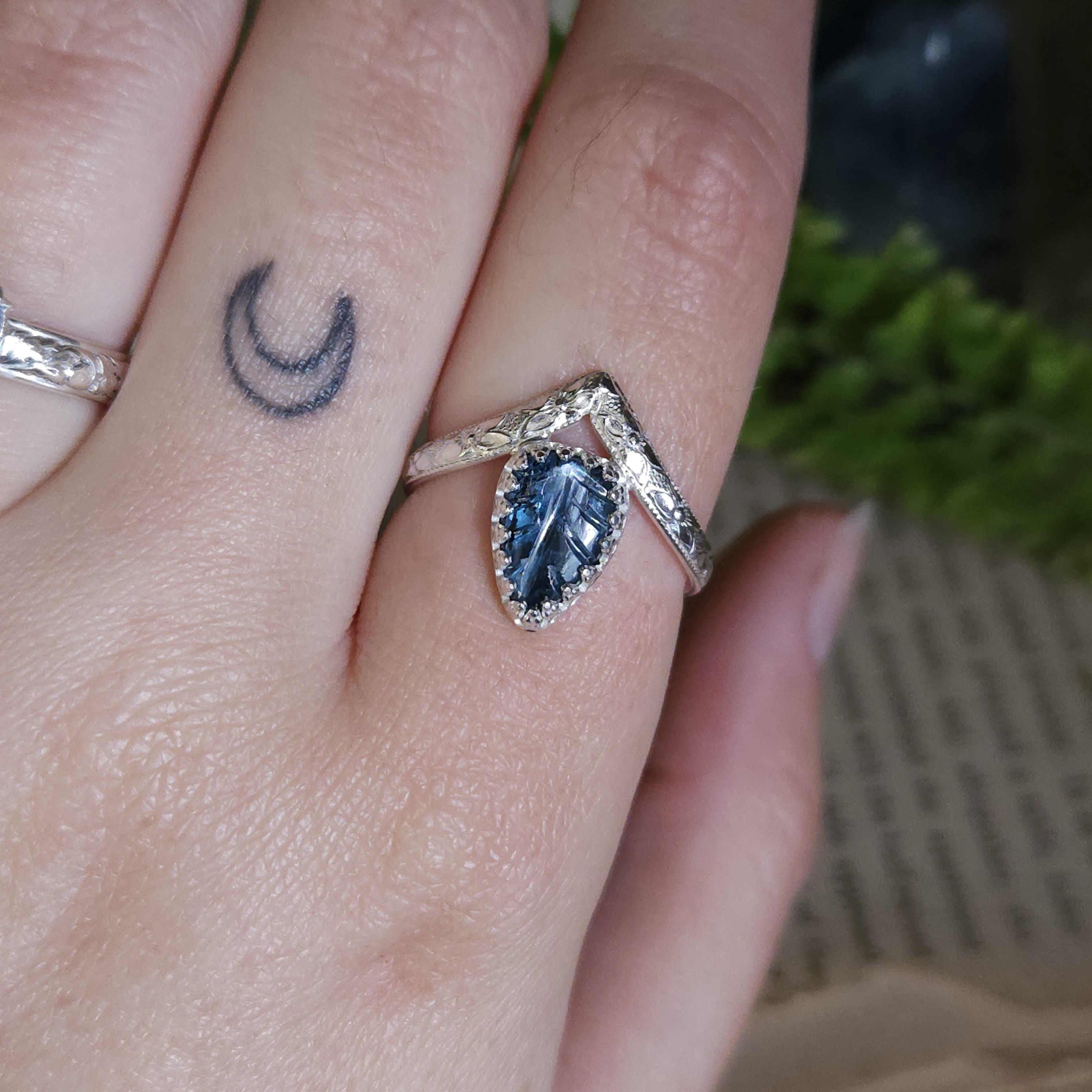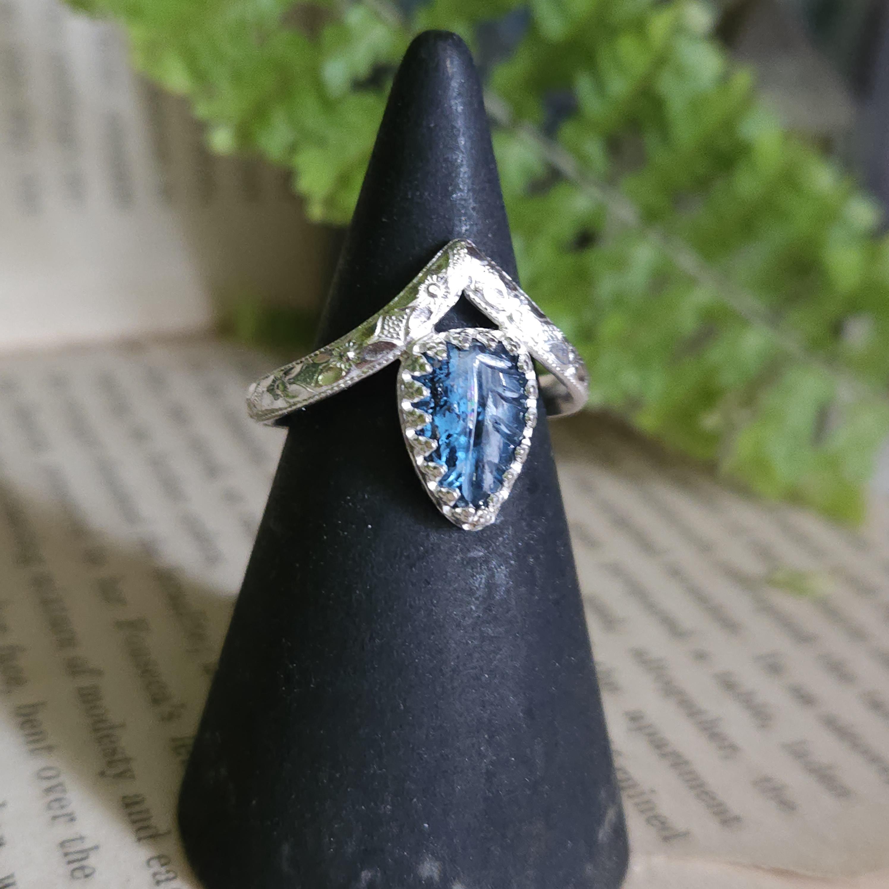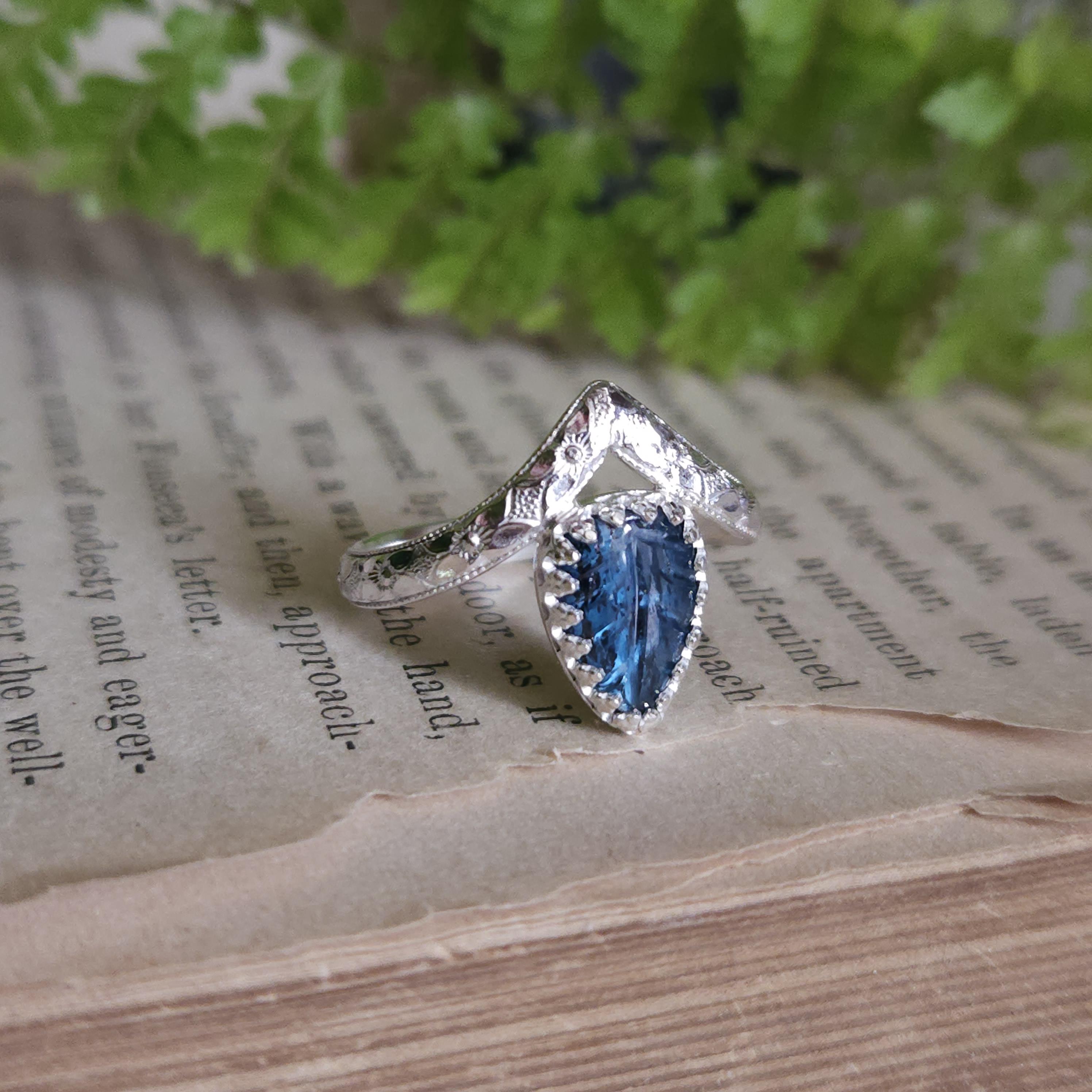 One of a kind handcrafted gemstone ring made using sterling silver and teal blue kyanite. Kyanite is a relatively soft stone. Please keep this in mind and avoid knocking it on hard surfaces.