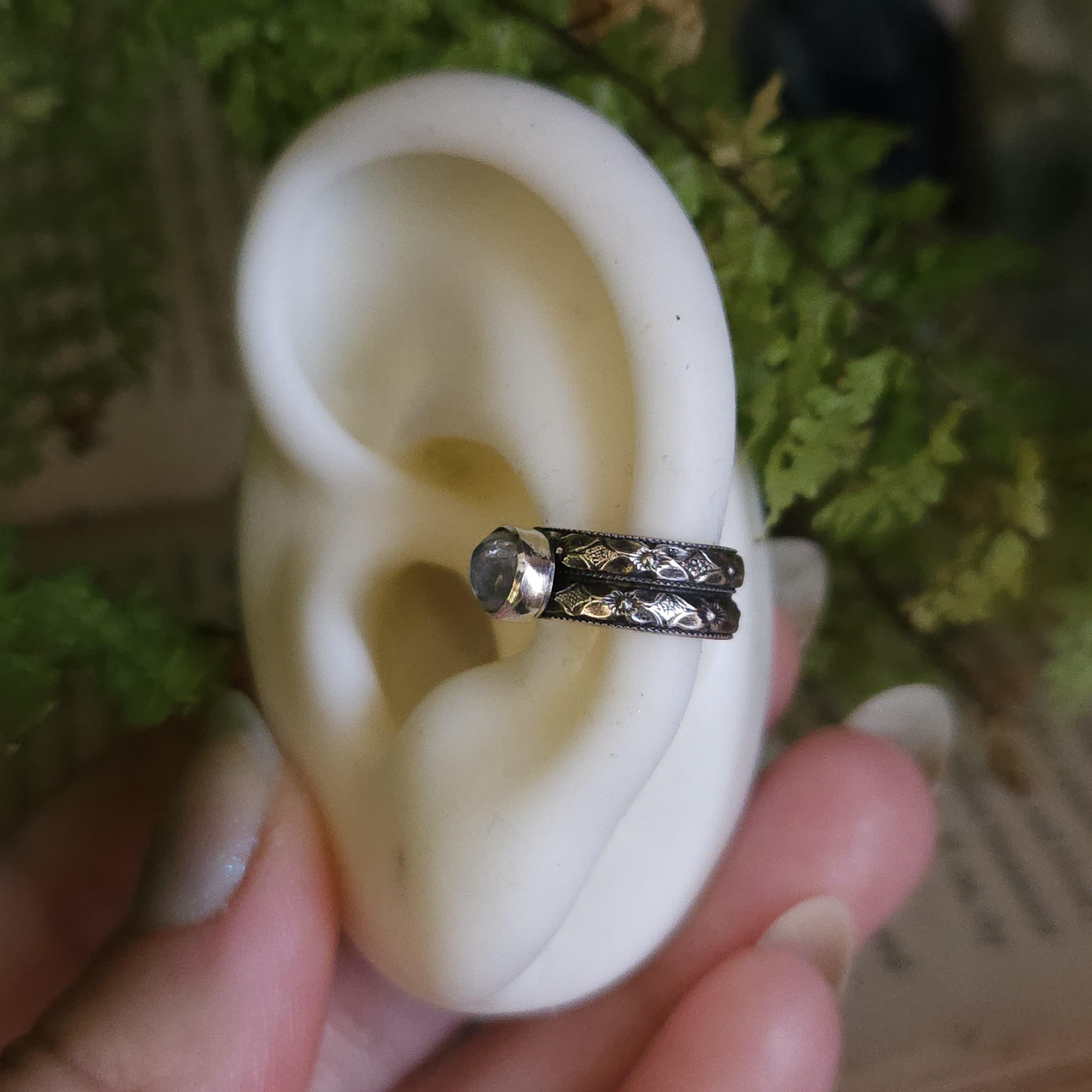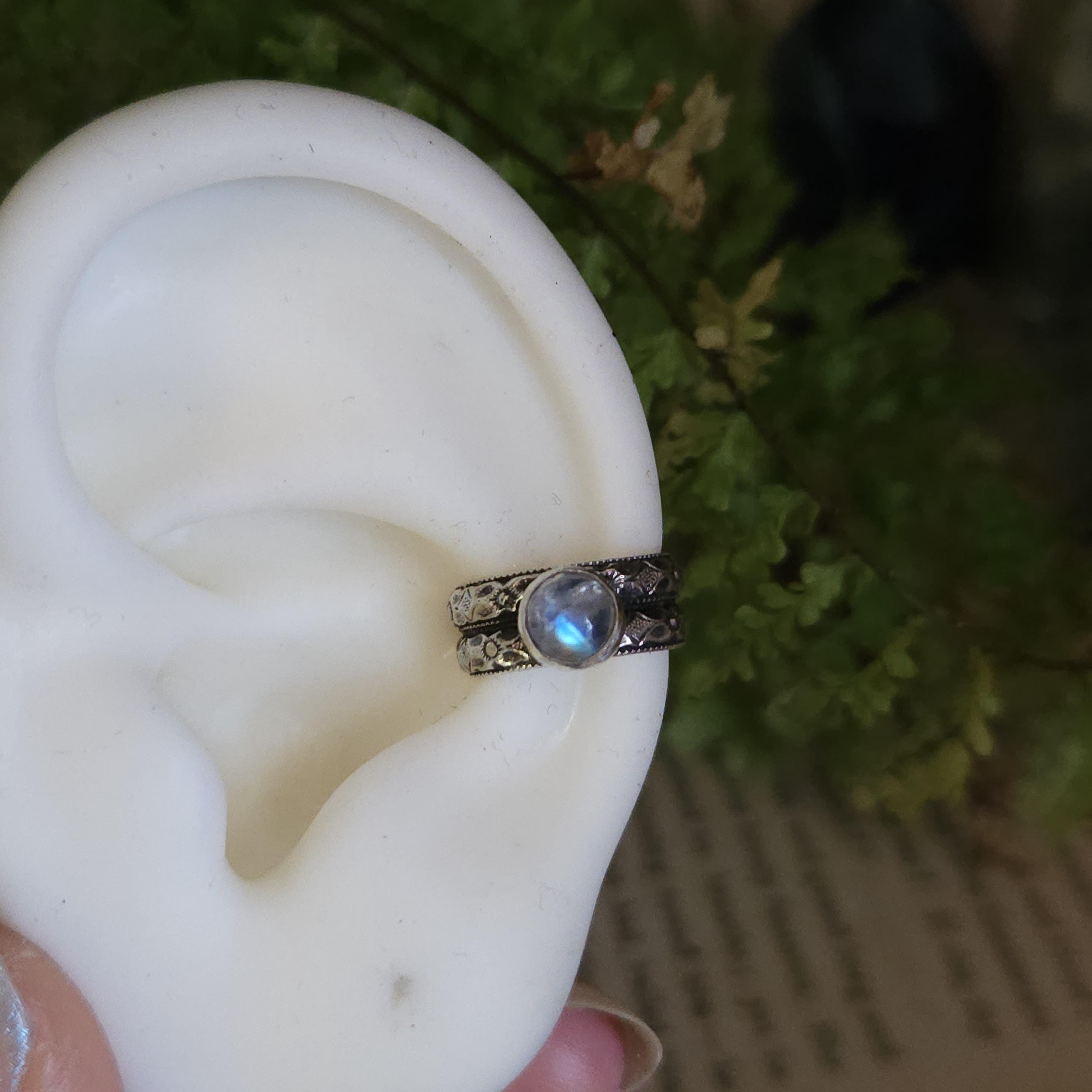 Artisan handcrafted floral ear cuff made with sterling silver and rainbow moonstone