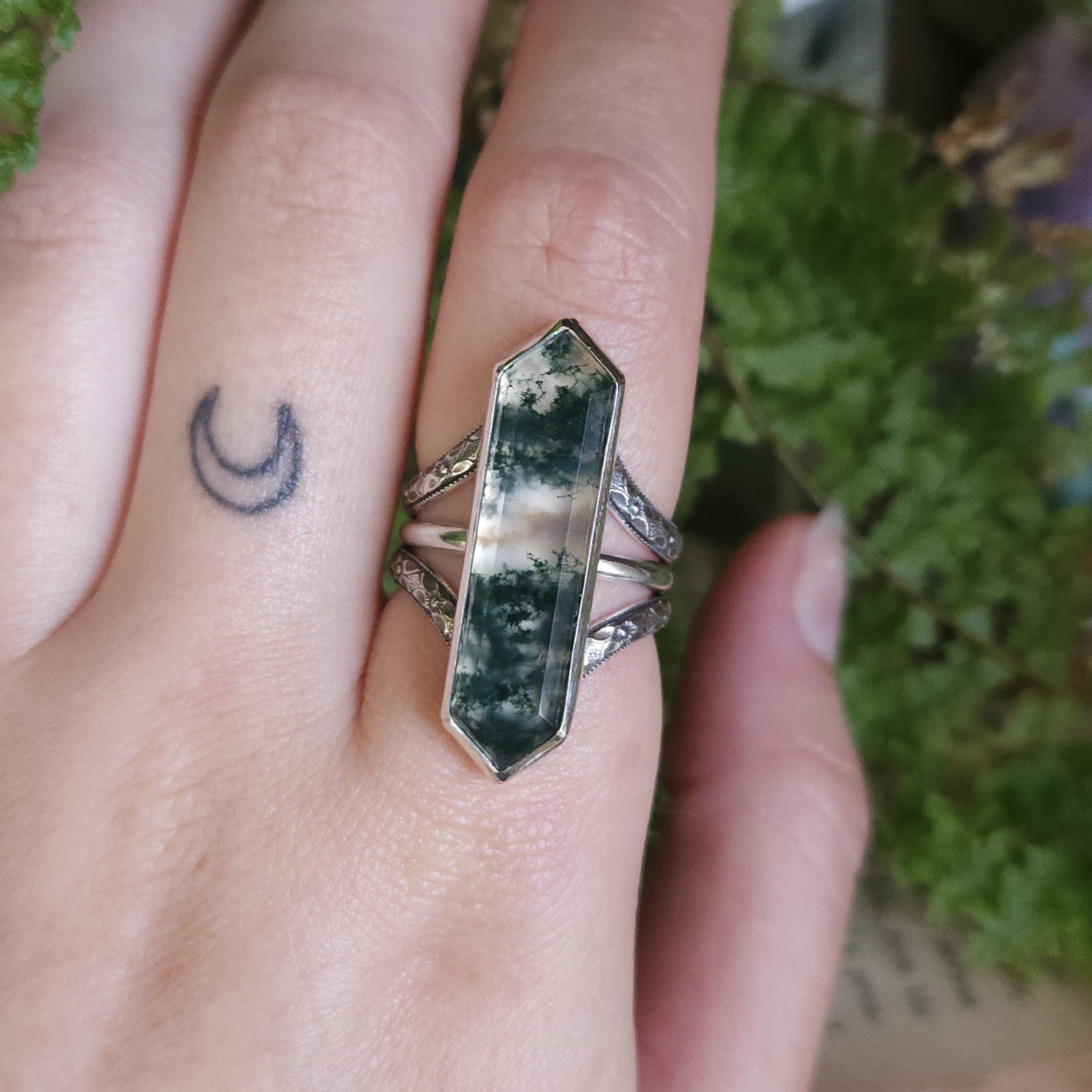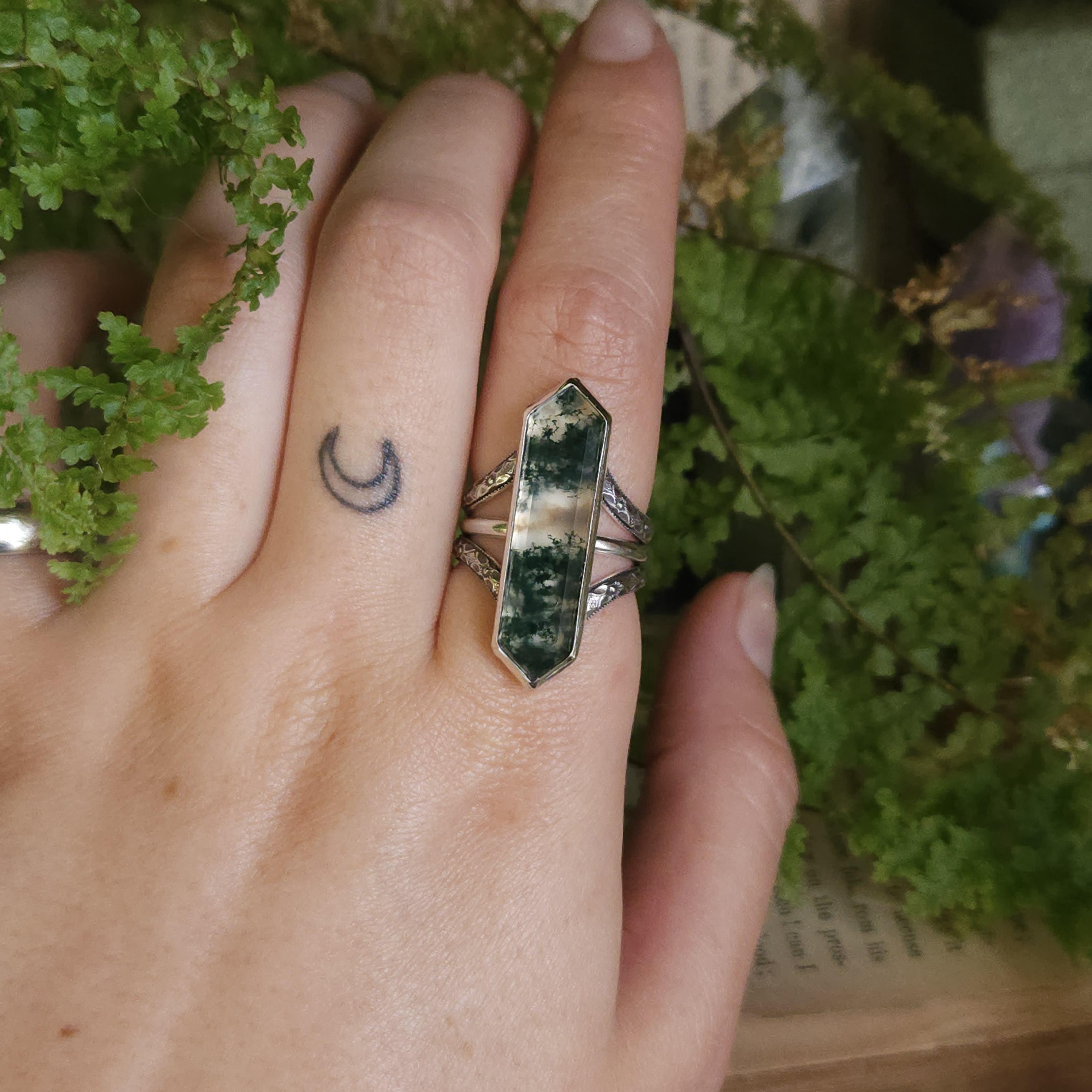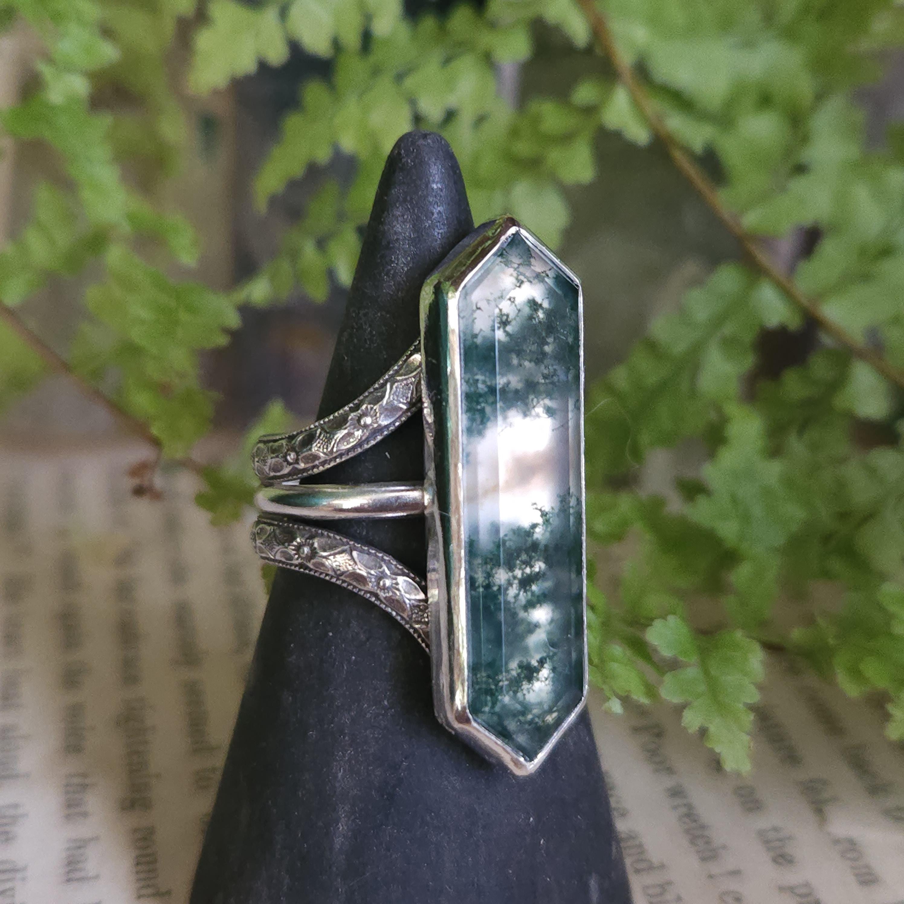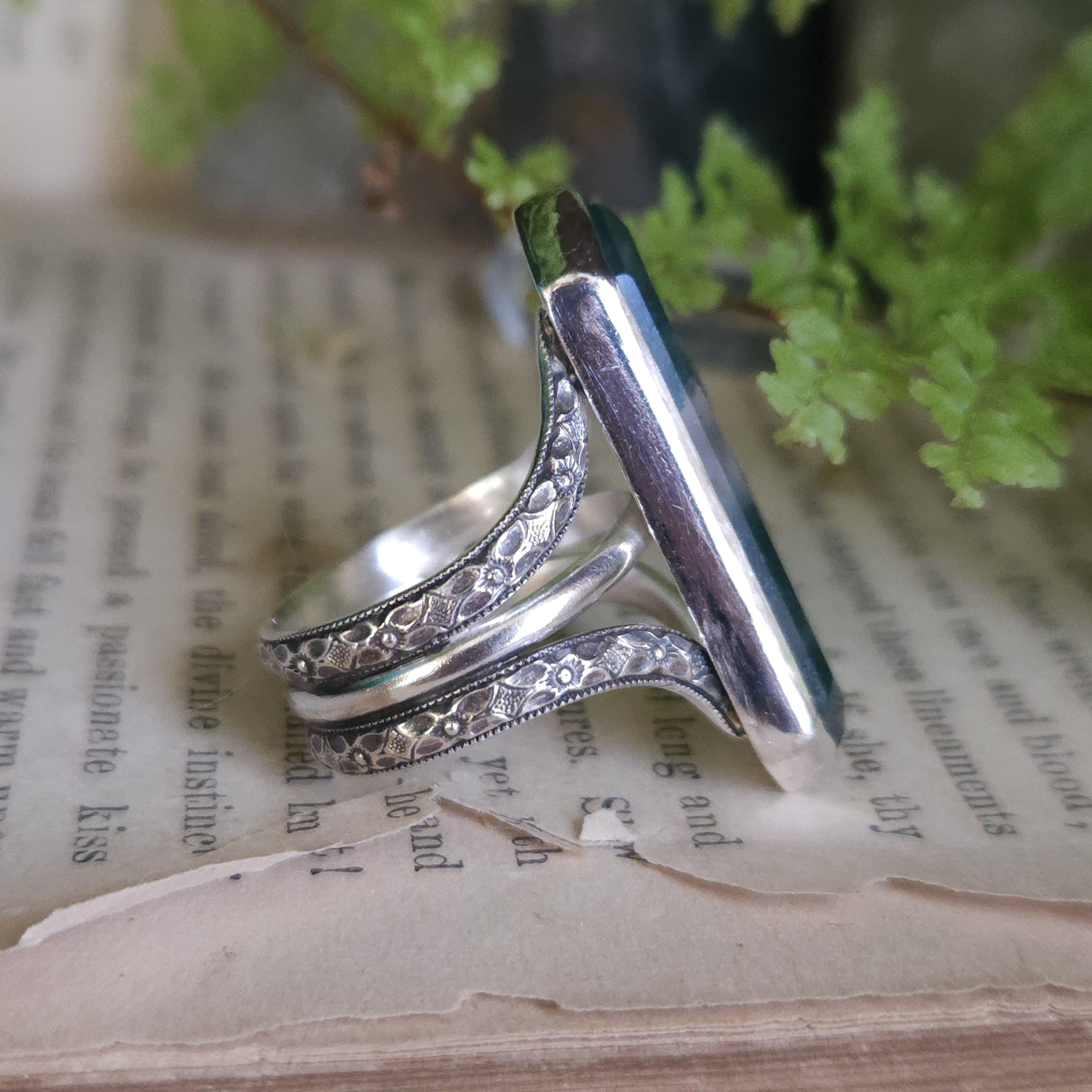 One of a kind handcrafted gemstone ring made using sterling silver and moss agate