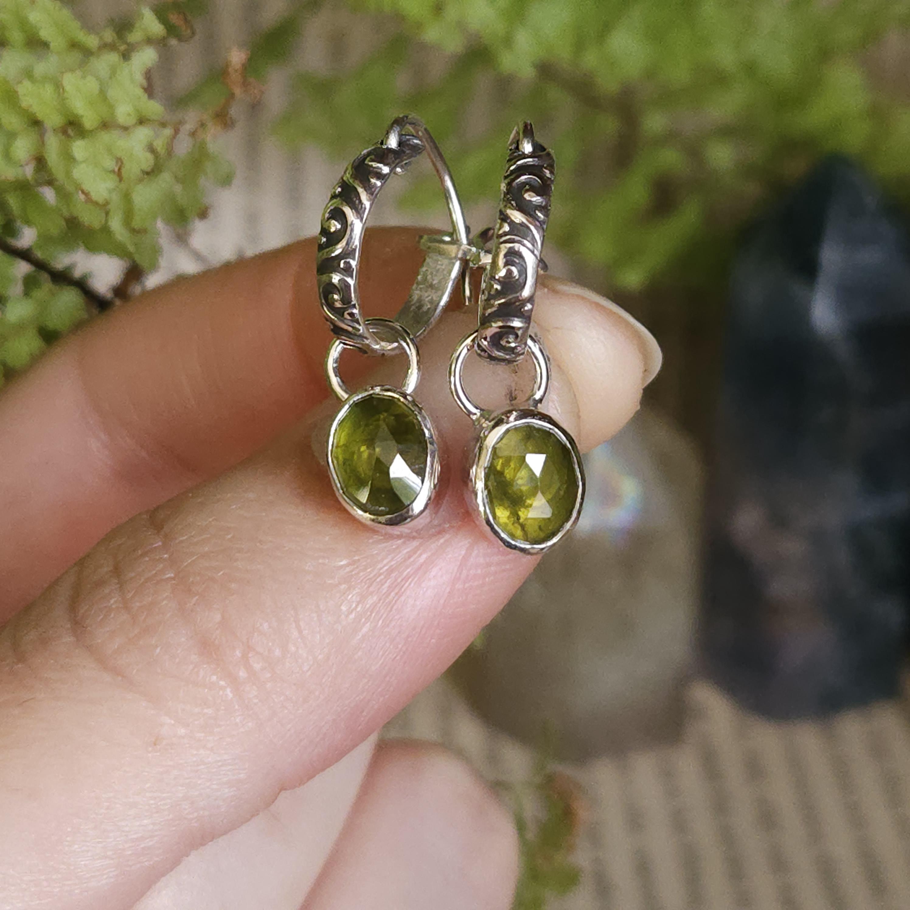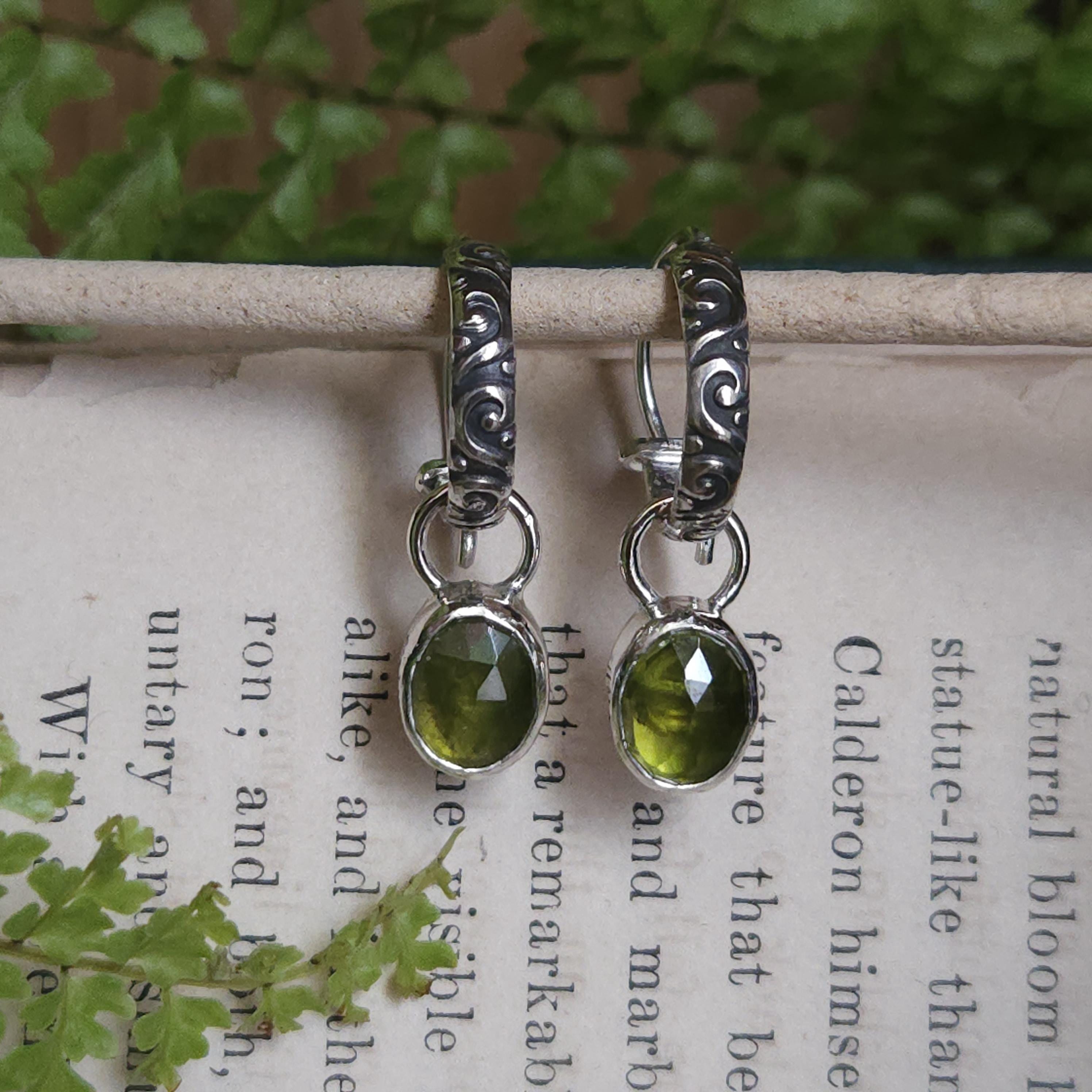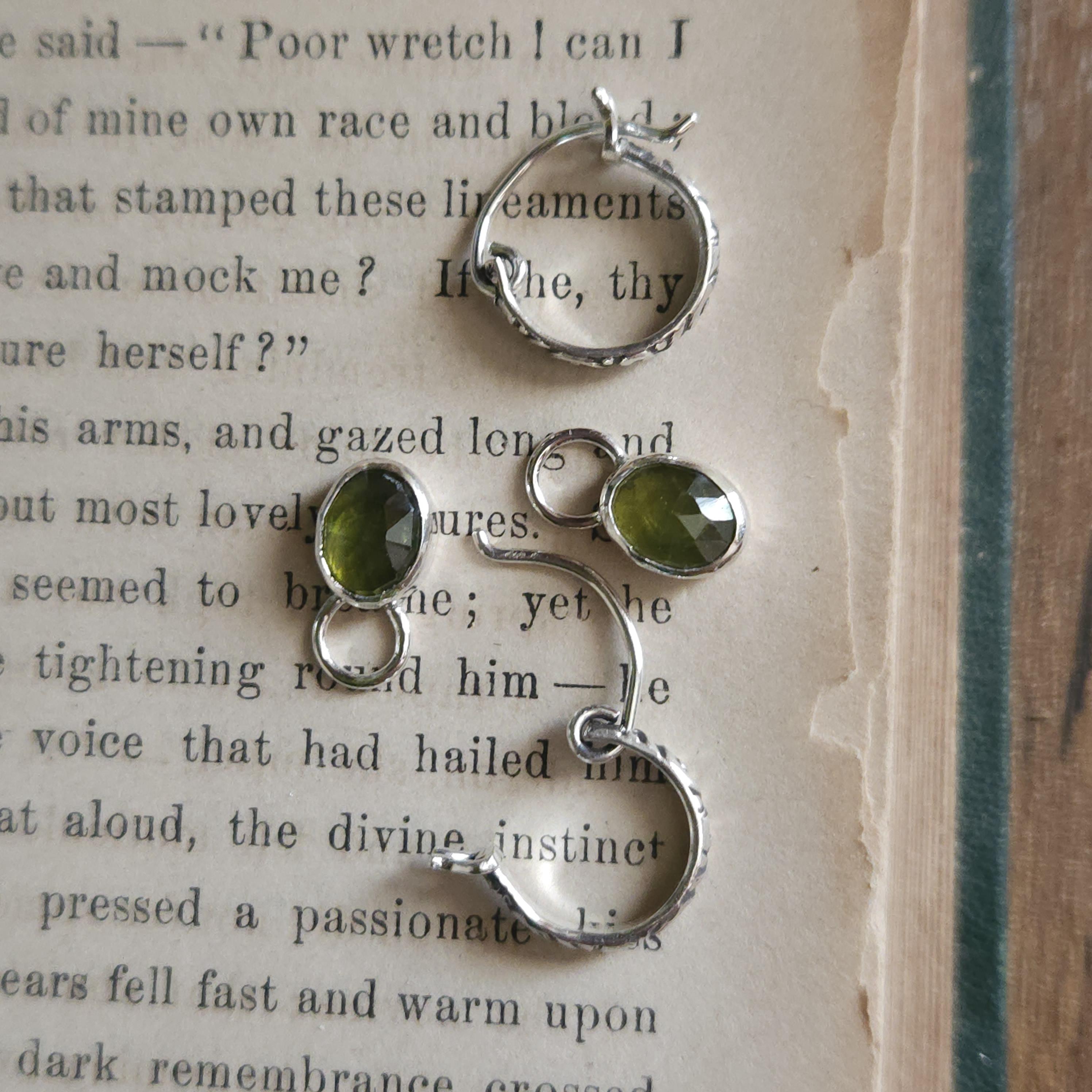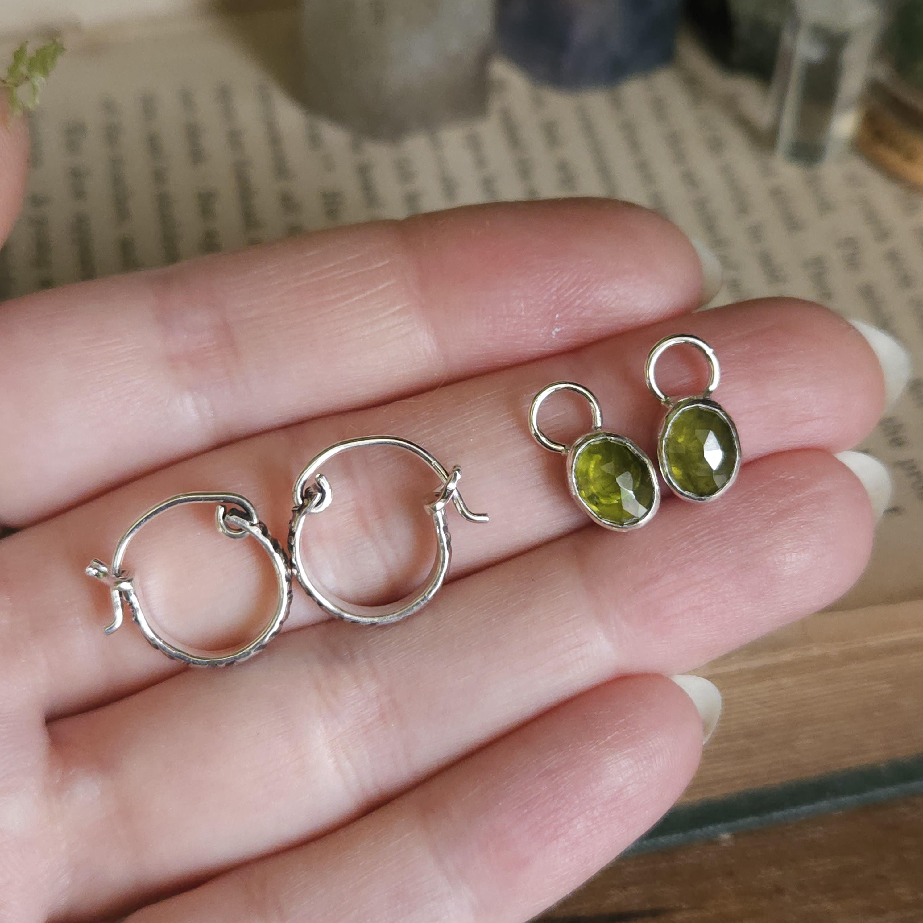 Made using sterling silver and vesuvianite/idocrase. The charms are unattached, so you can take them off and wear just the hoops if you'd like.