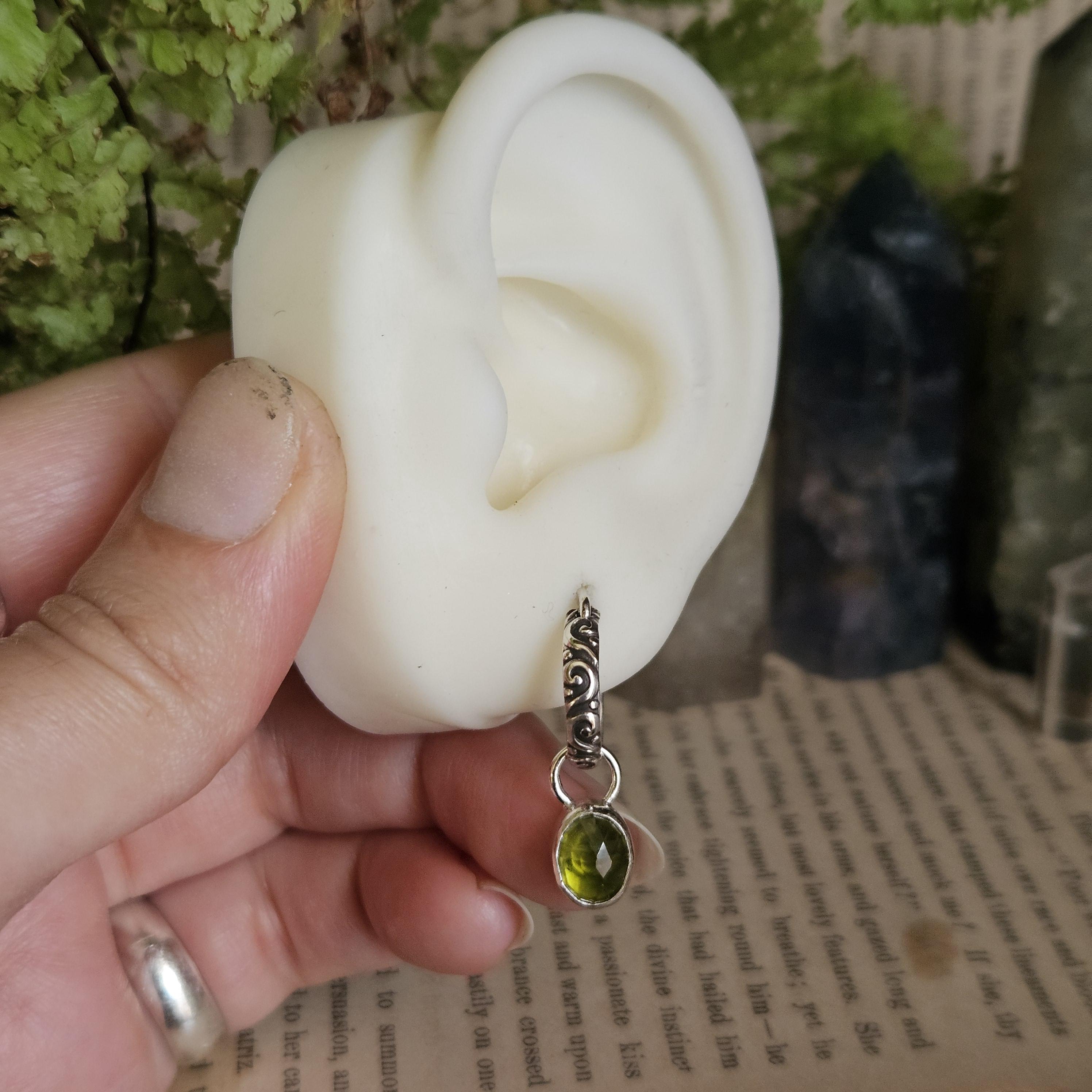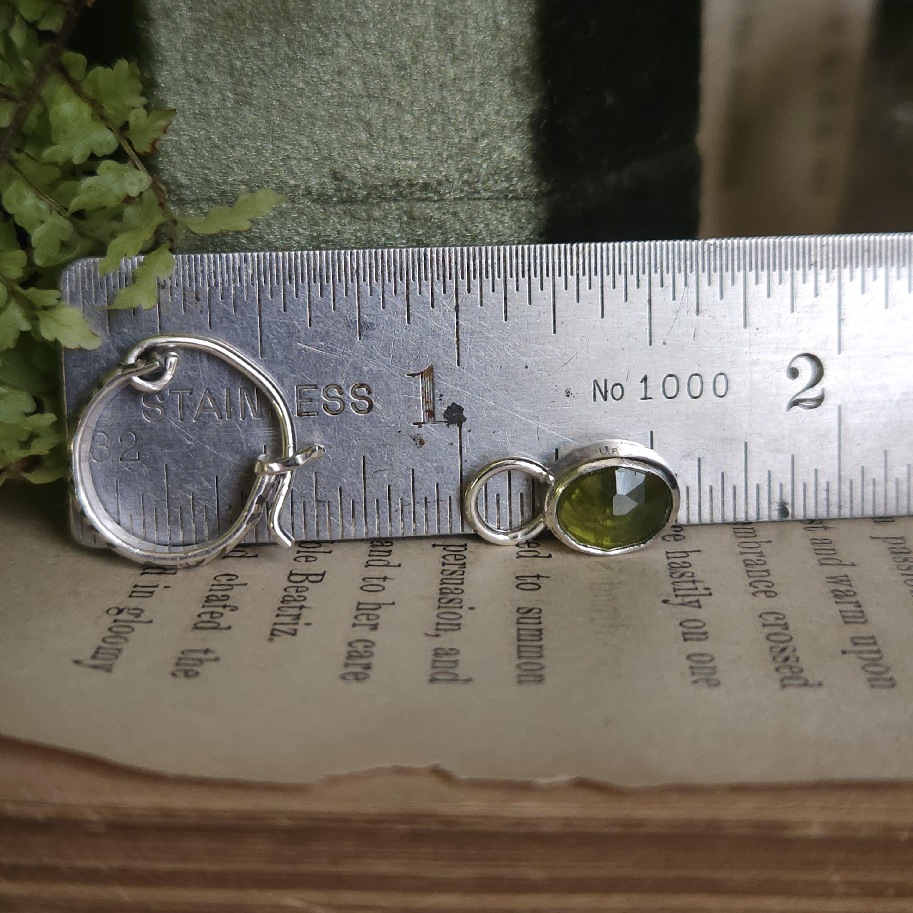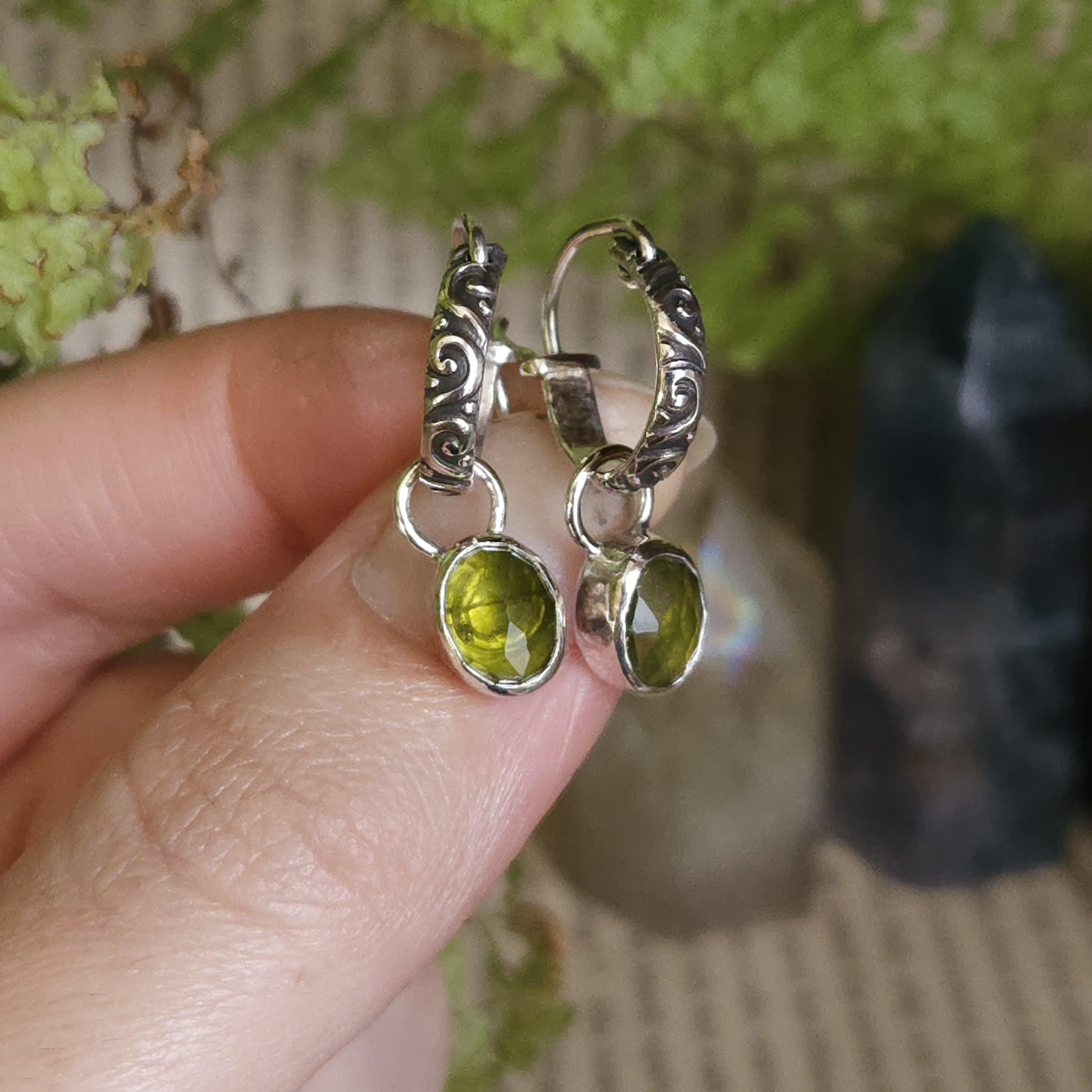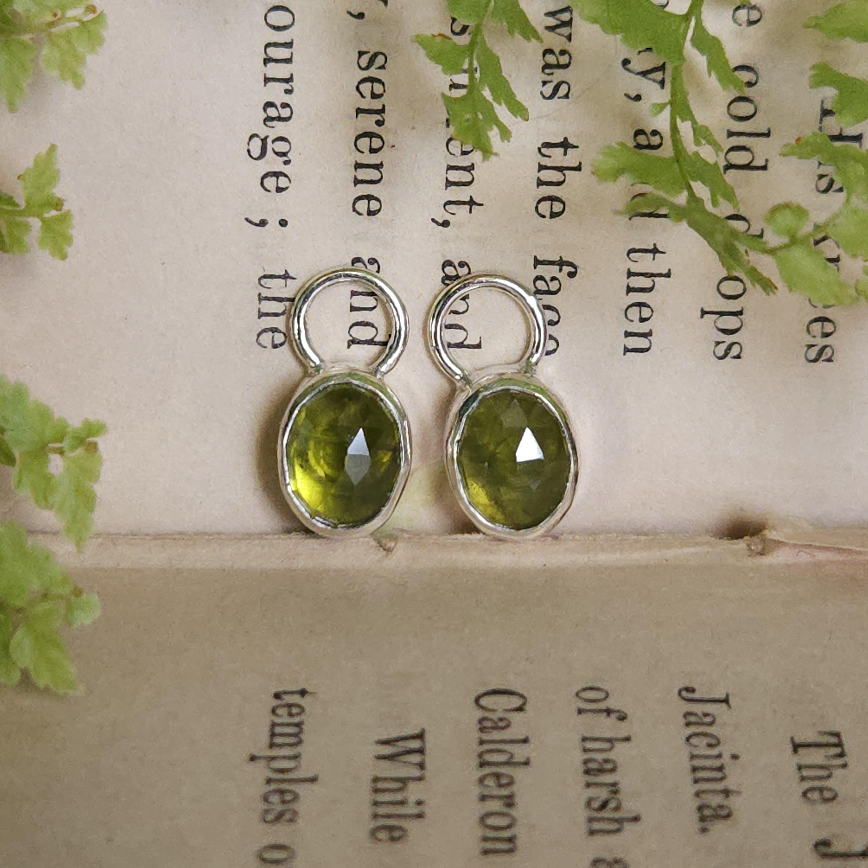Made using sterling silver and vesuvianite/idocrase. The charms are unattached, so you can take them off and wear just the hoops if you'd like.