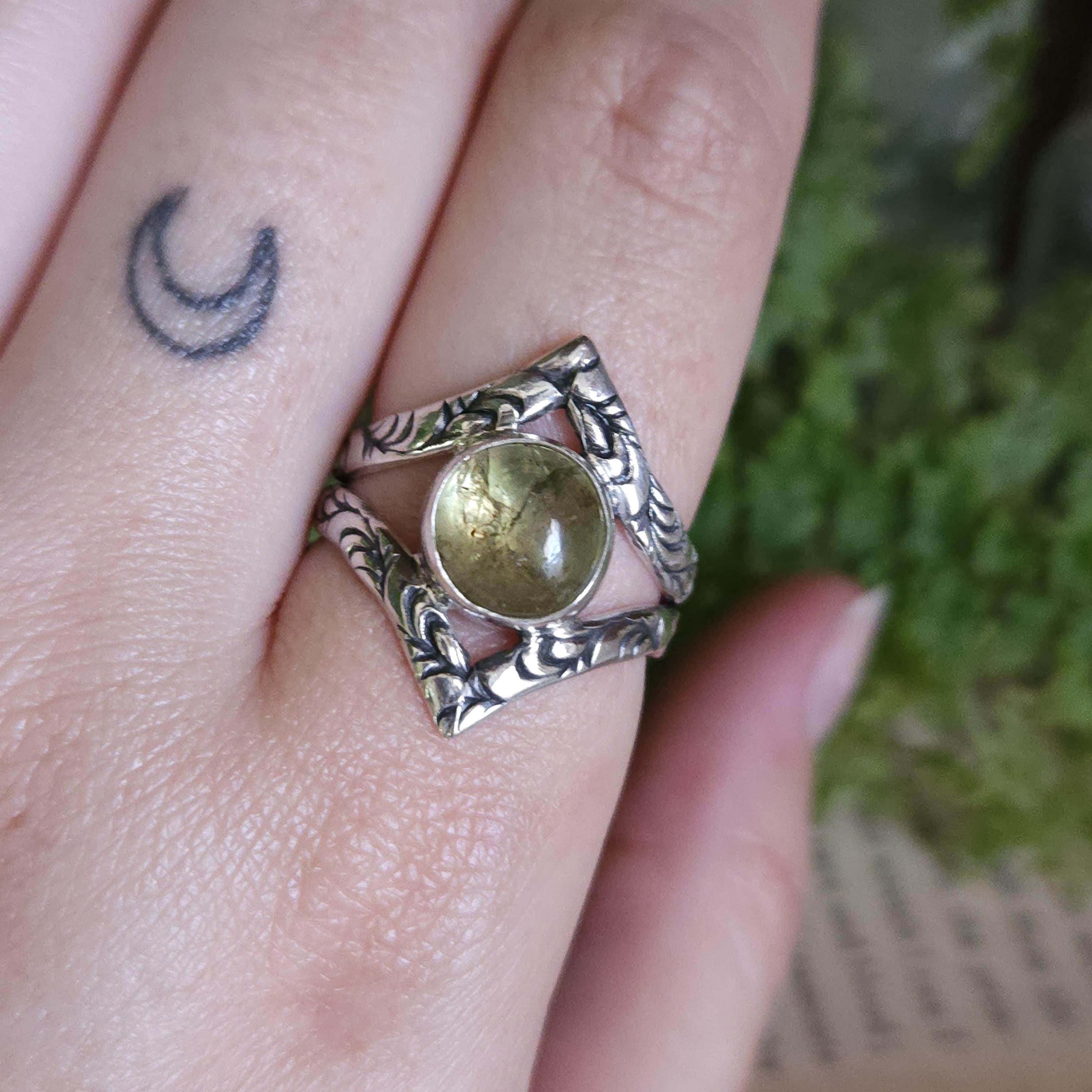 One of a kind handcrafted gemstone ring made using sterling silver and green apatite. The stone is slightly wiggly in its setting, but don't worry! It's not going anywhere (: