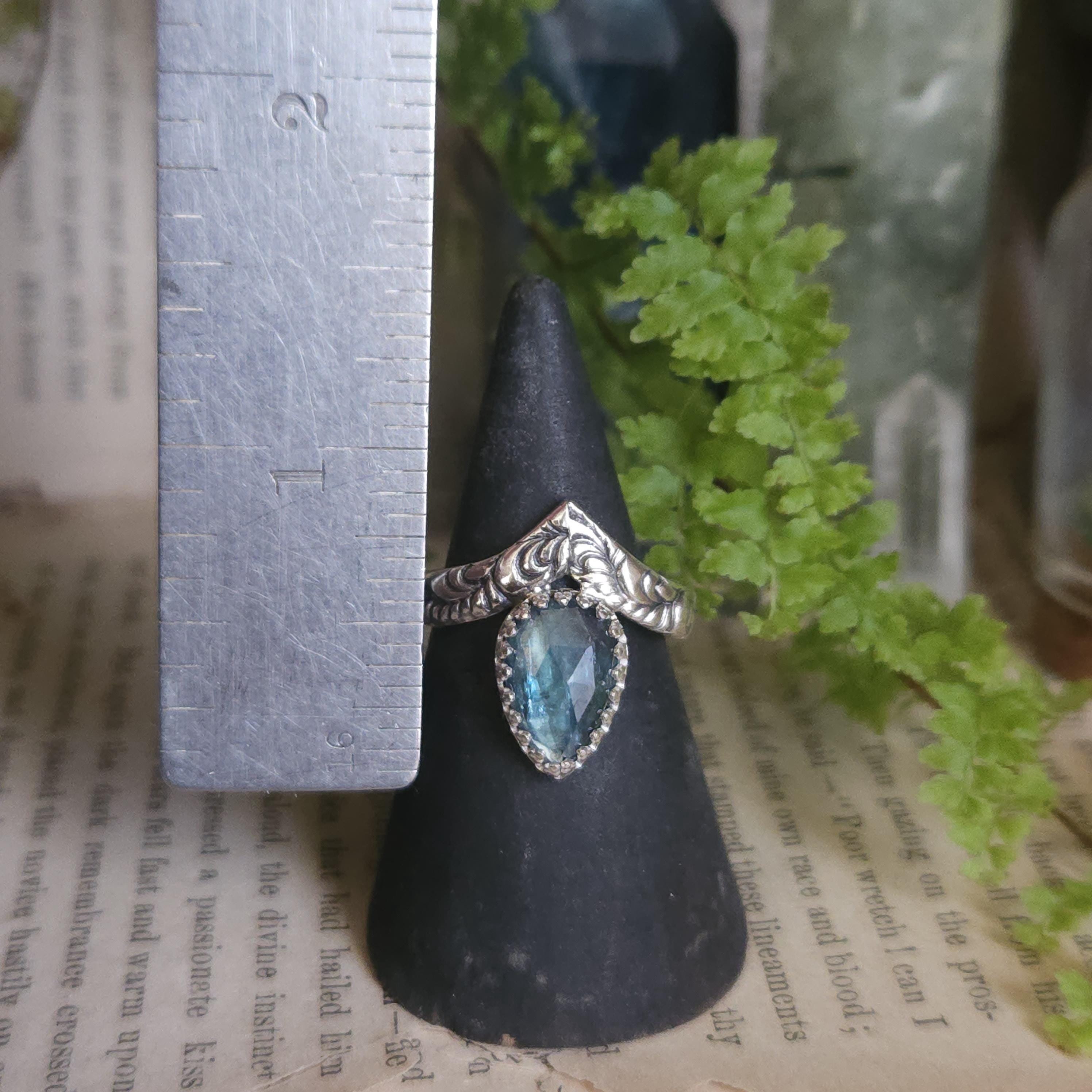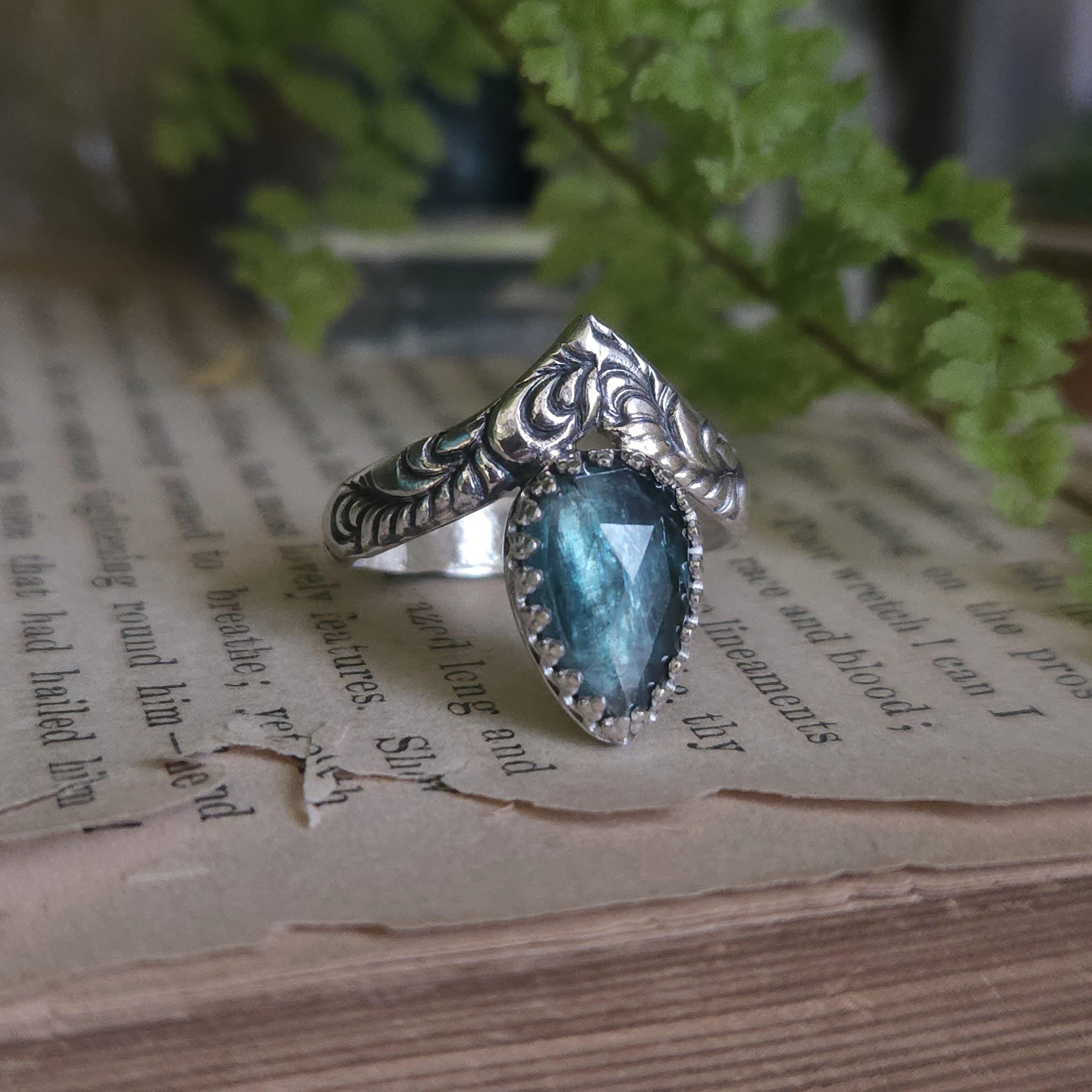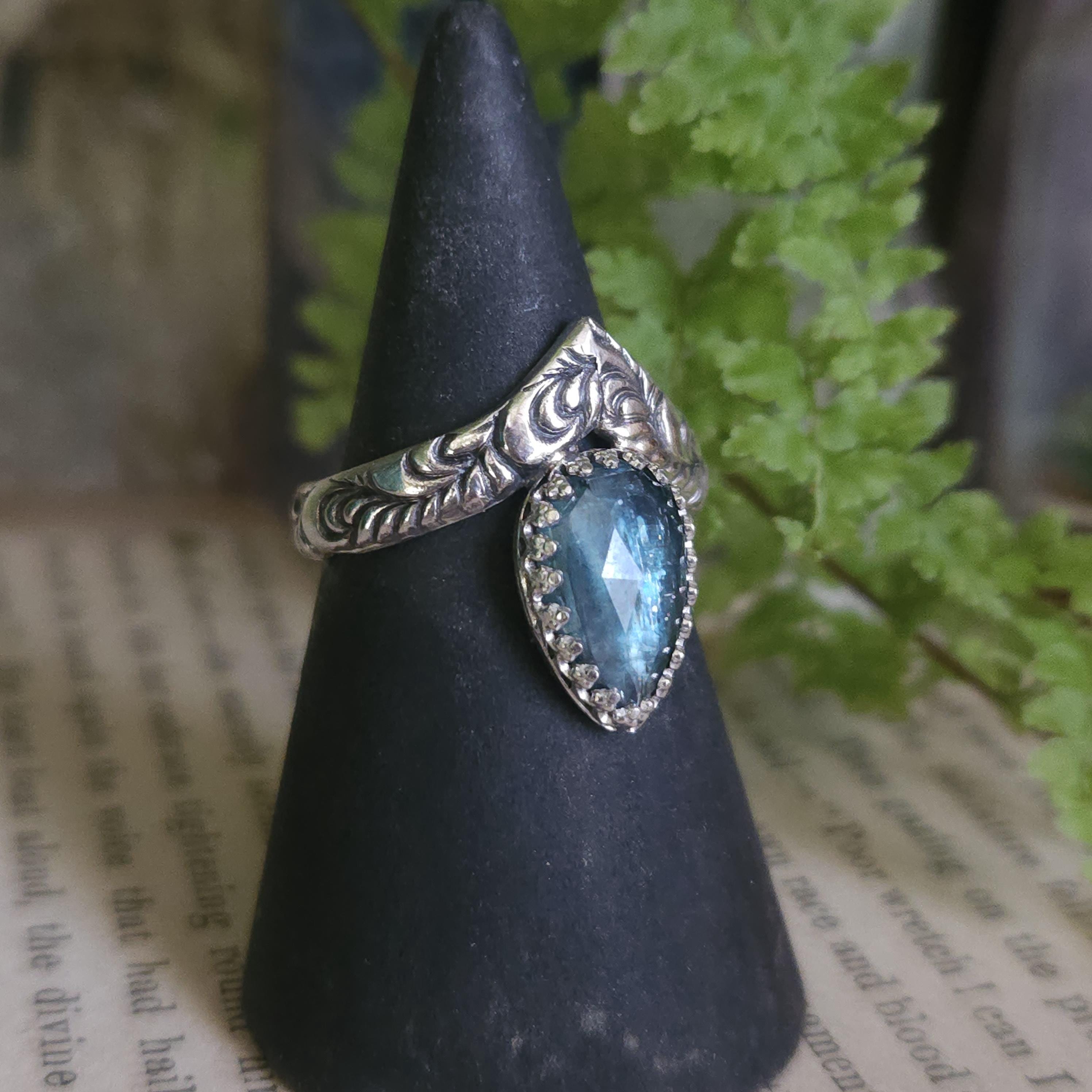 One of a kind handcrafted gemstone ring made using sterling silver and kyanite. Please keep in mind that kyanite is a relatively soft stone and avoid knocking it on anything hard.