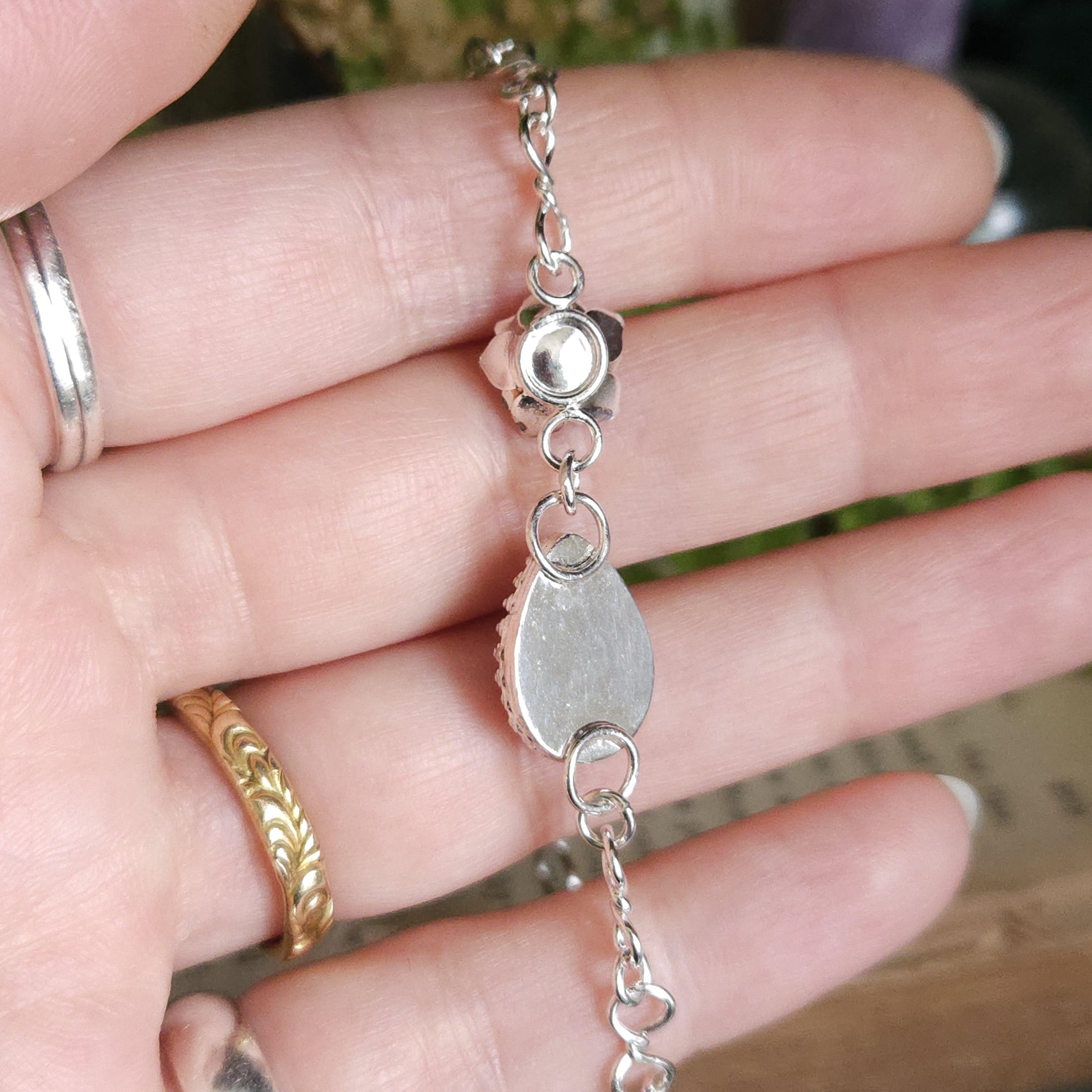 Silver care: regularly wipe your jewelry with a jewelry polishing cloth. Store in a cool and dry place, preferably in sealed bags. Take off before showering, swimming, sweating, or engaging in any strenuous physical activities where the pieces can be banged around. The harsh chemicals in soaps, pools, and even your sweat can damage the metal and cause it to tarnish or become brittle.
