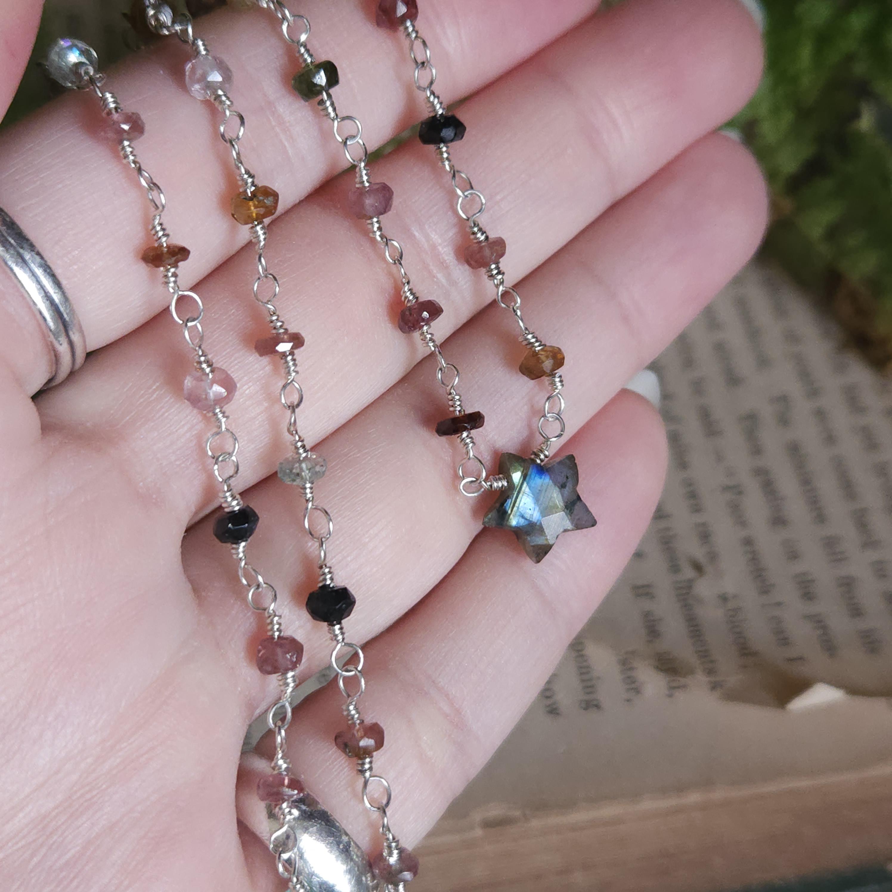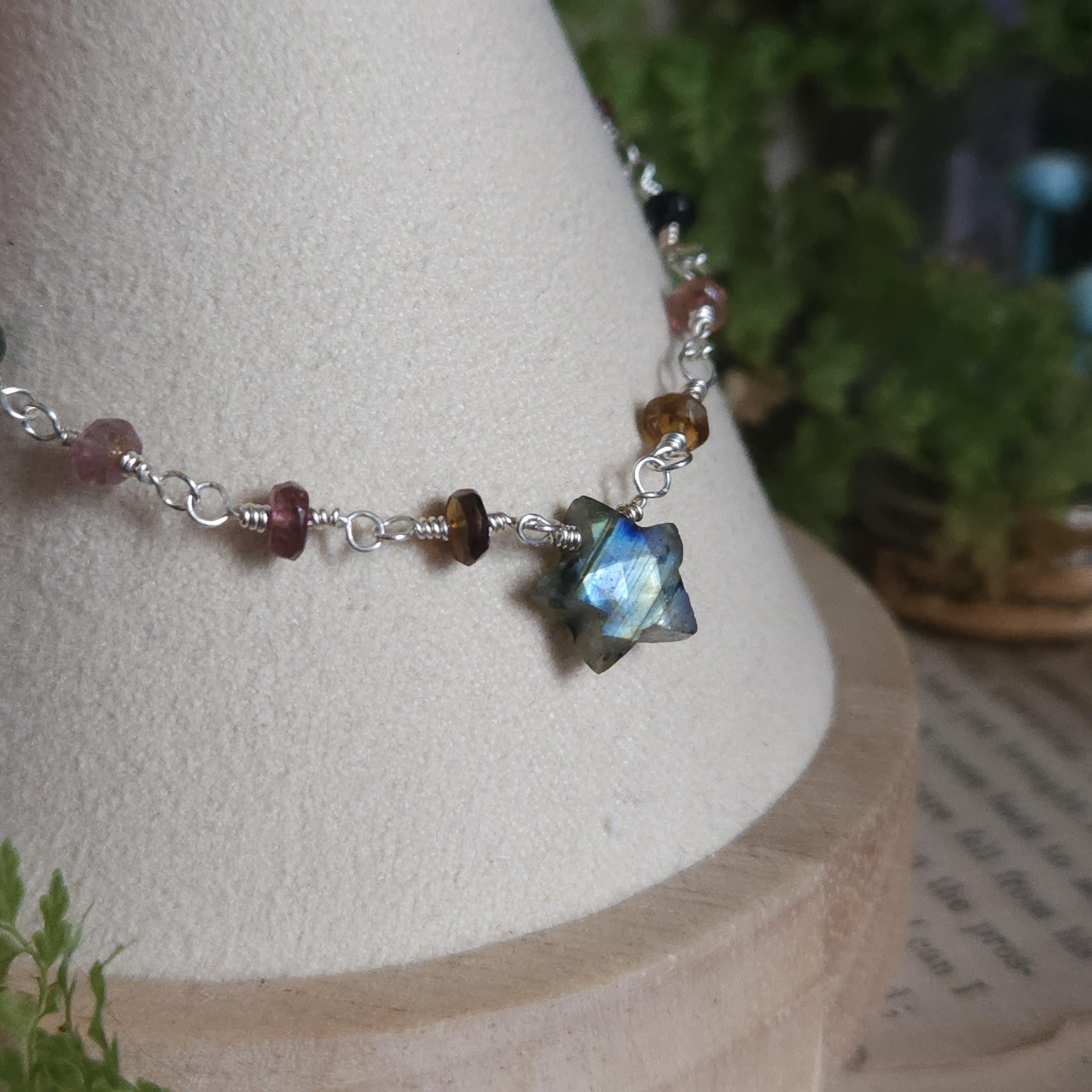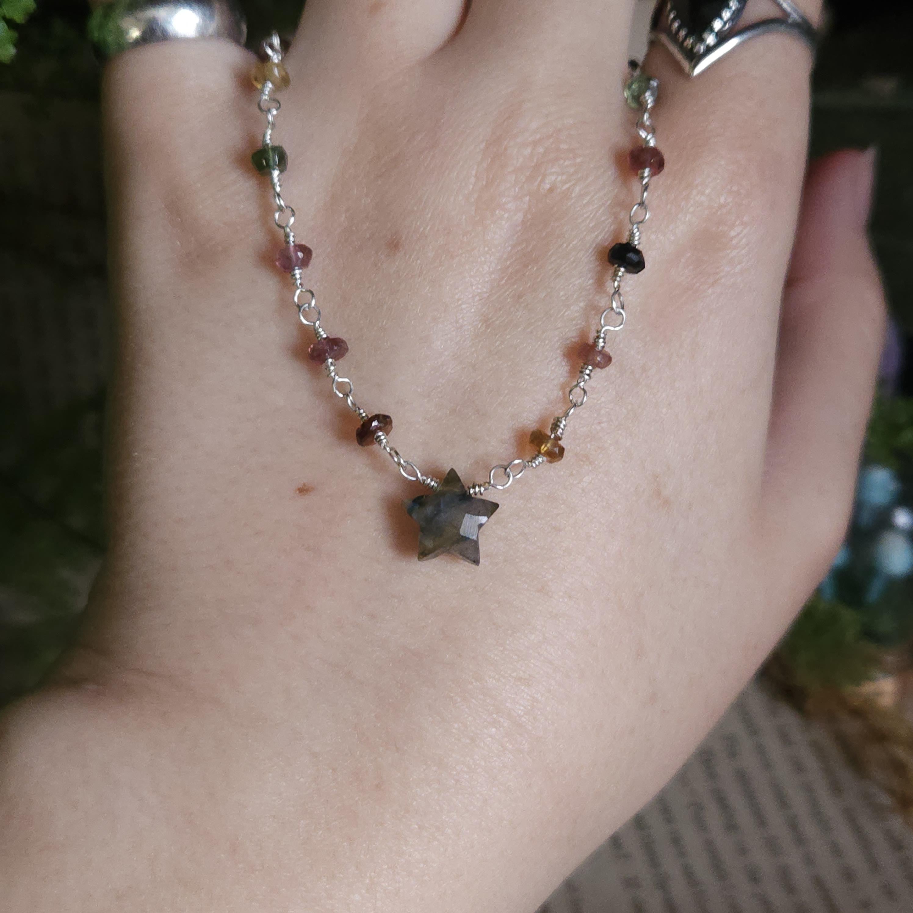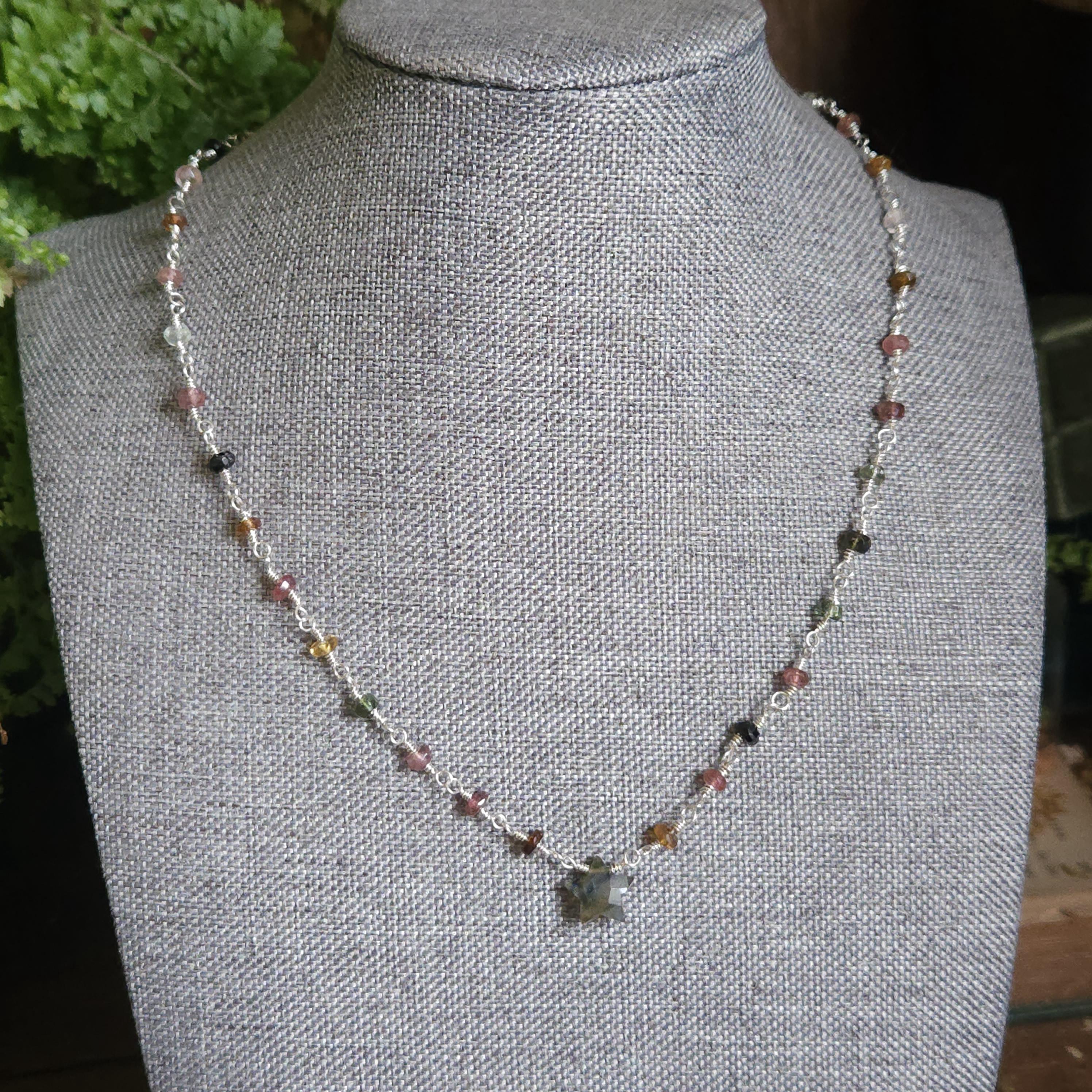 One of a kind artisan handmade gemstone pendant made using sterling silver, multi tourmaline beads, and a star shaped labradorite