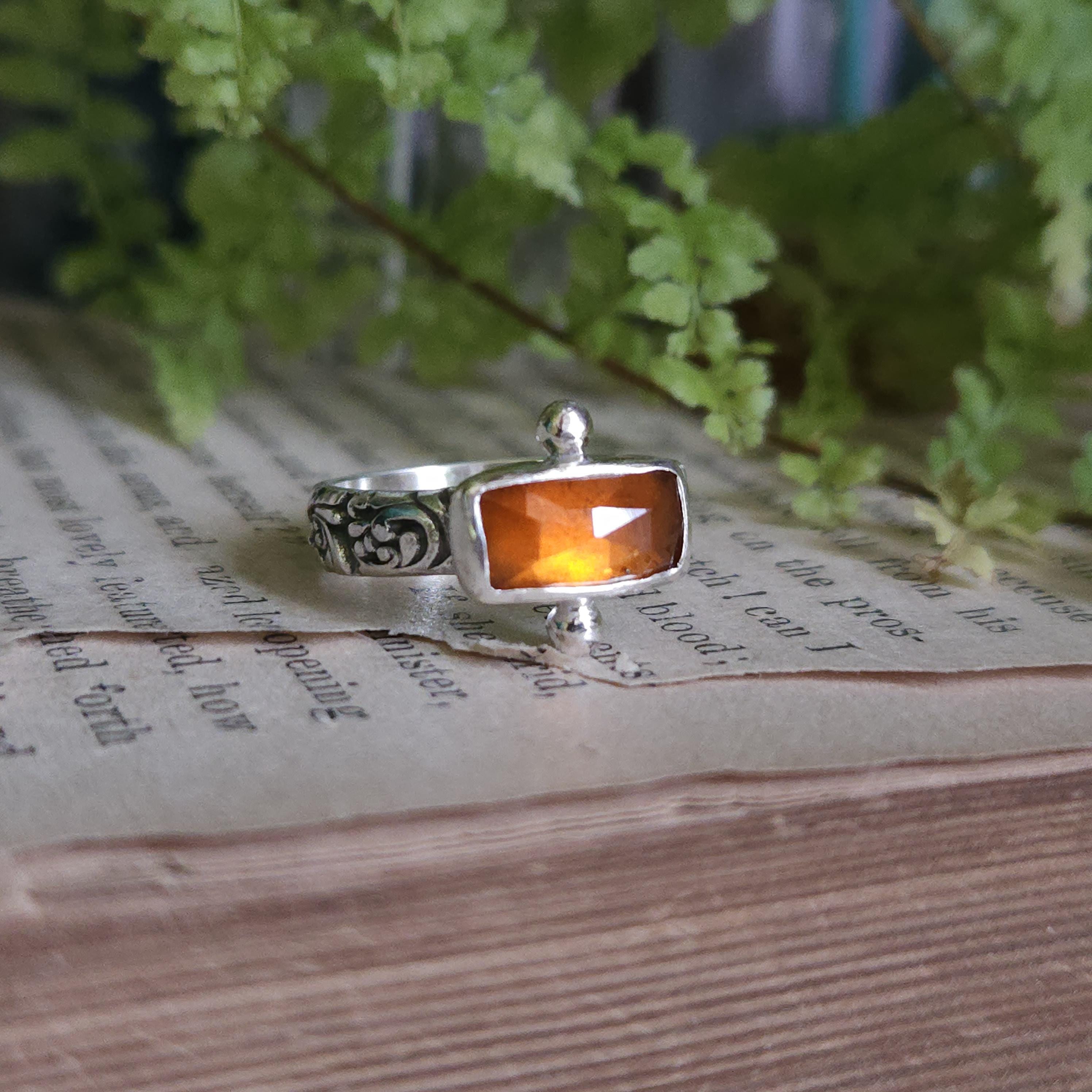 One of a kind handcrafted gemstone ring made using sterling silver and orange kyanite. Kyanite is a relatively soft stone. Please keep this in mind and avoid knocking it on hard surfaces.