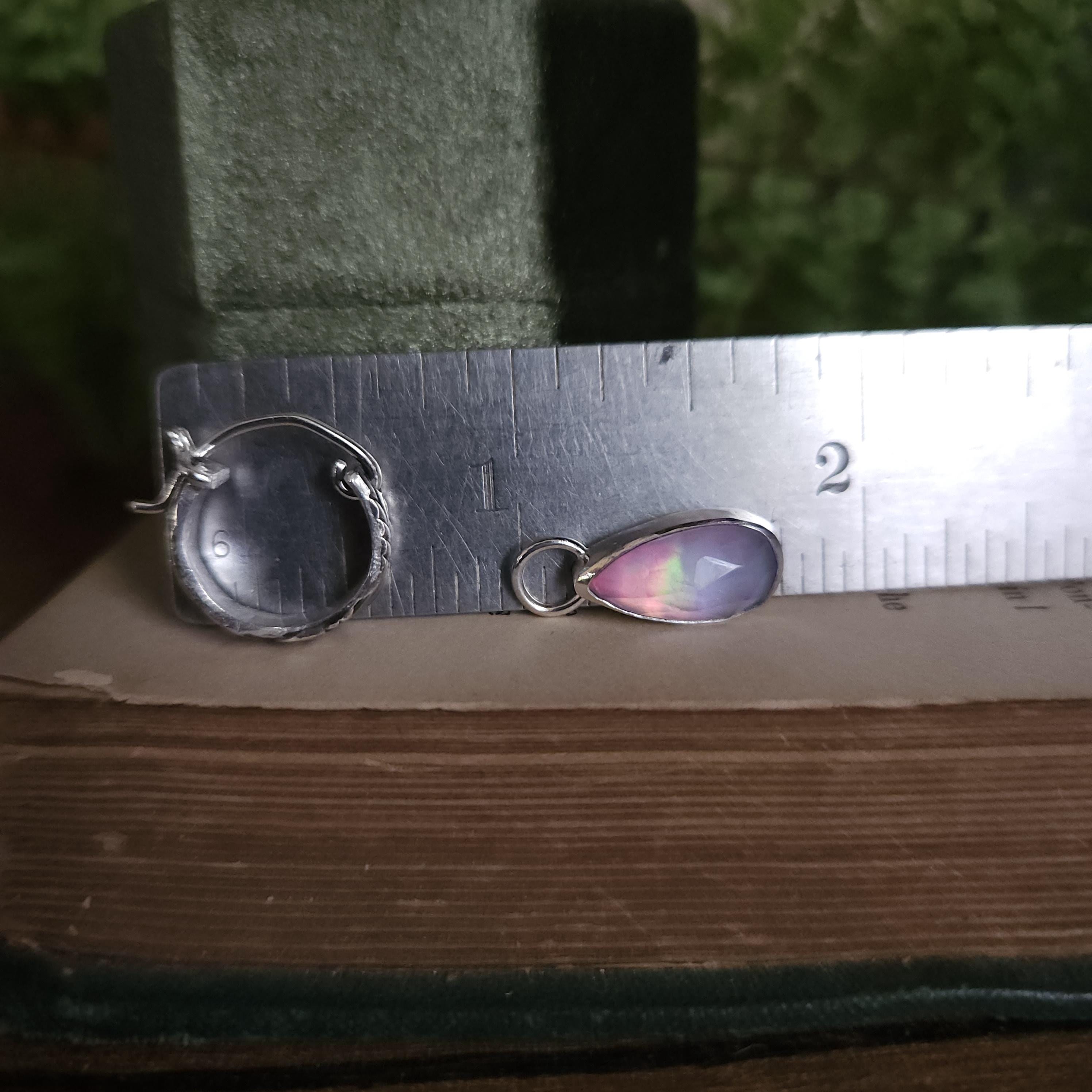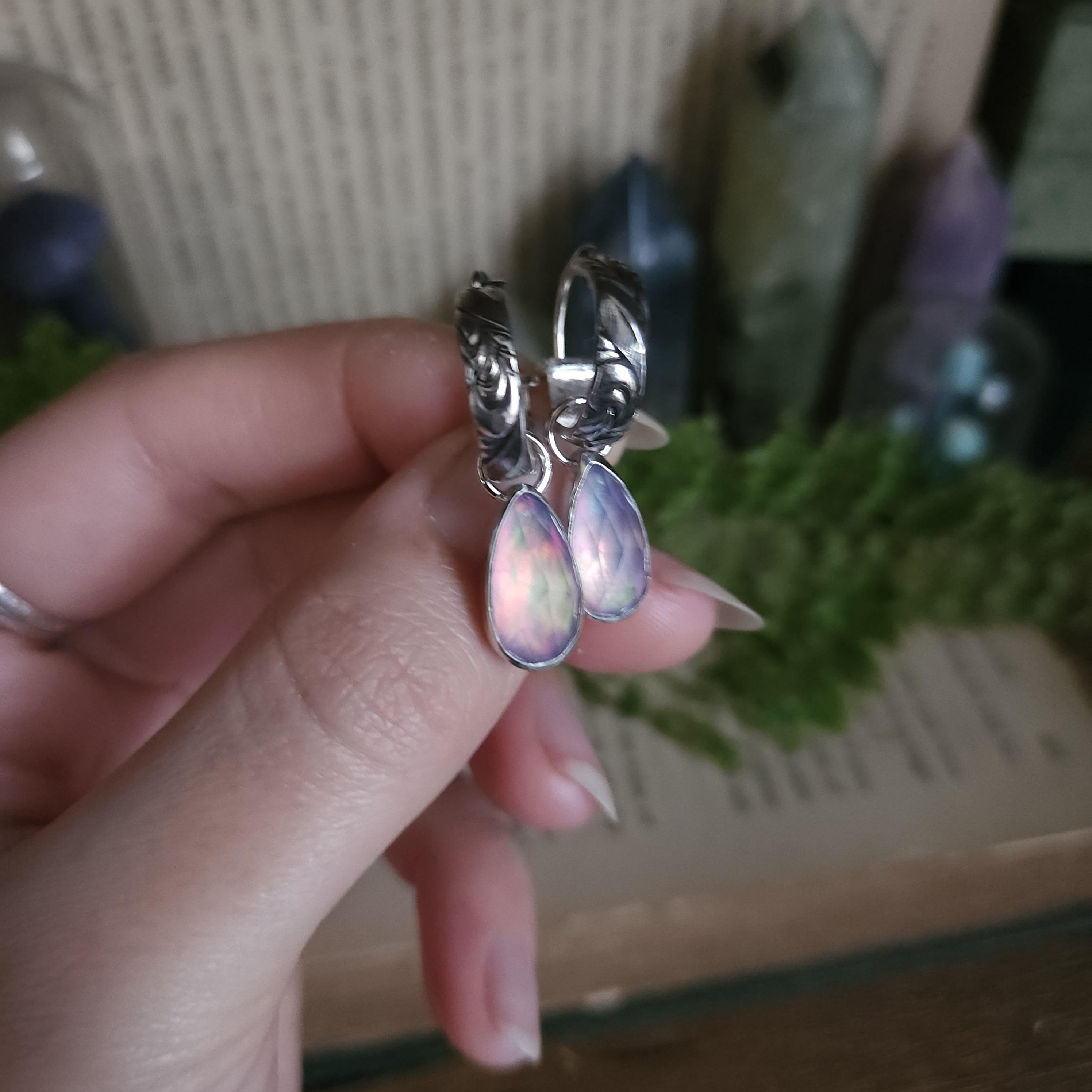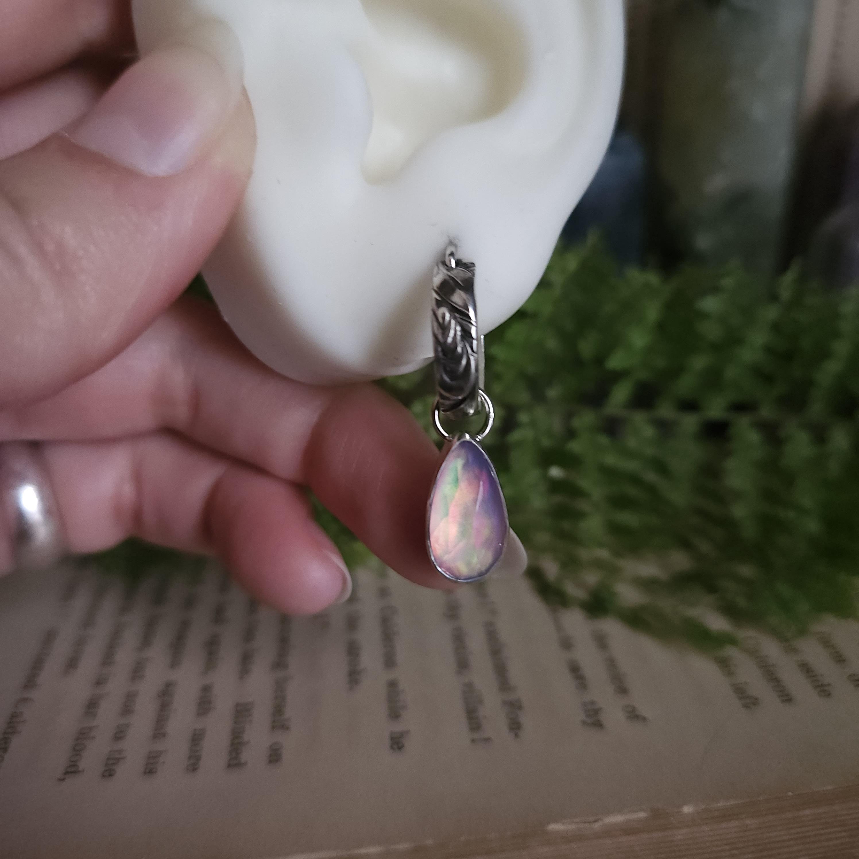 Made using sterling silver and aurora opal, a man made stone. The charms are unattached, so you can take them off and wear just the hoops if you'd like.