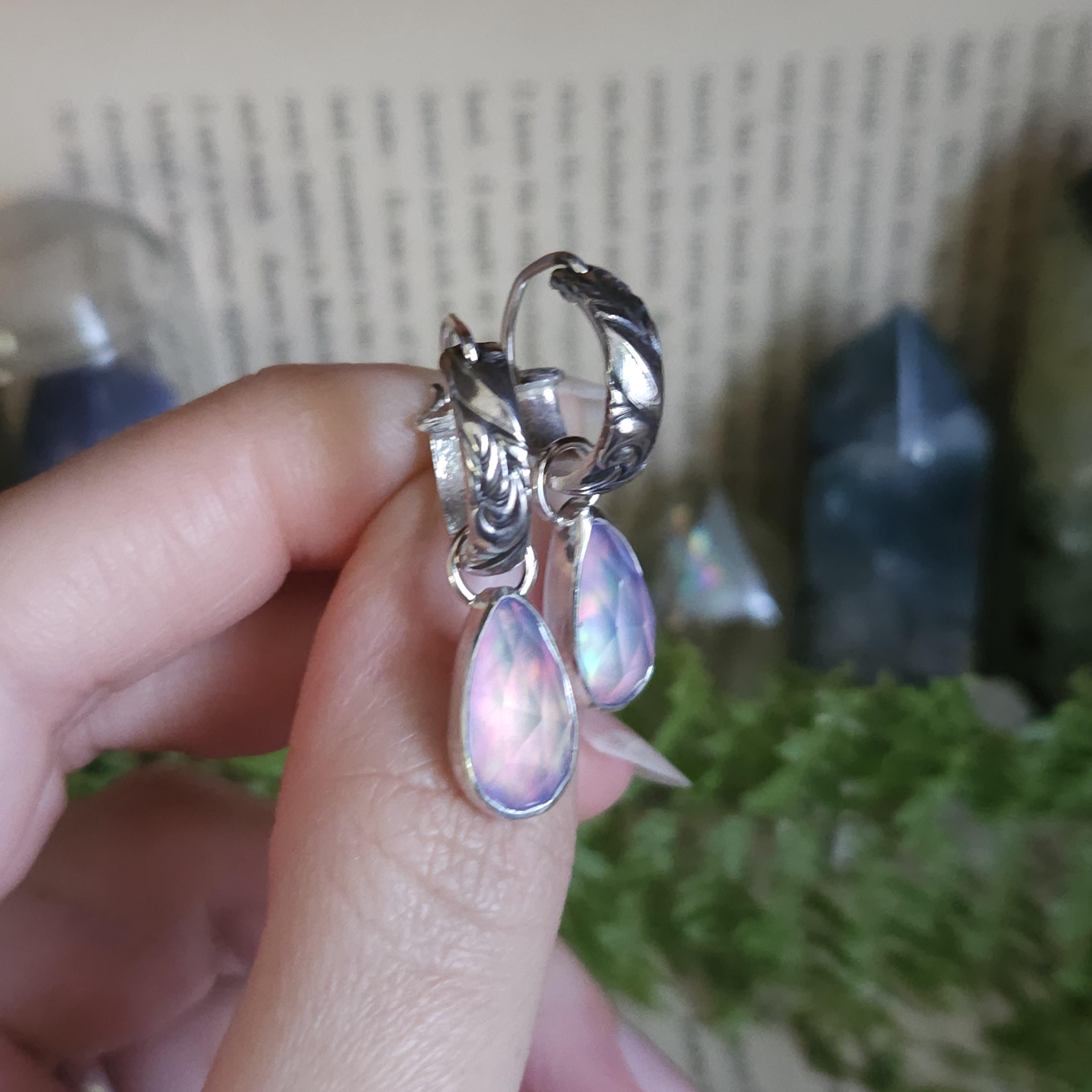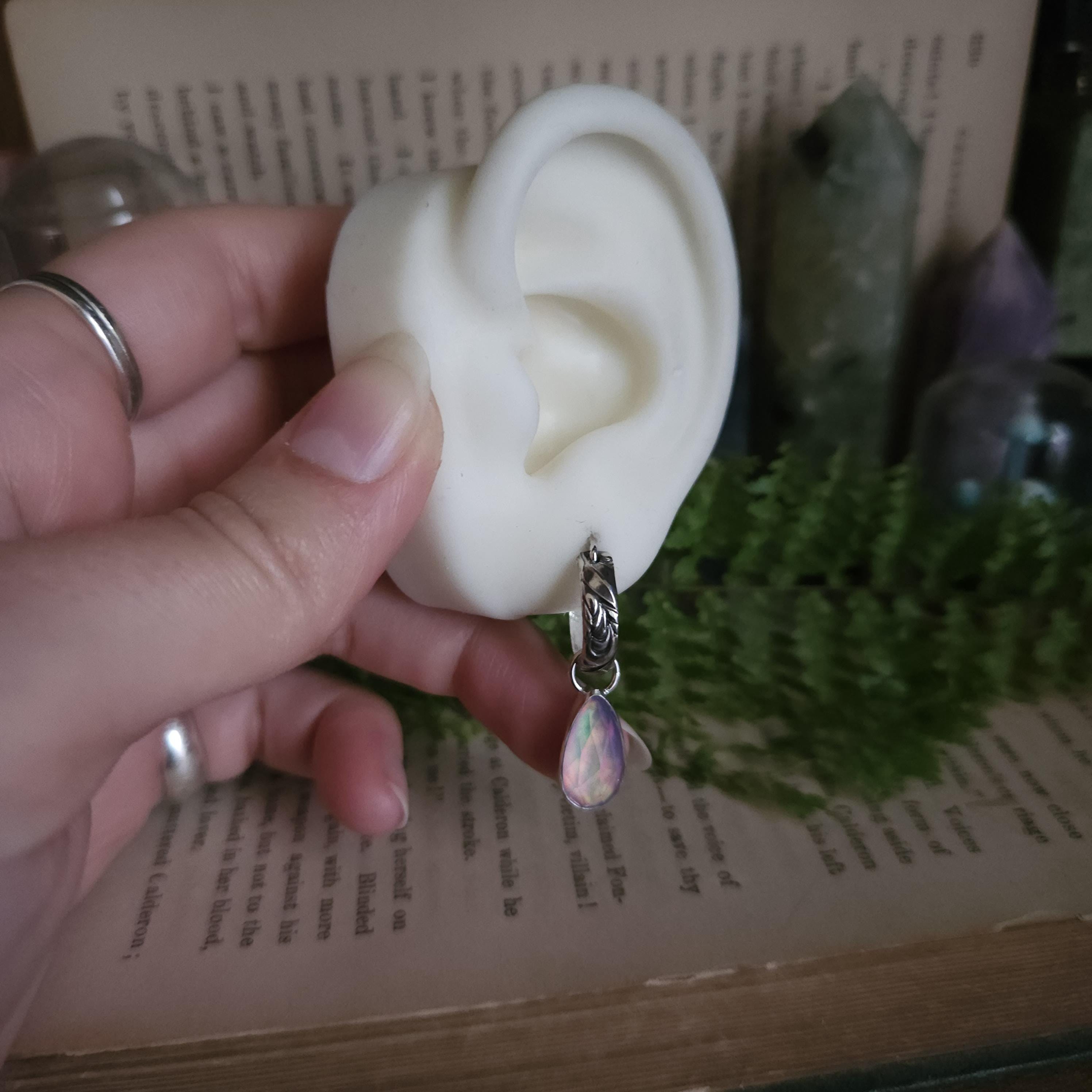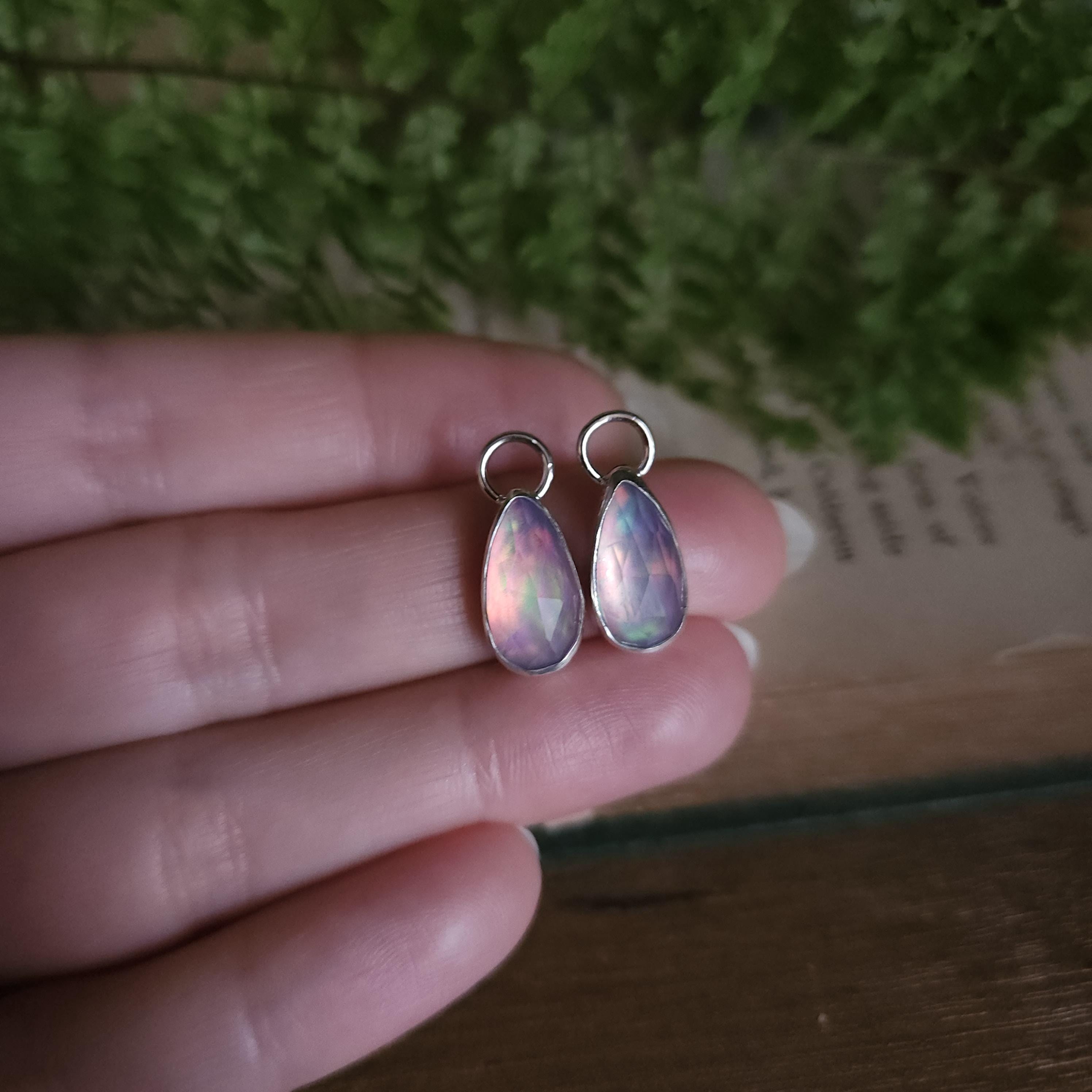 Made using sterling silver and aurora opal, a man made stone. The charms are unattached, so you can take them off and wear just the hoops if you'd like.