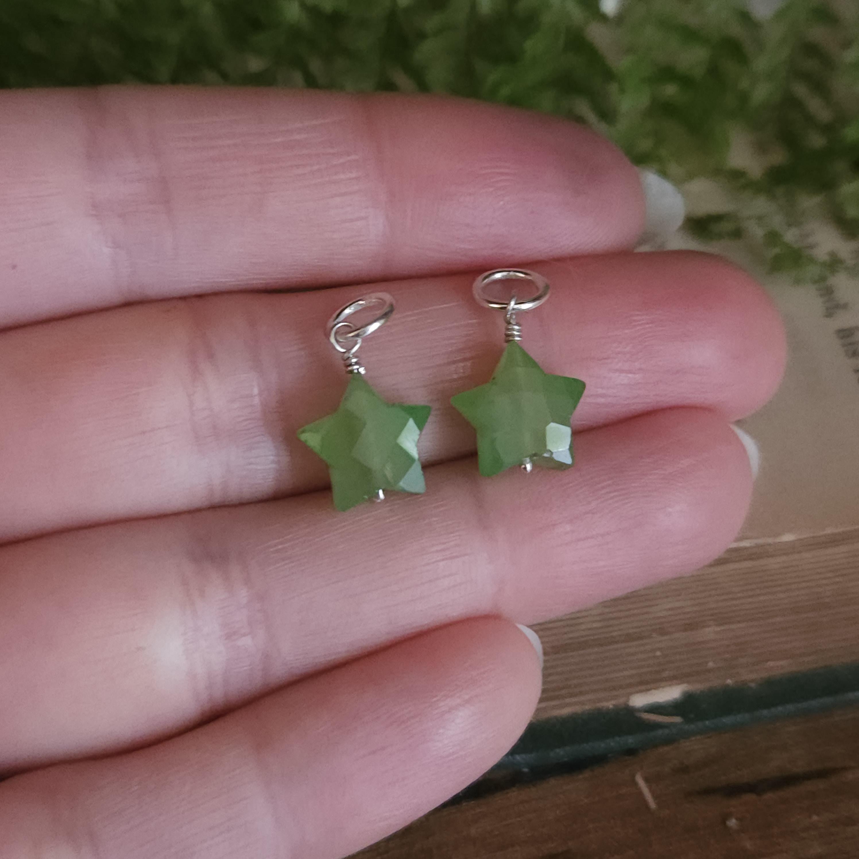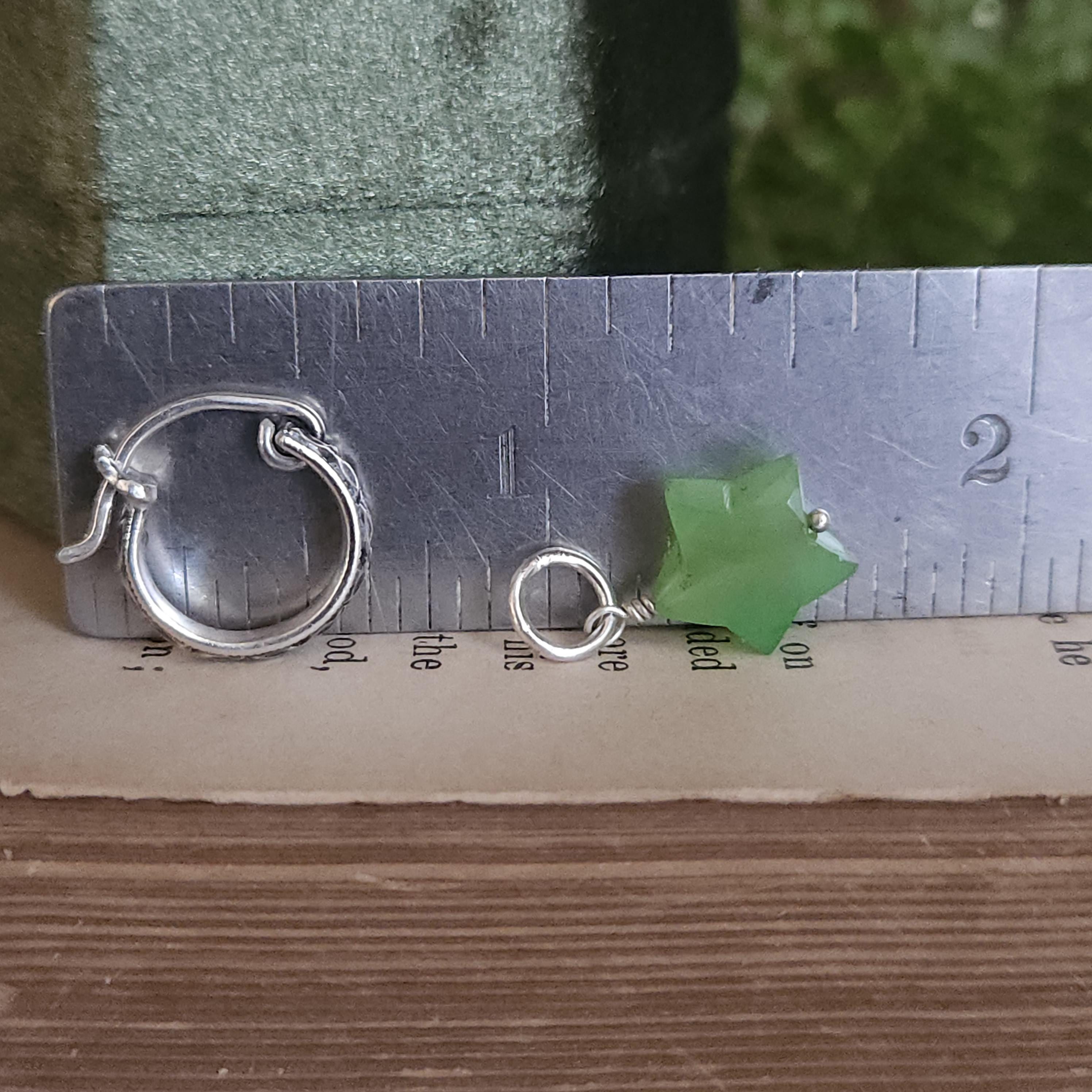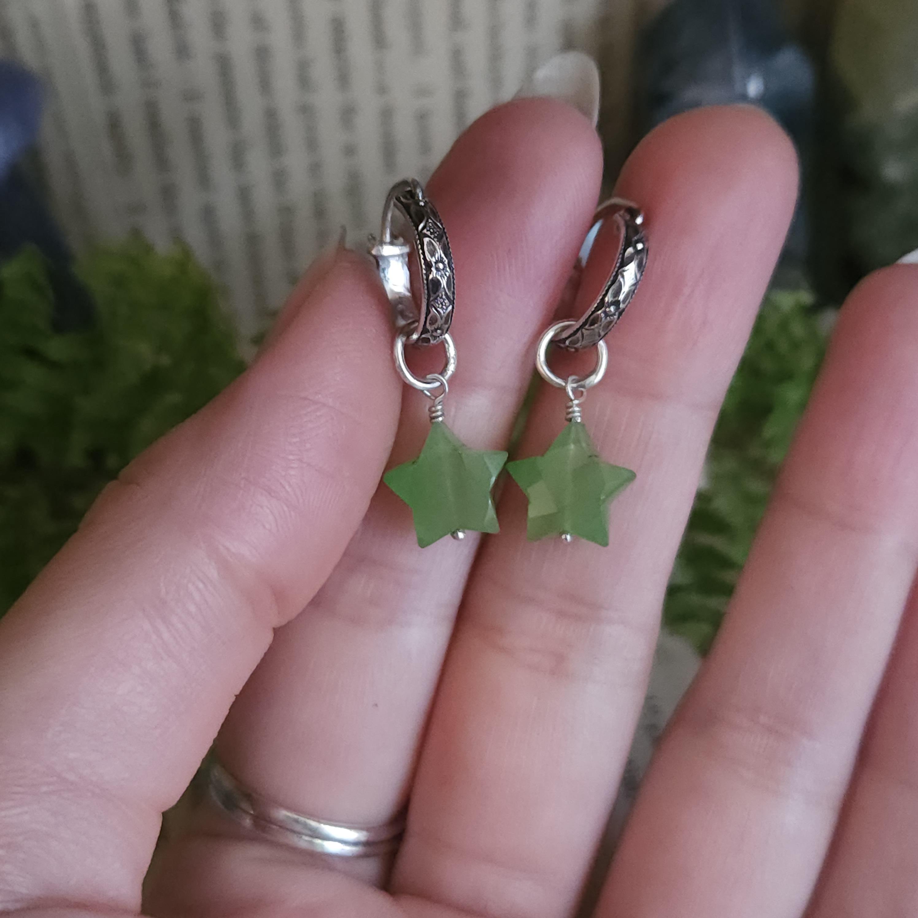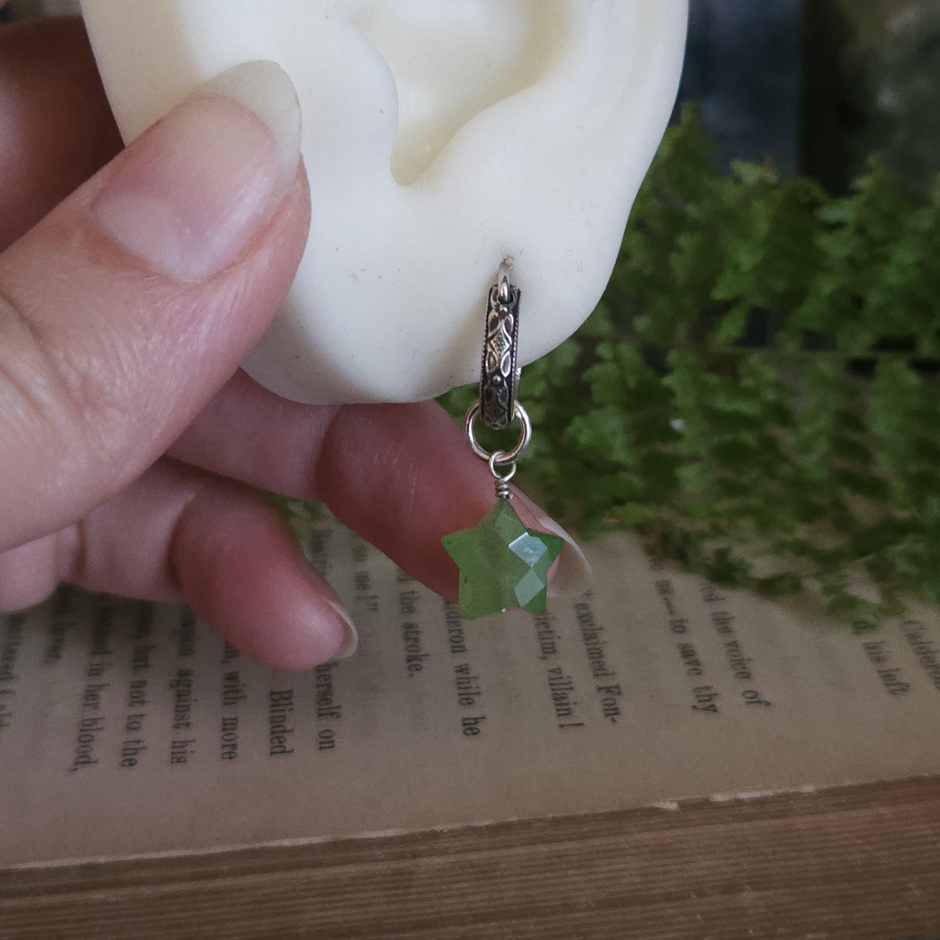 Made using sterling silver and dyed green jade. The charms are unattached, so you can take them off and wear just the hoops if you'd like.