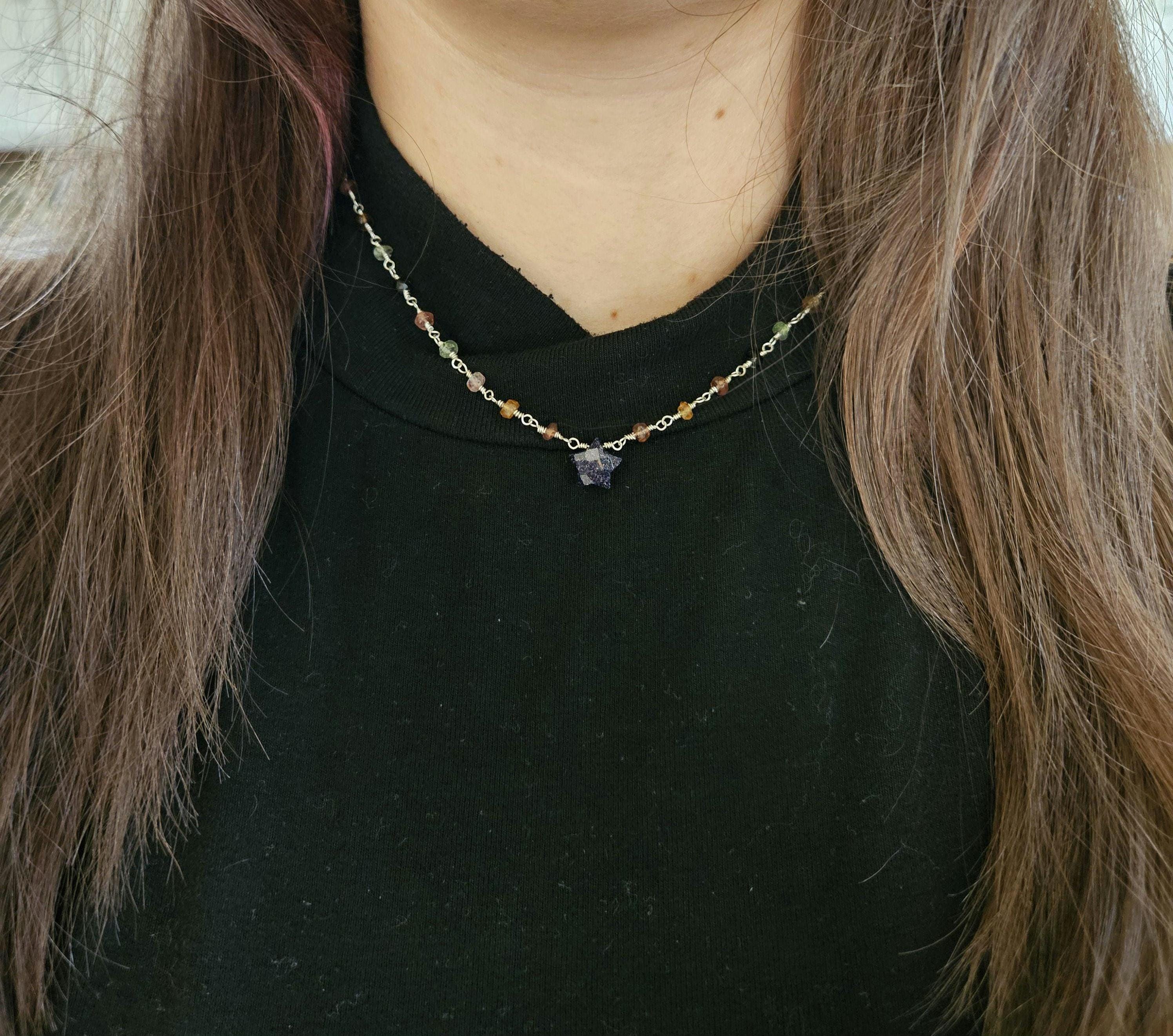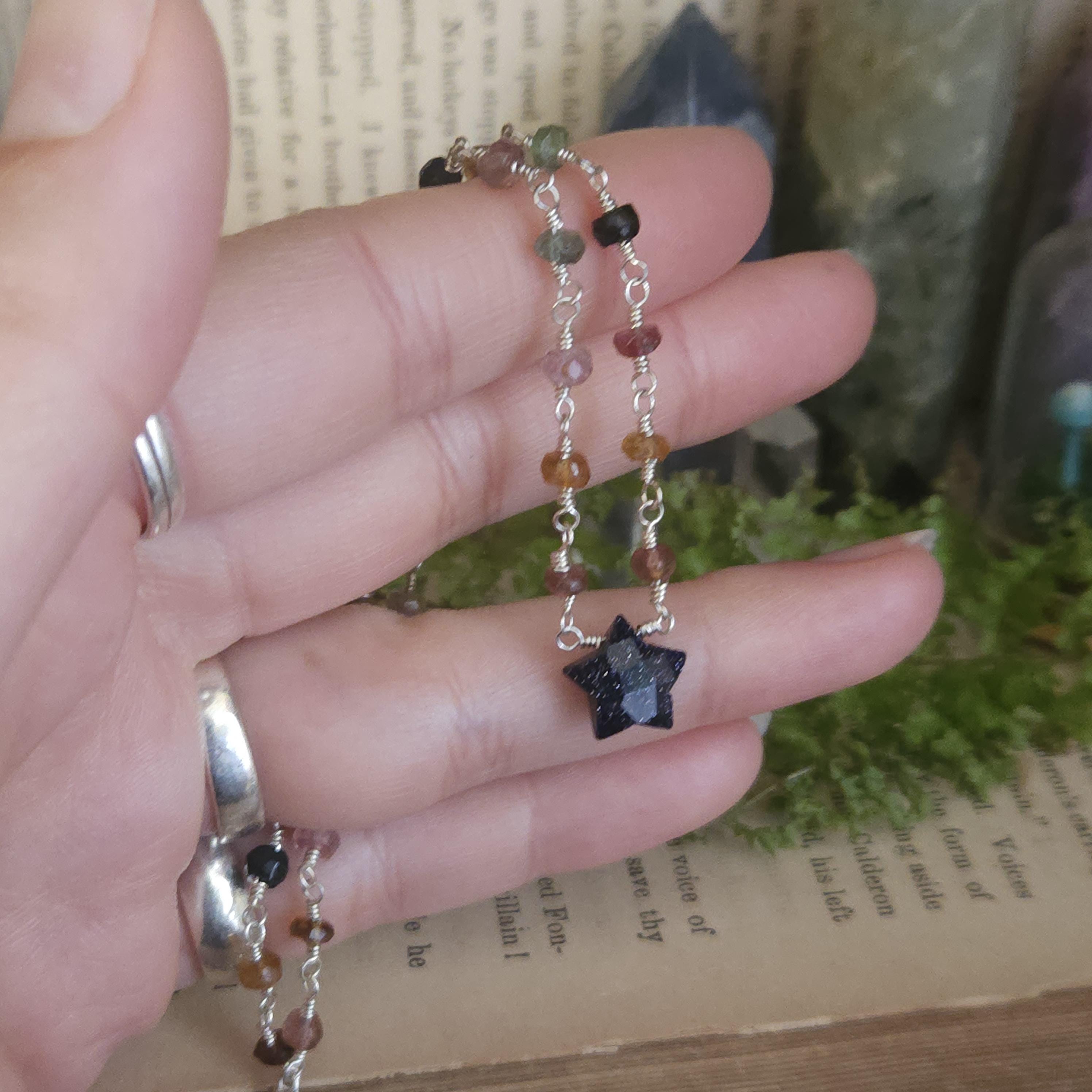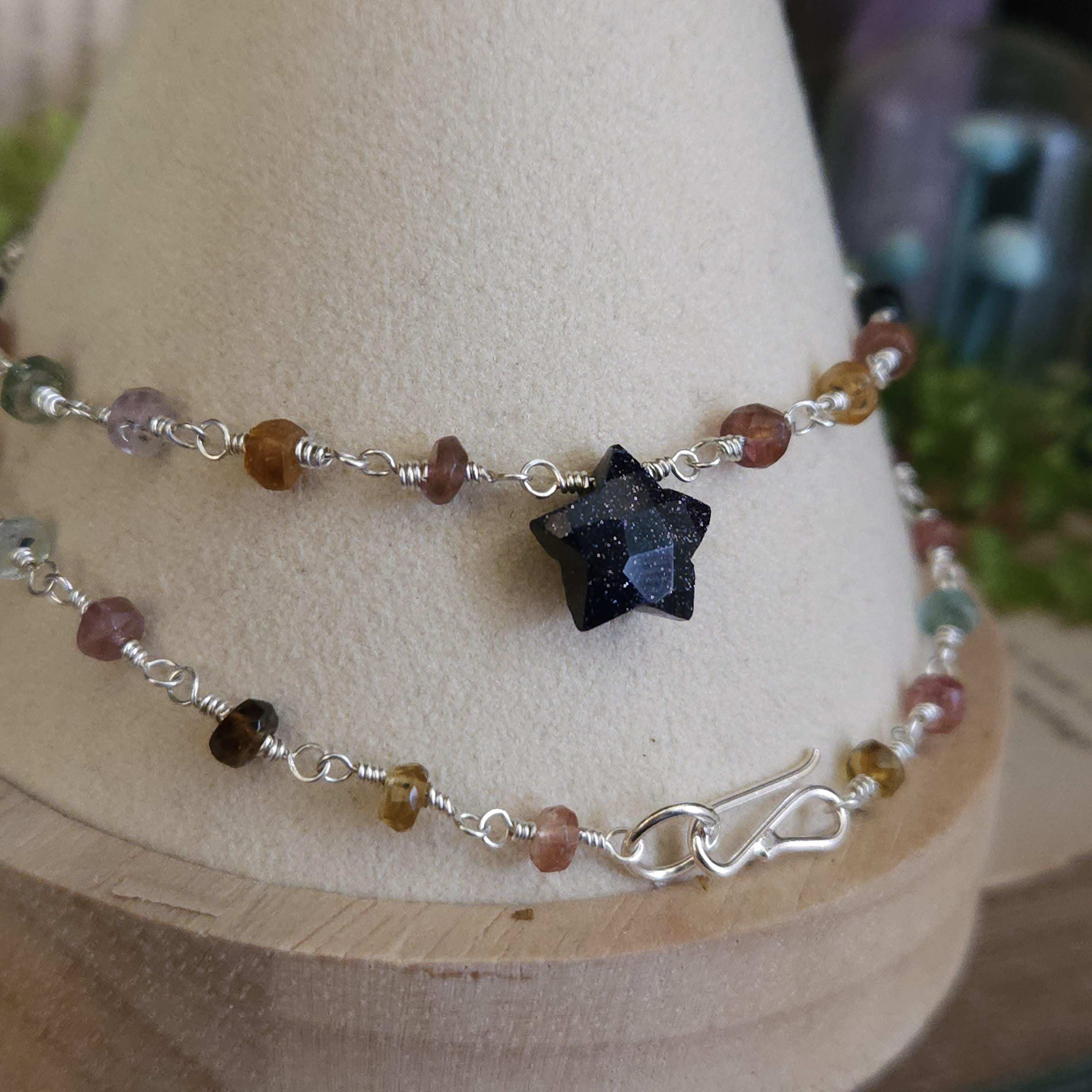 One of a kind artisan handmade gemstone pendant made using sterling silver, multi tourmaline beads, and a star shaped blue sandstone