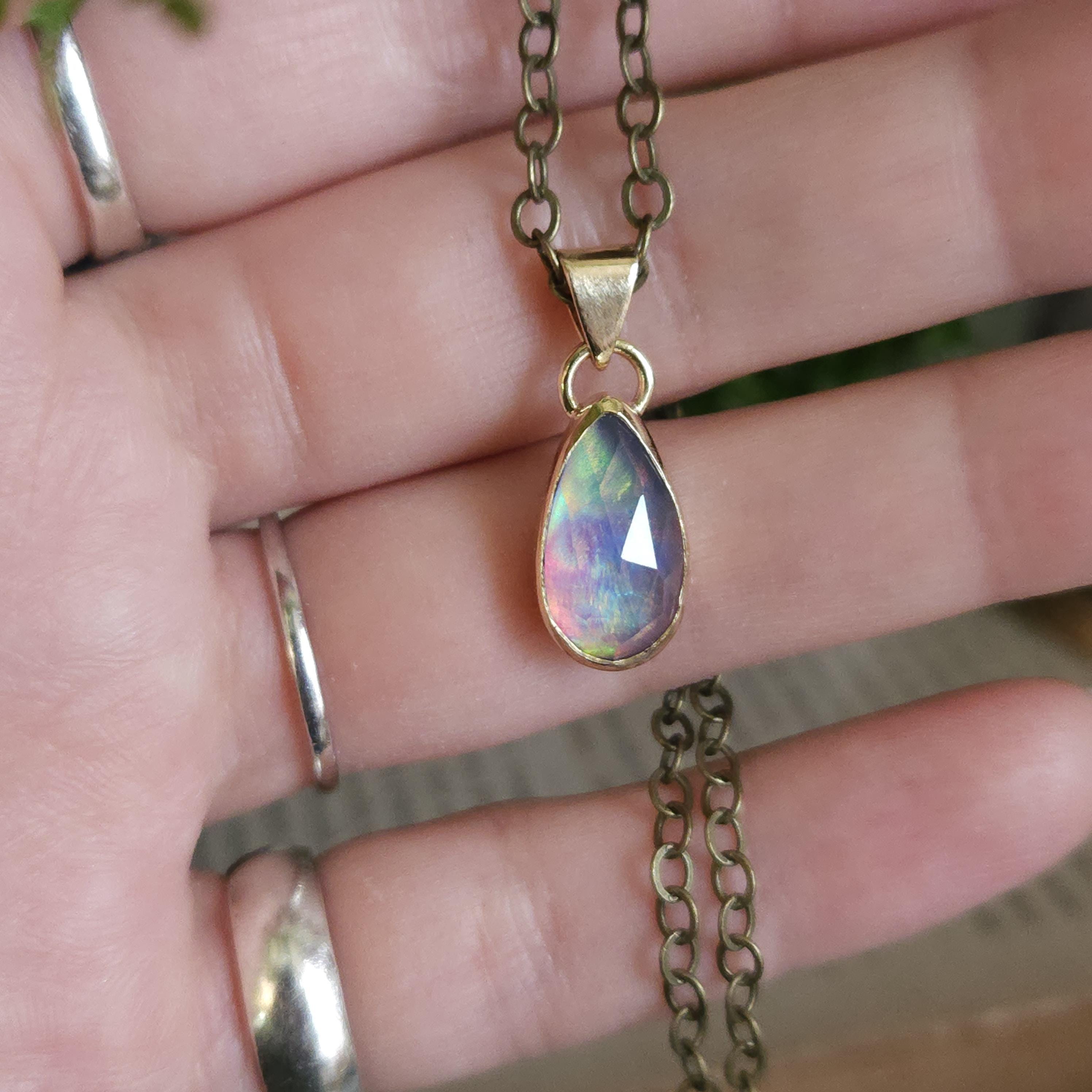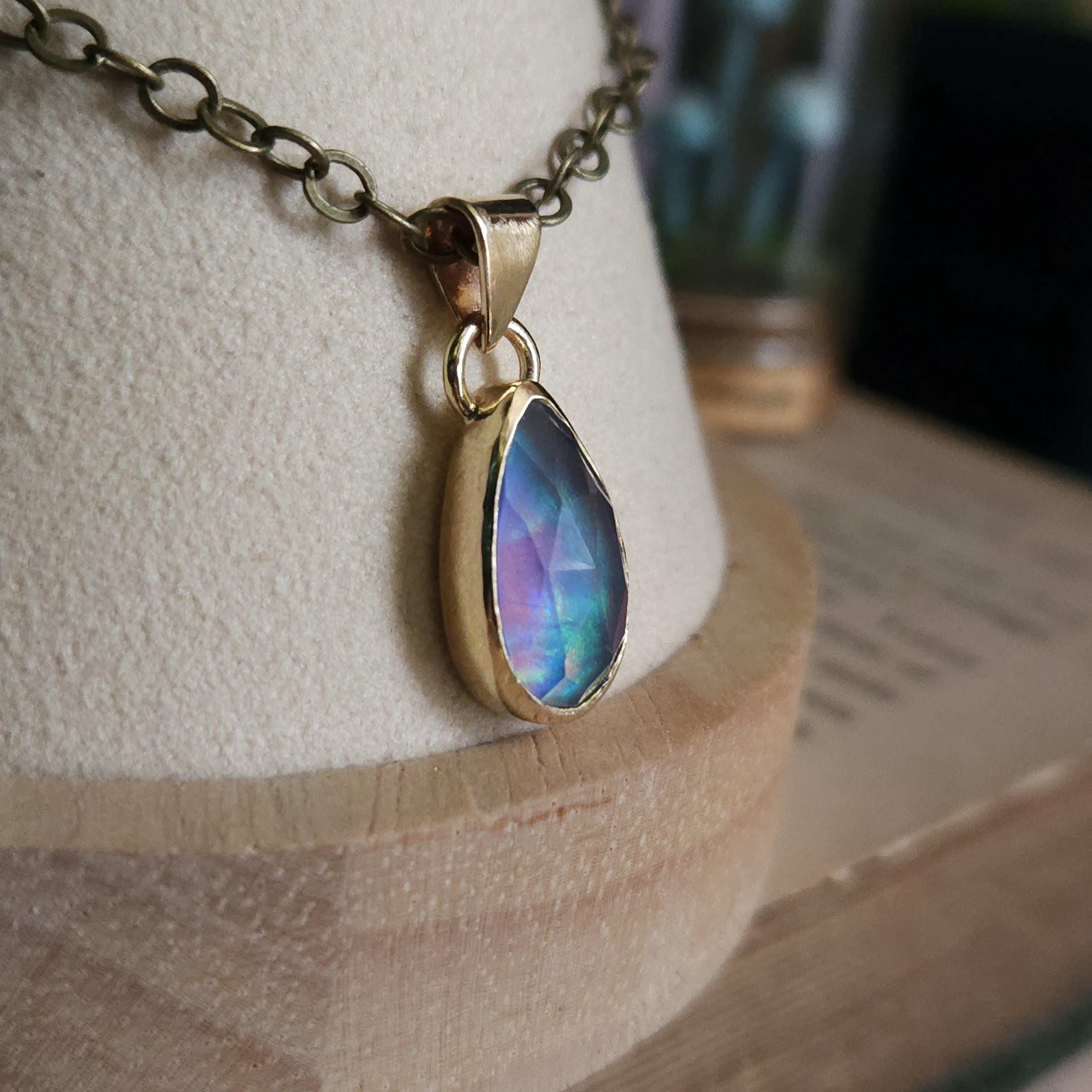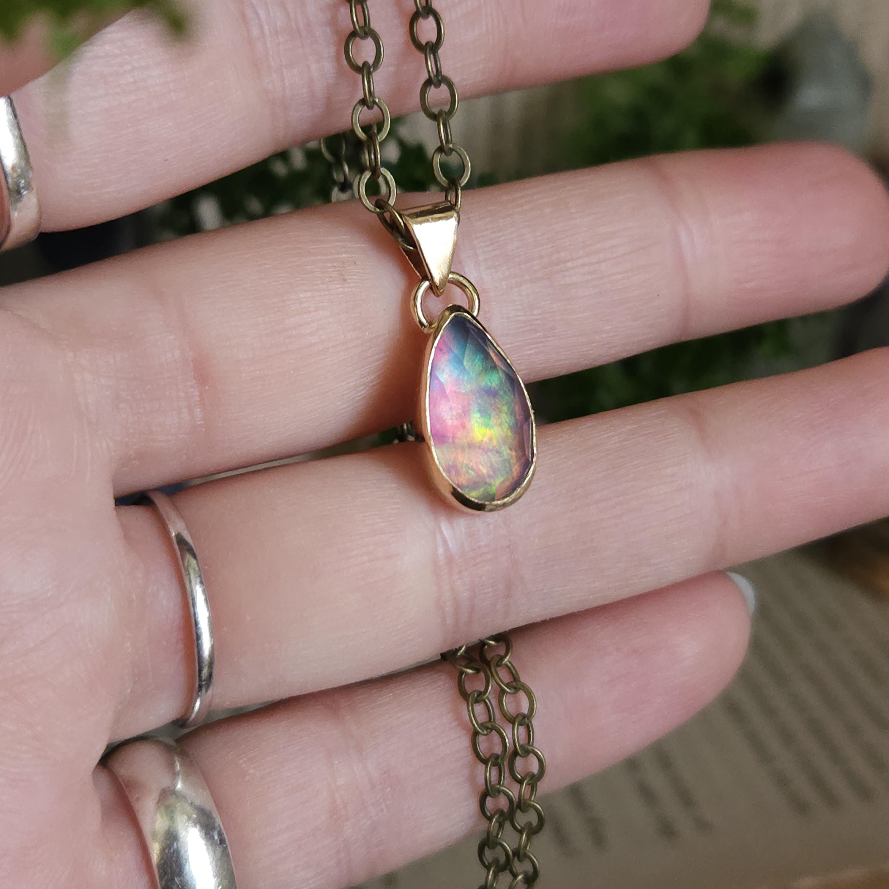 One of a kind artisan handmade gemstone pendant made using brass and aurora opal, a man made stone