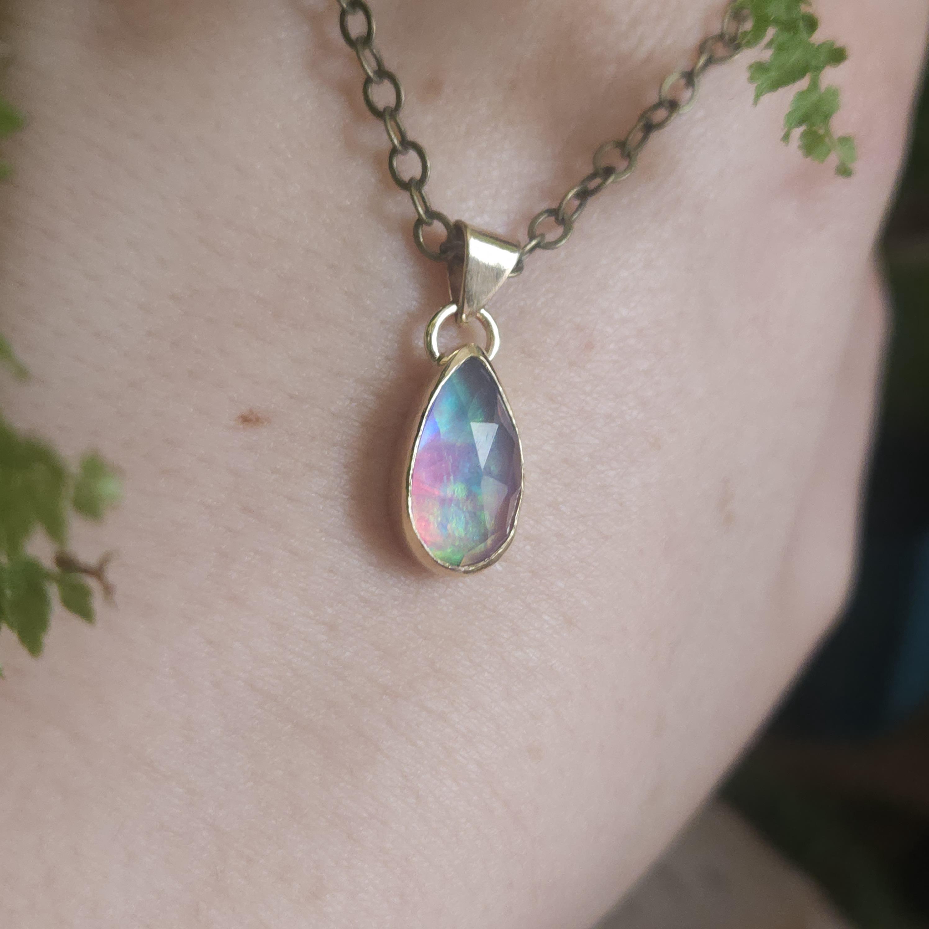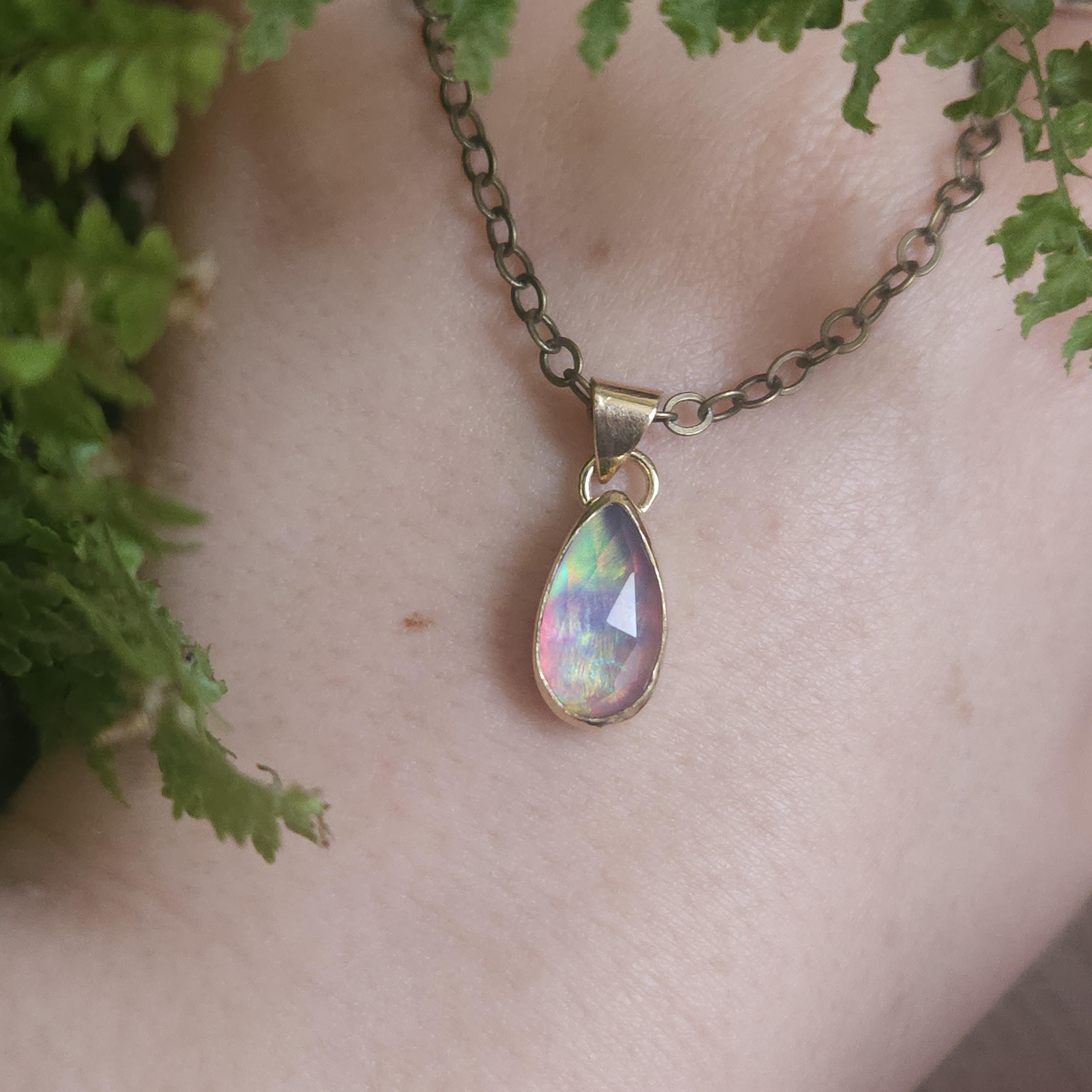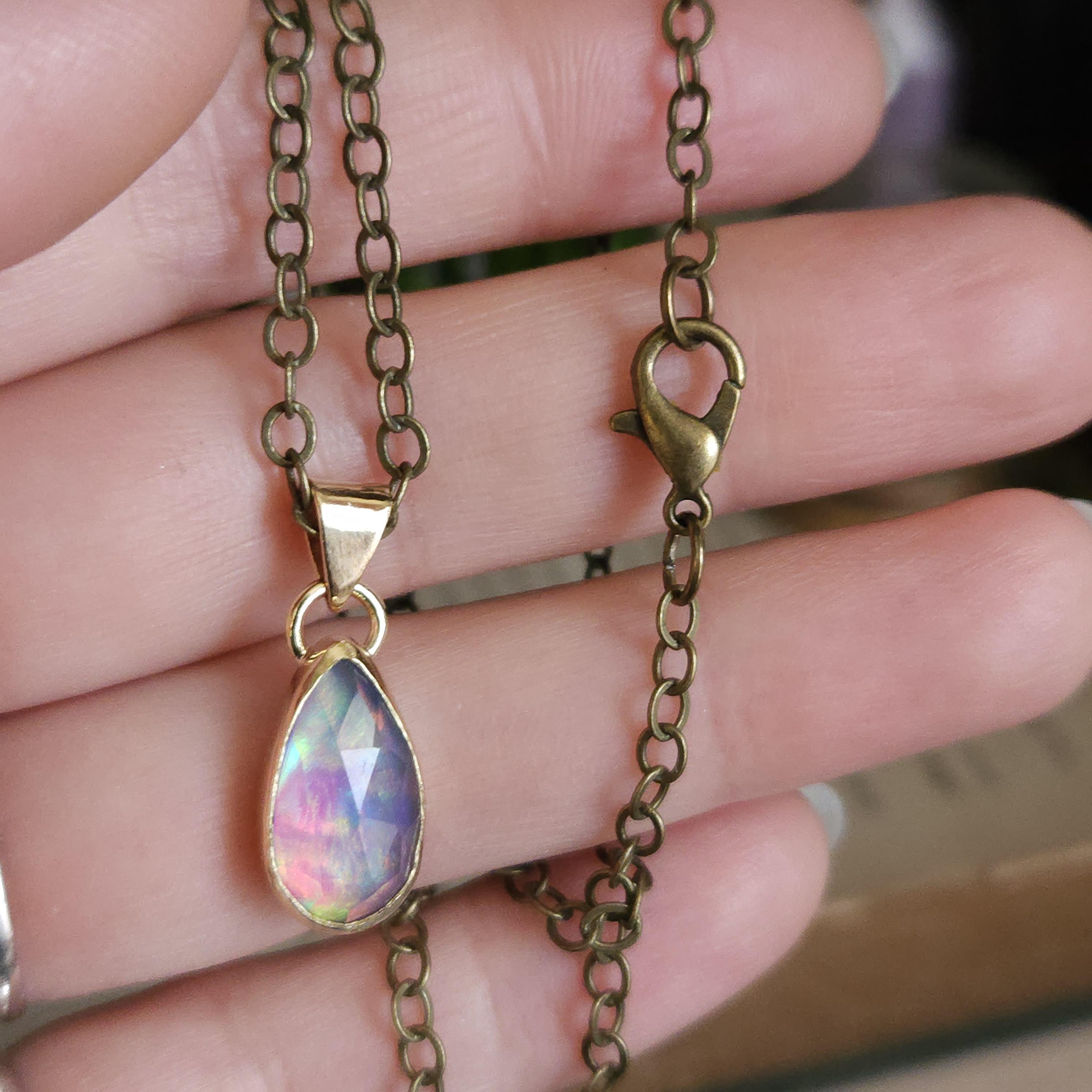 One of a kind artisan handmade gemstone pendant made using brass and aurora opal, a man made stone