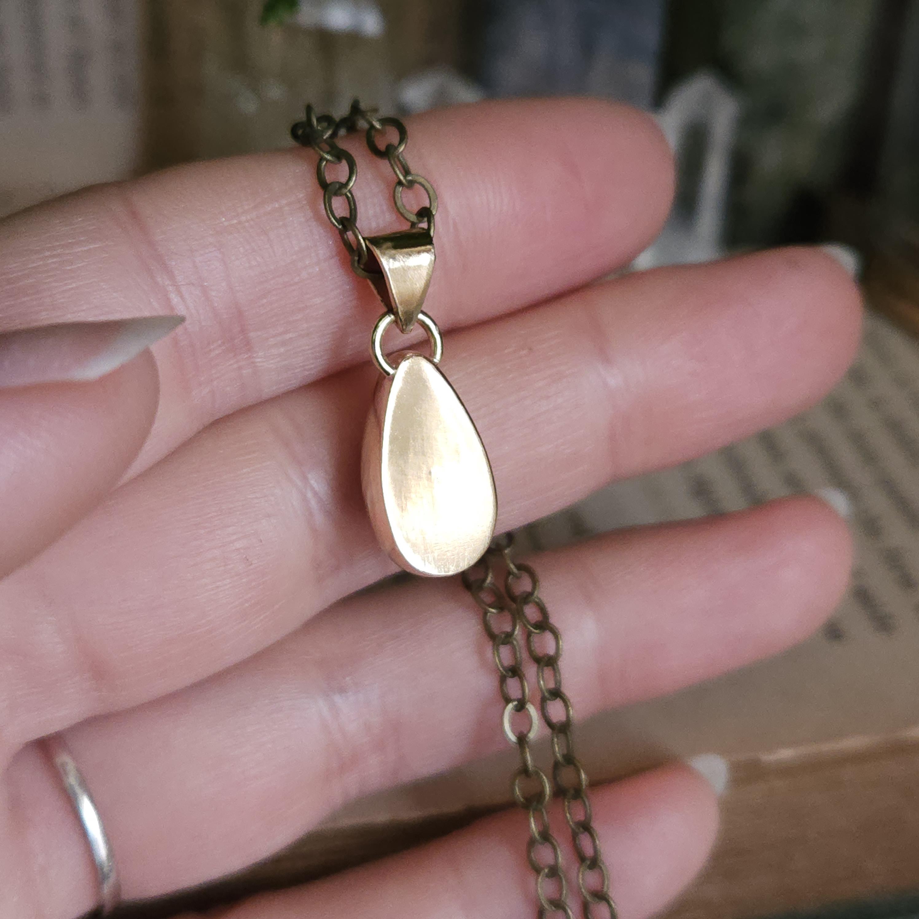 This pendant comes on a 18 inch brass chain. Please let me know if you would like a different length chain (: