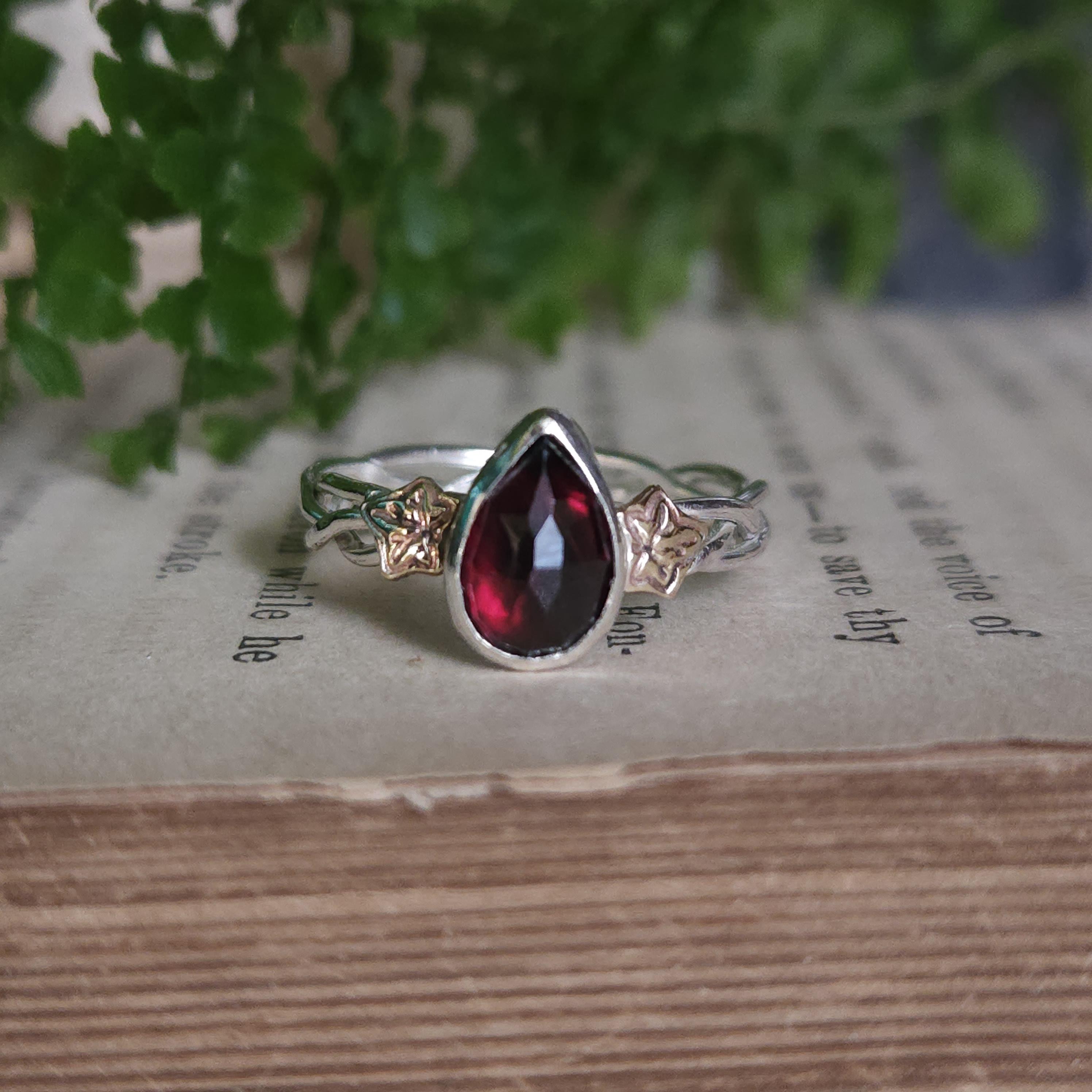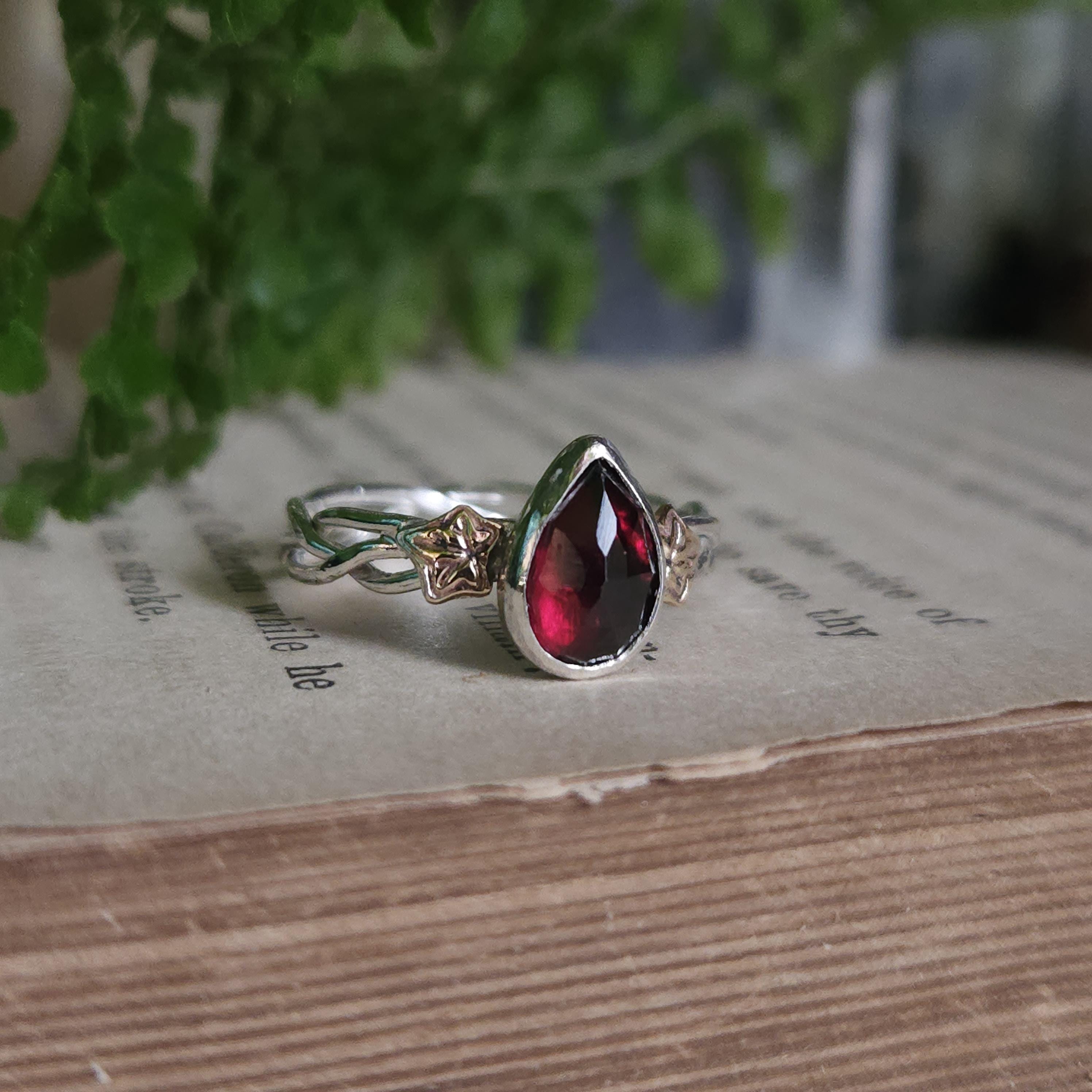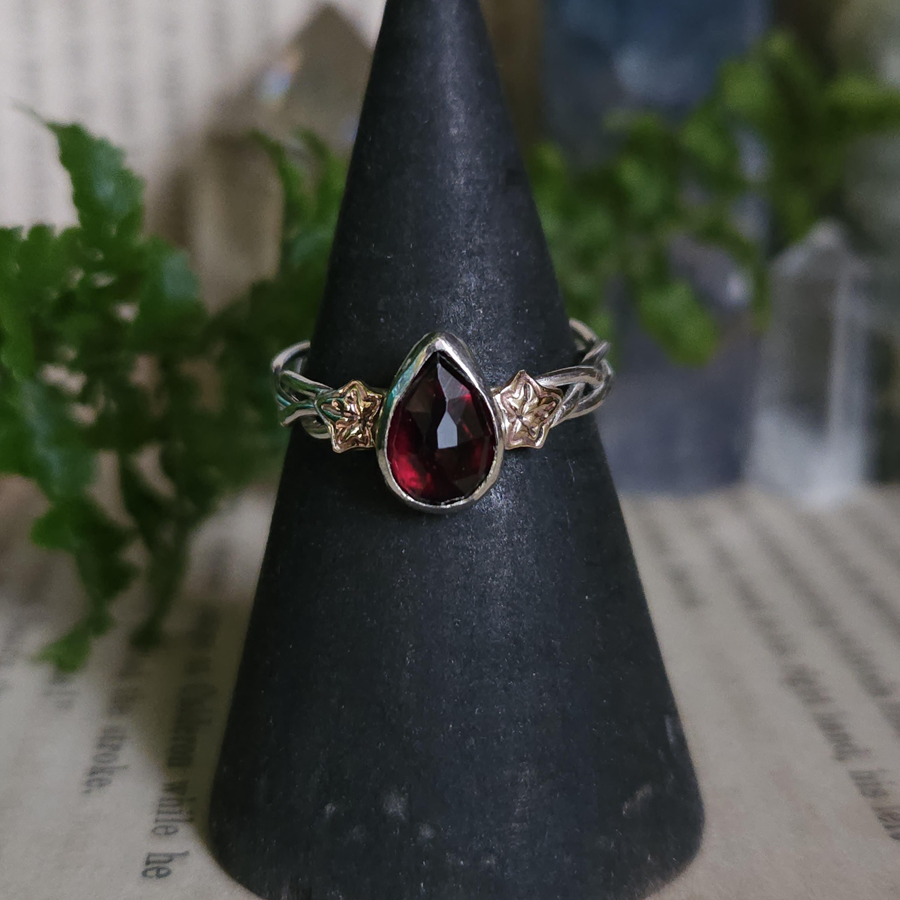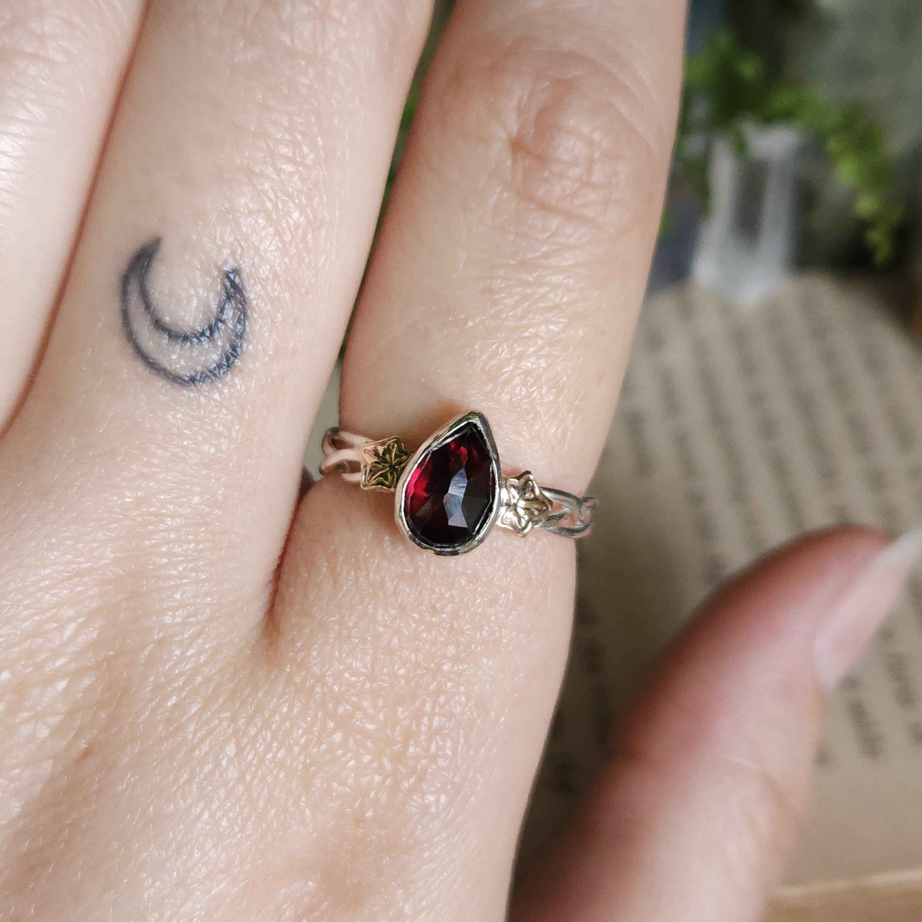 One of a kind handcrafted gemstone ring made using sterling silver and garnet with brass ivy leaf accents