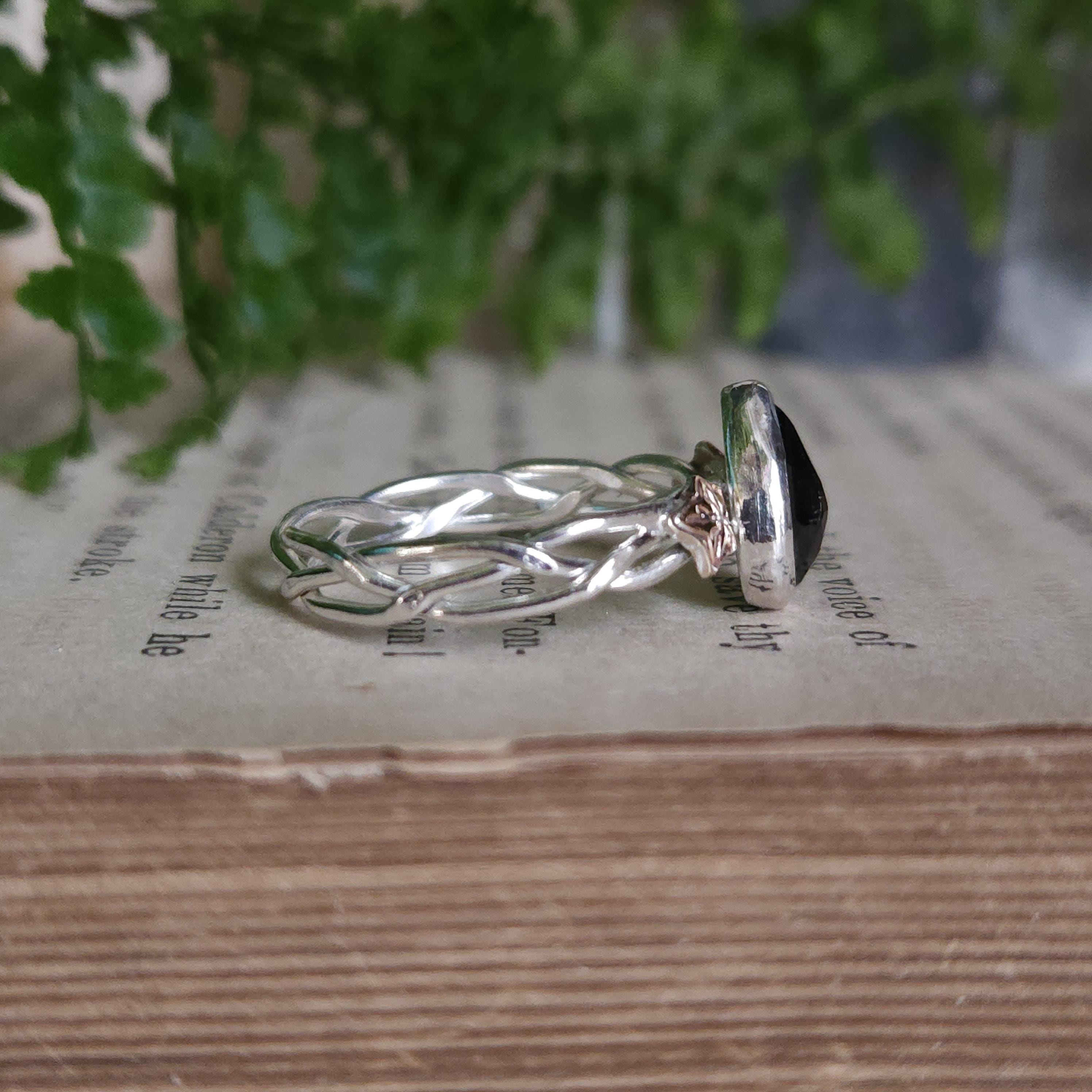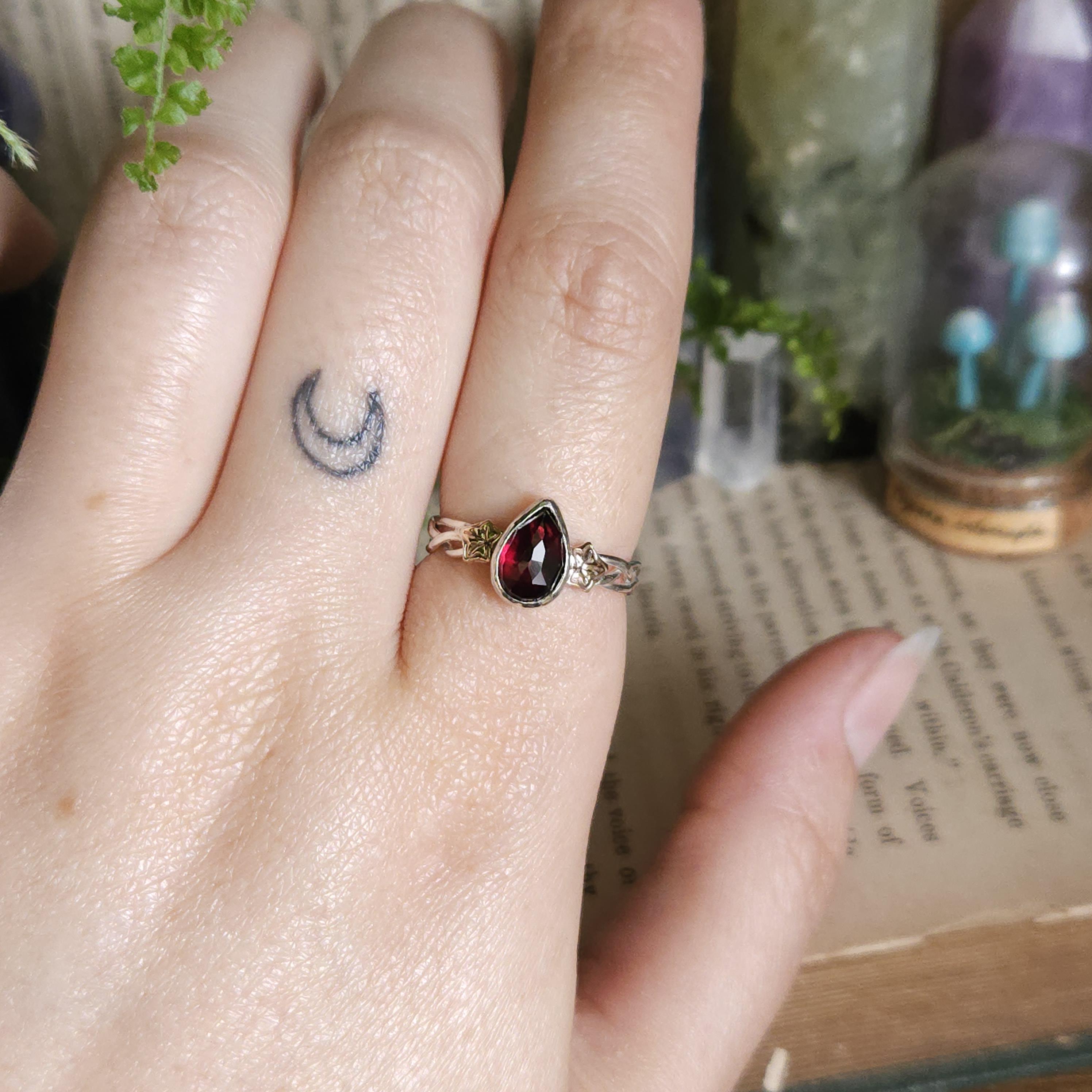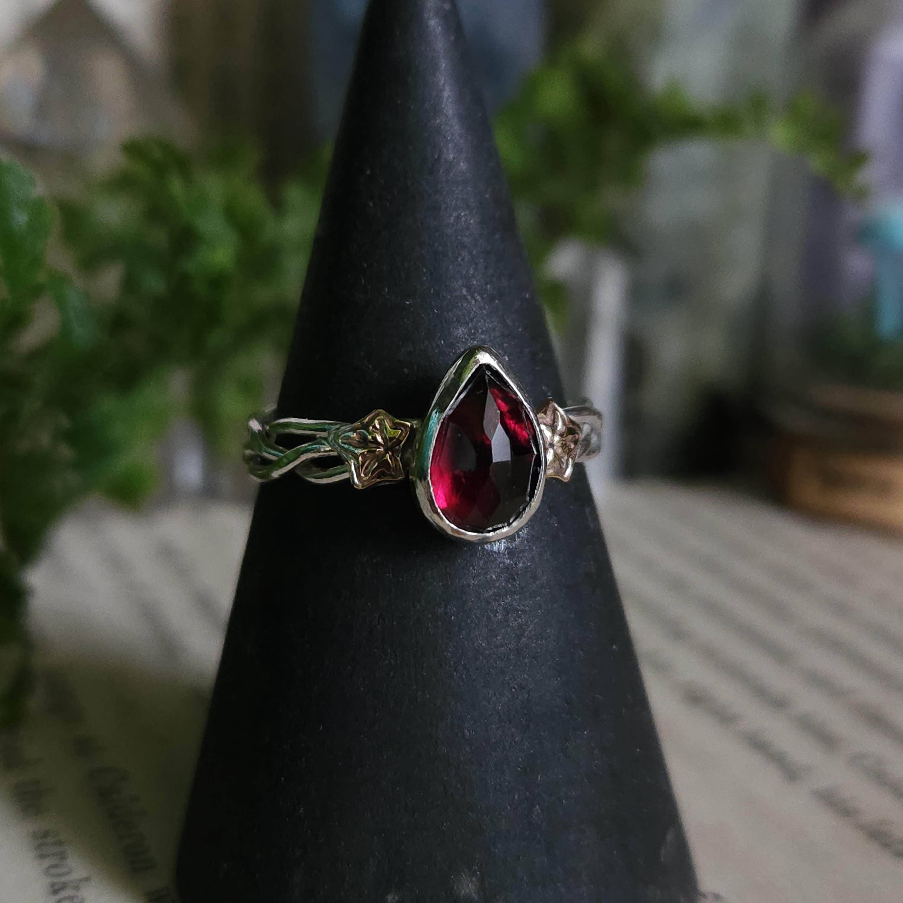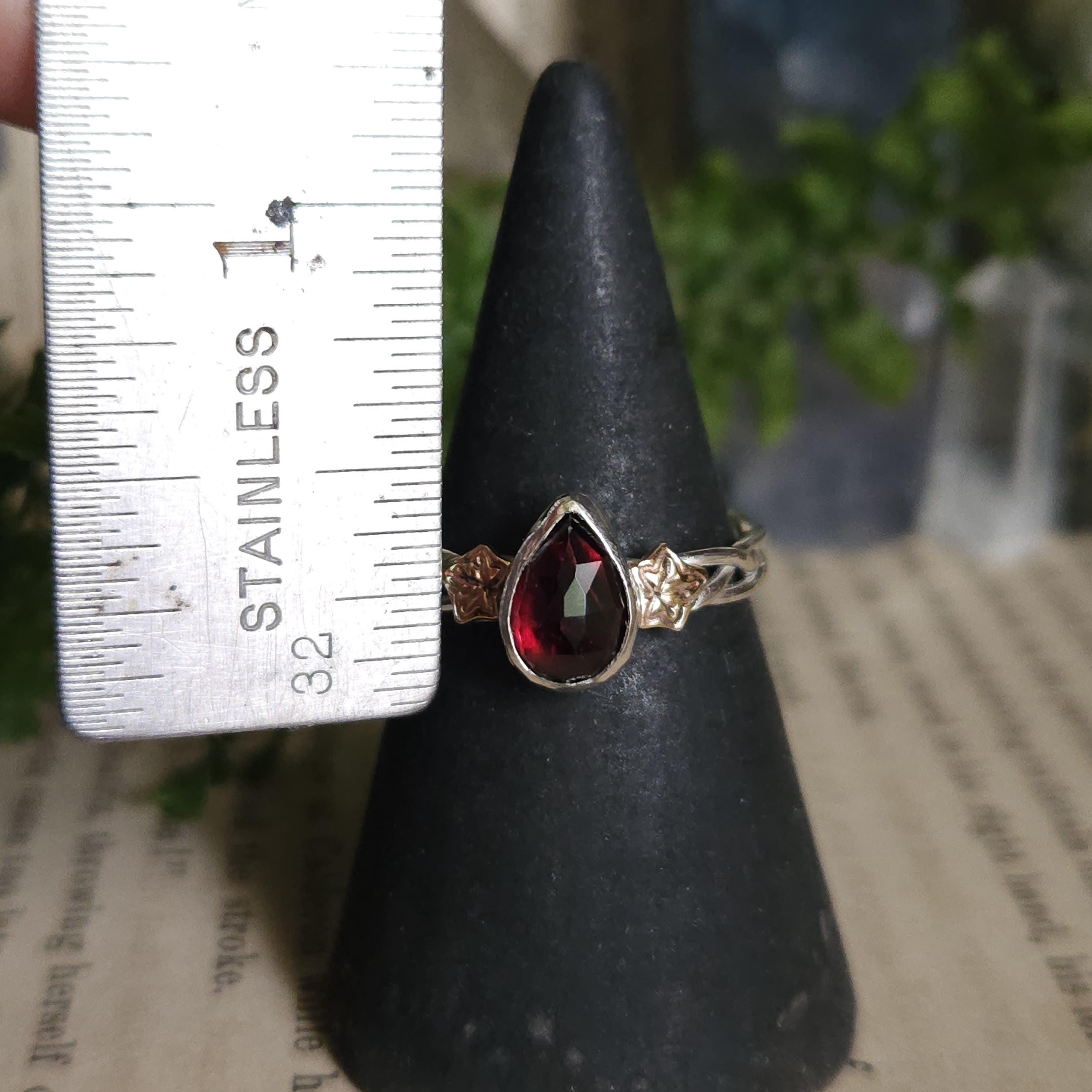 One of a kind handcrafted gemstone ring made using sterling silver and garnet with brass ivy leaf accents