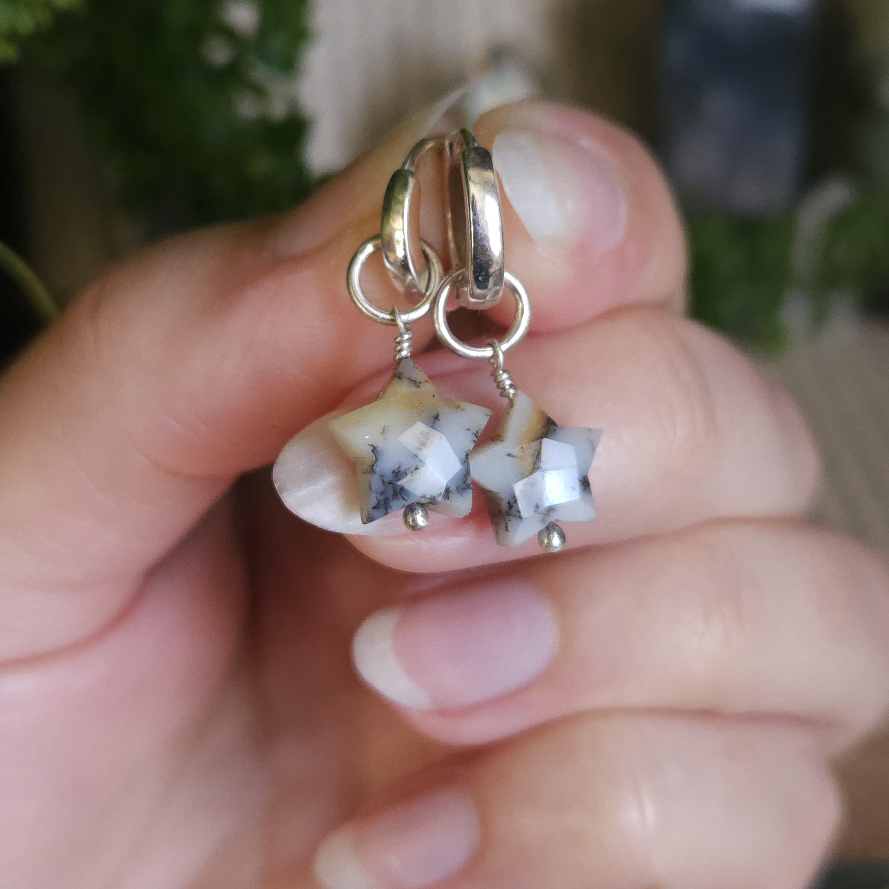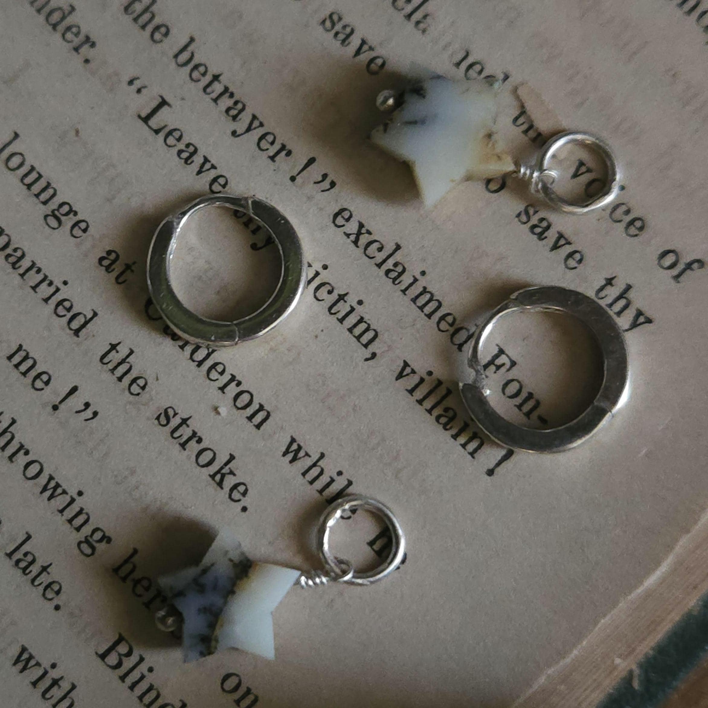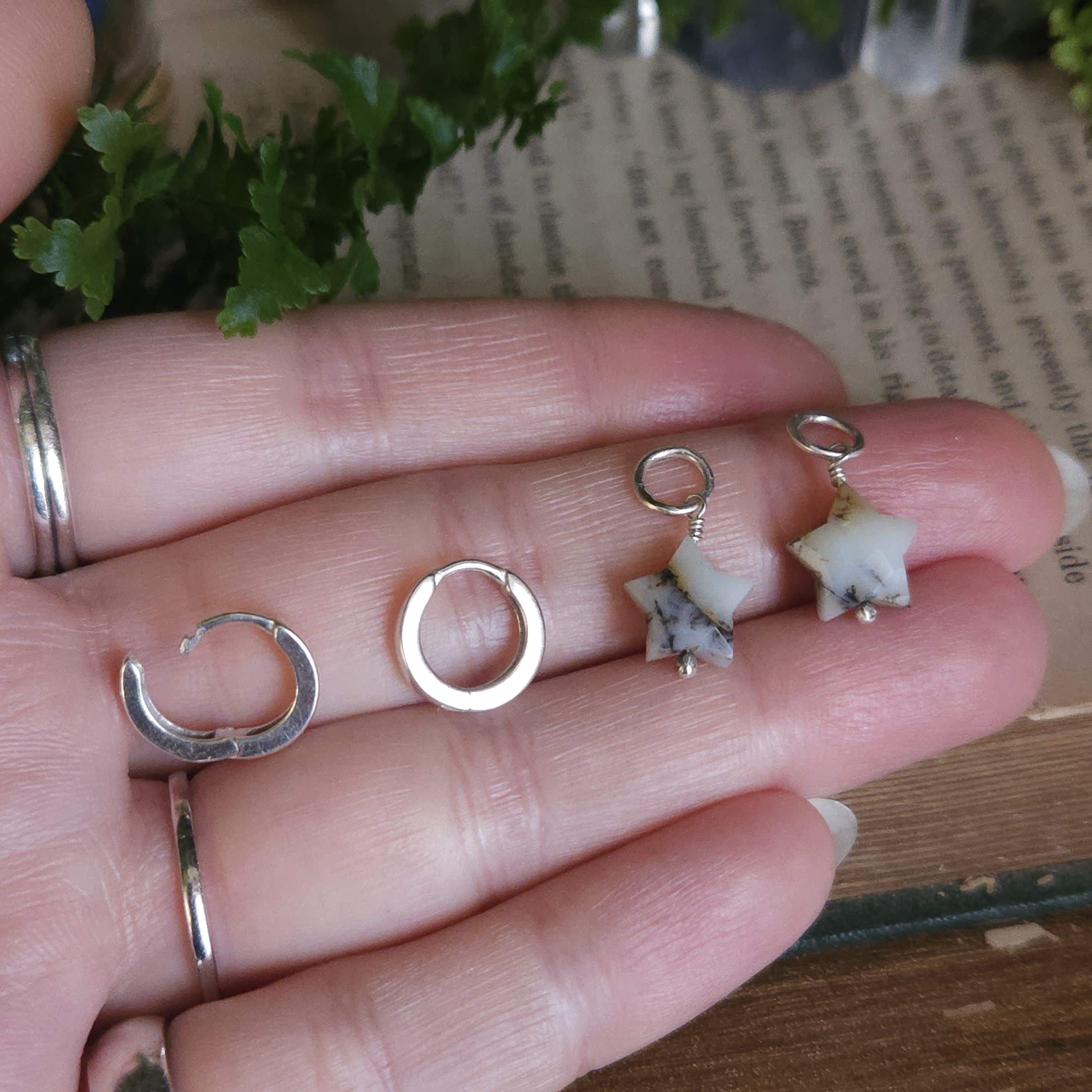 Made using sterling silver and dendritic opal. The charms are unattached, so you can take them off and wear just the hoops if you'd like.