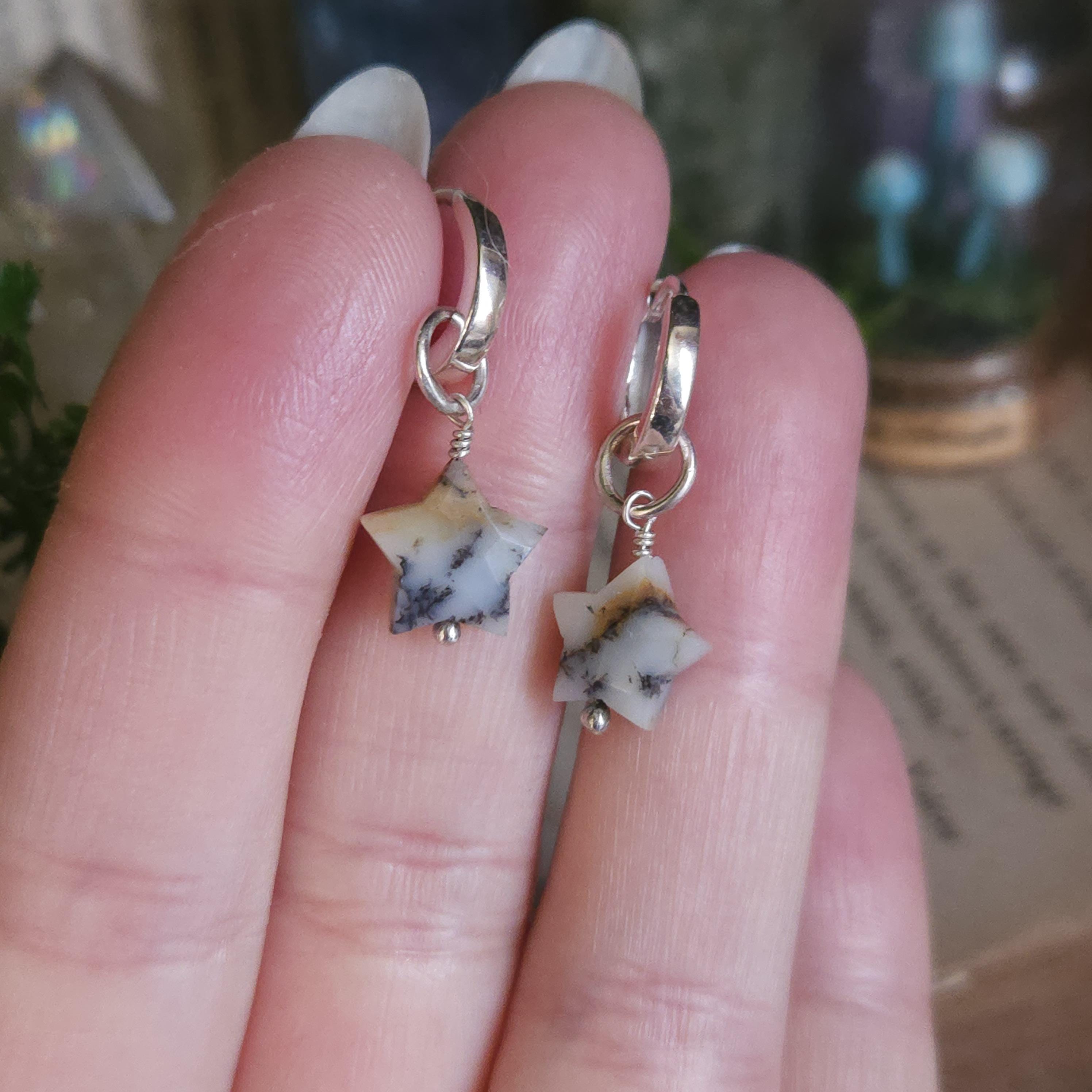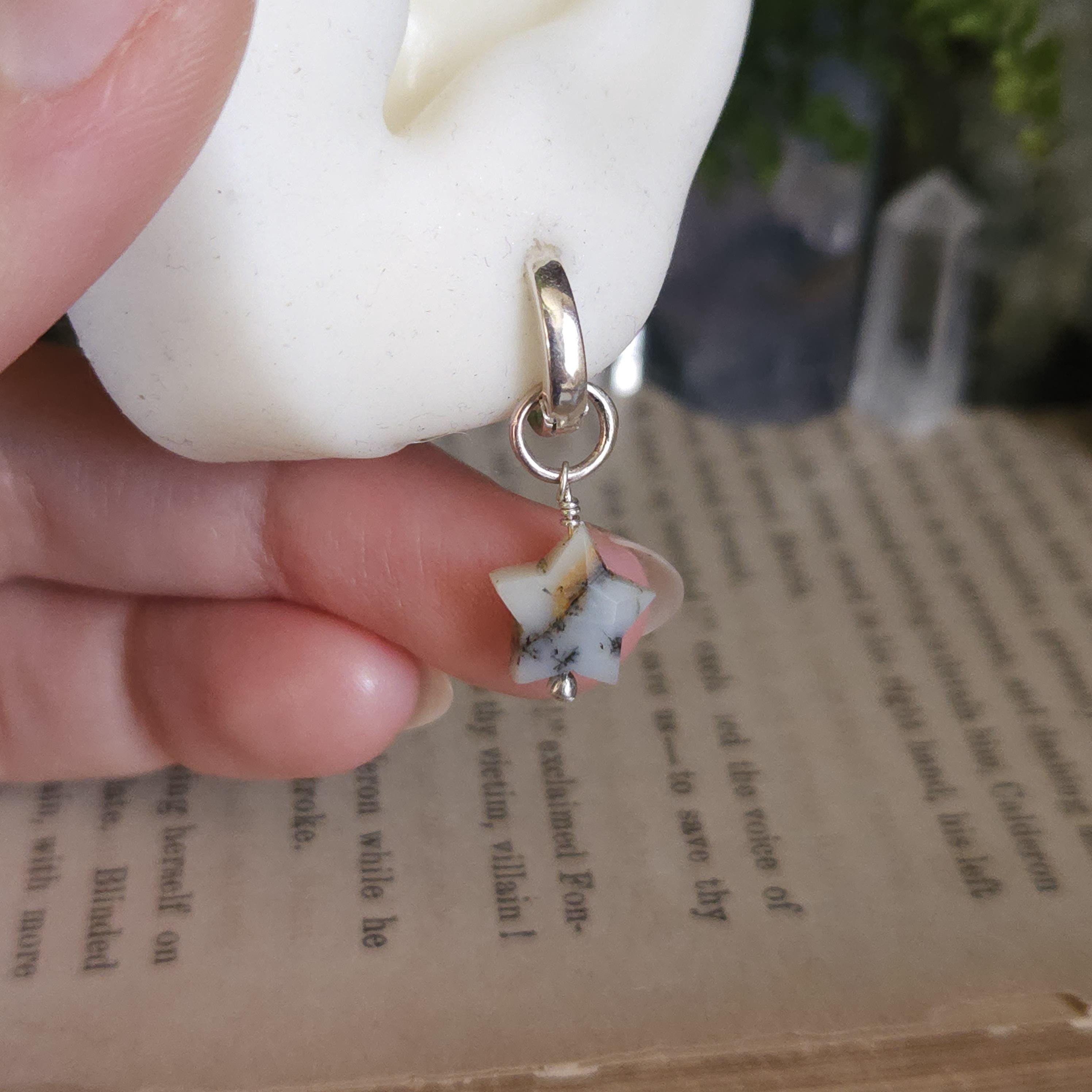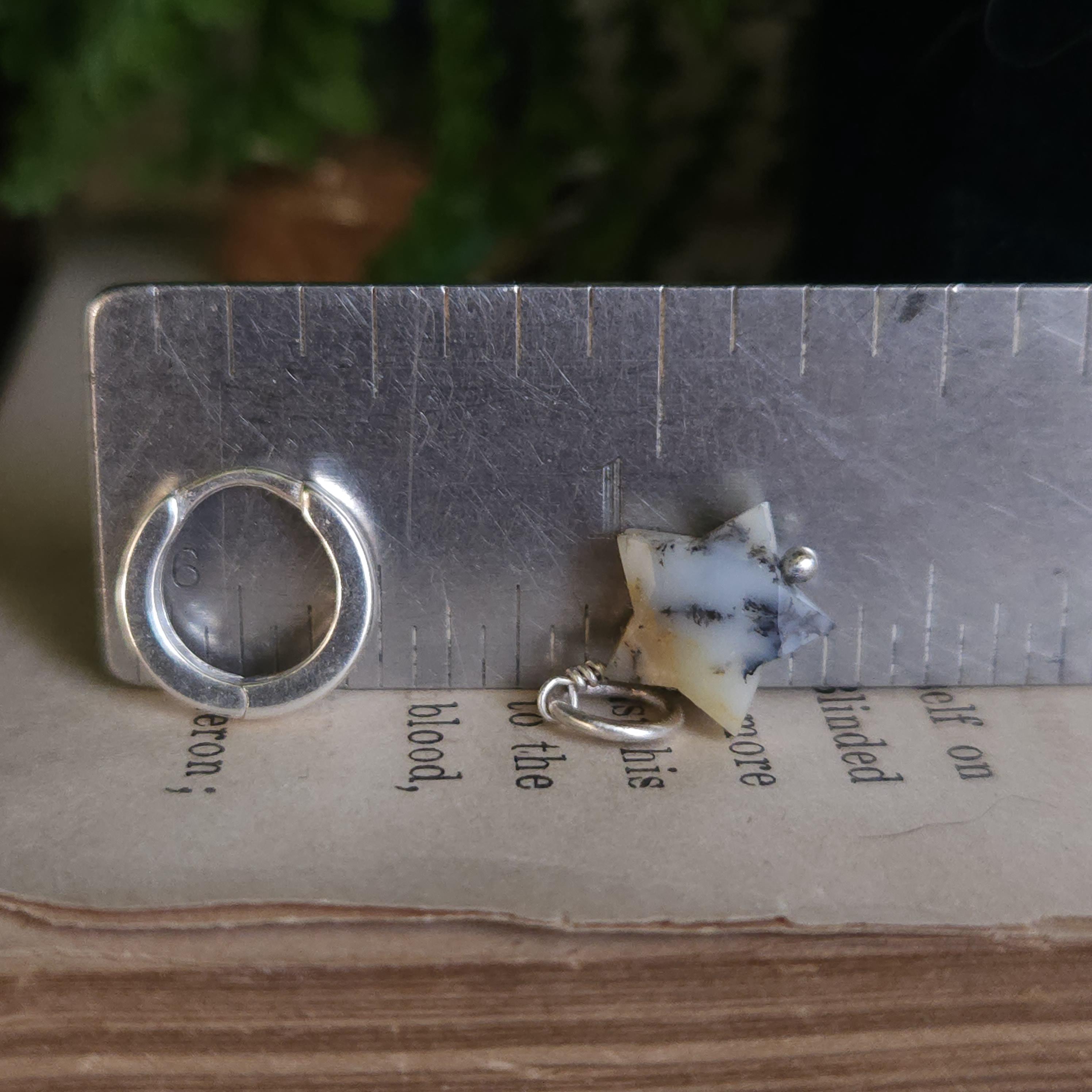 Made using sterling silver and dendritic opal. The charms are unattached, so you can take them off and wear just the hoops if you'd like.