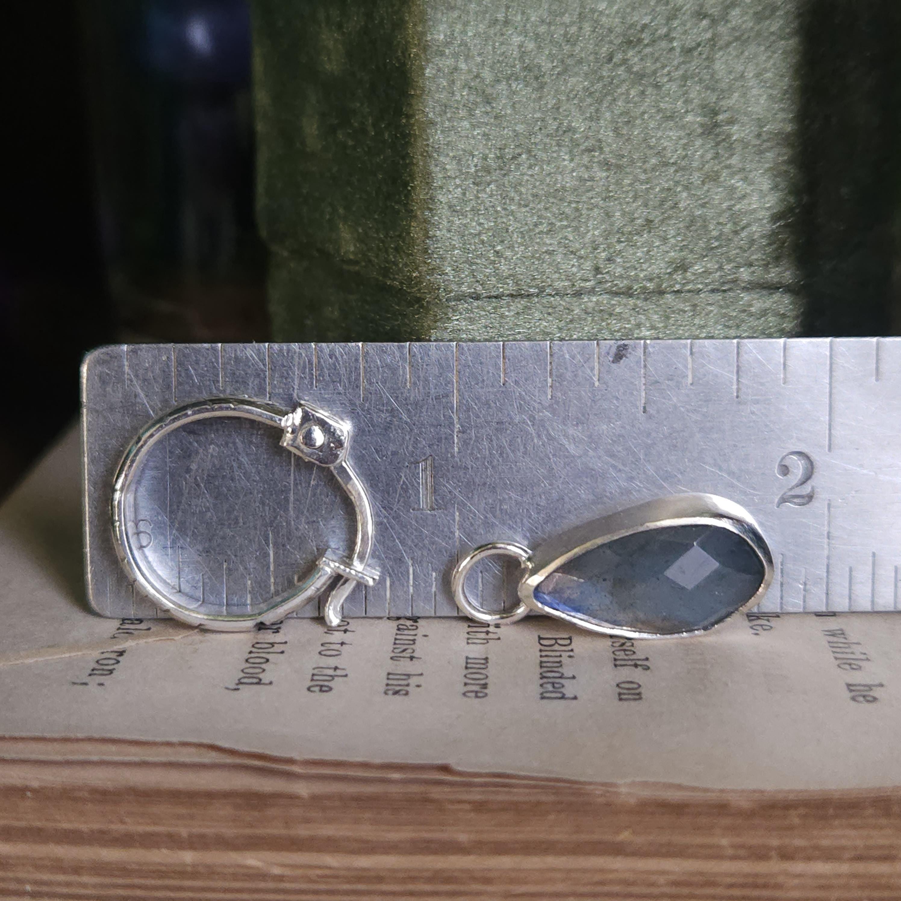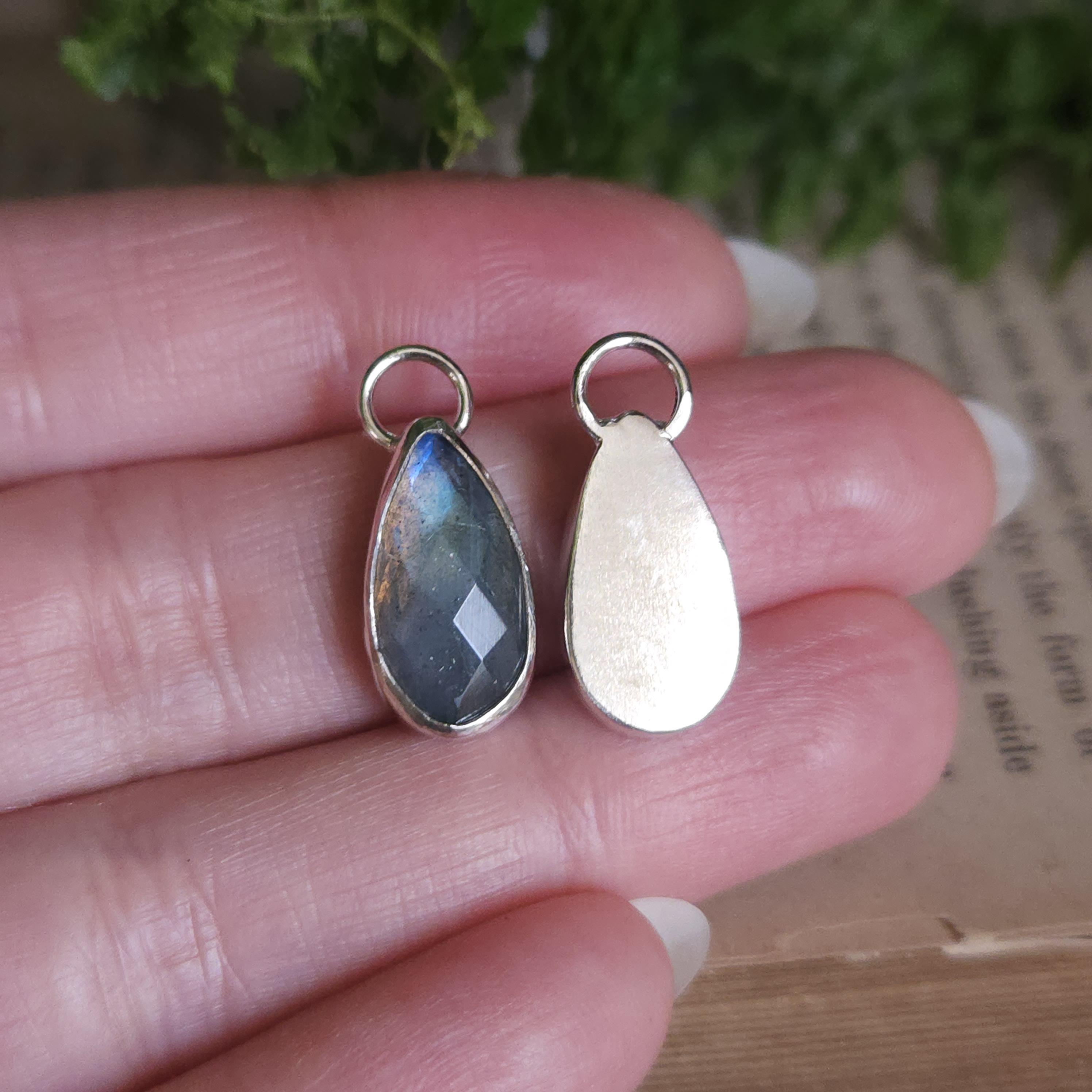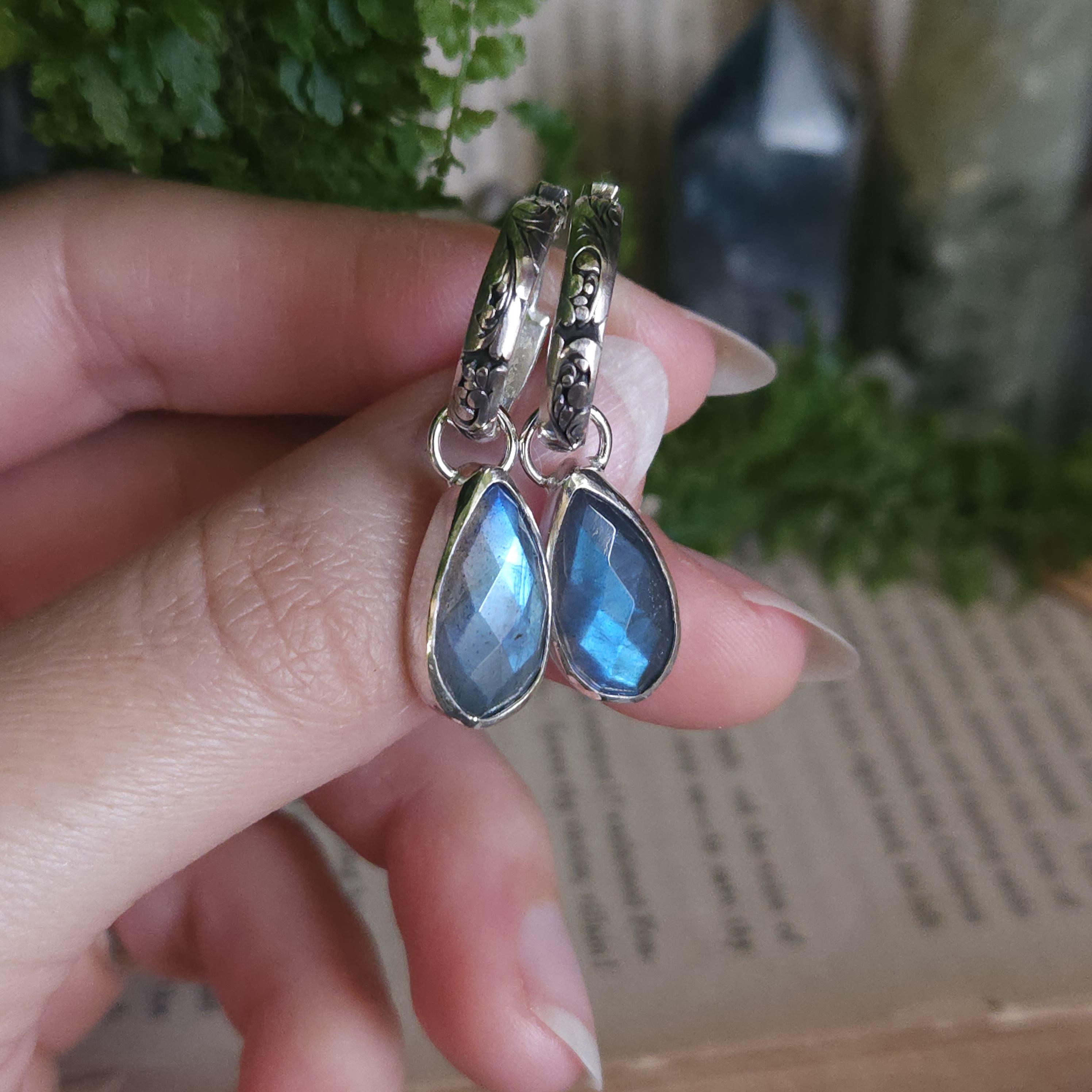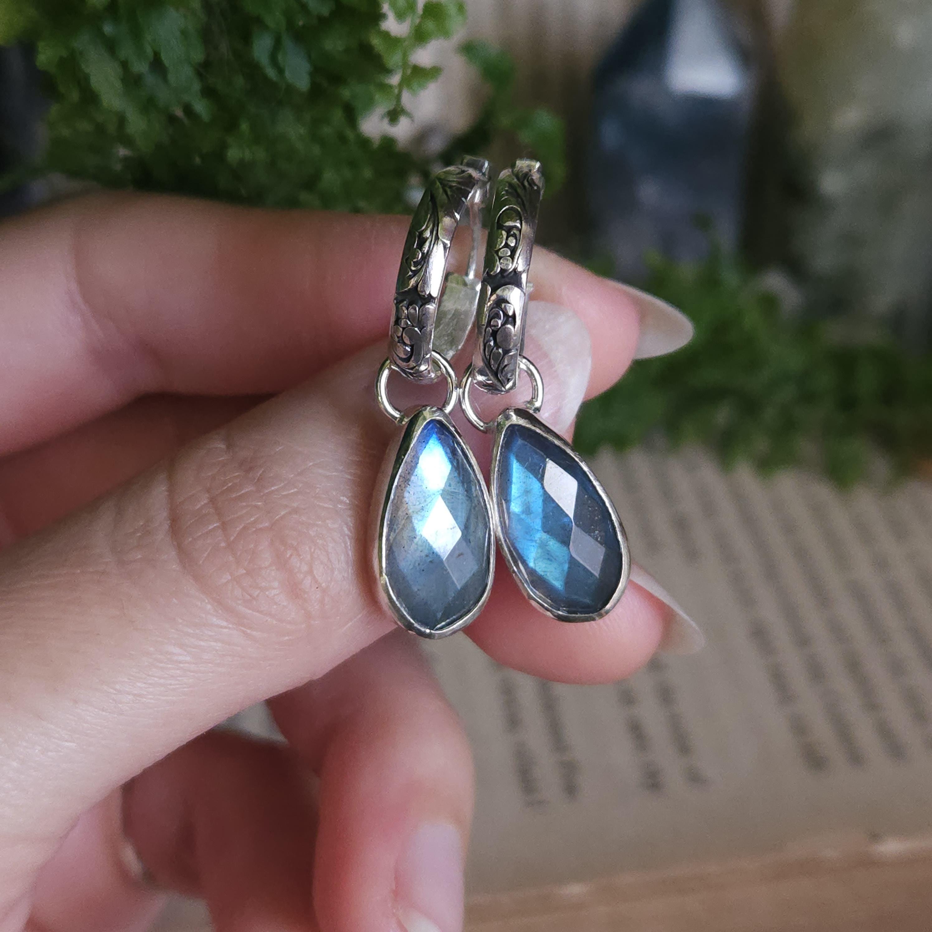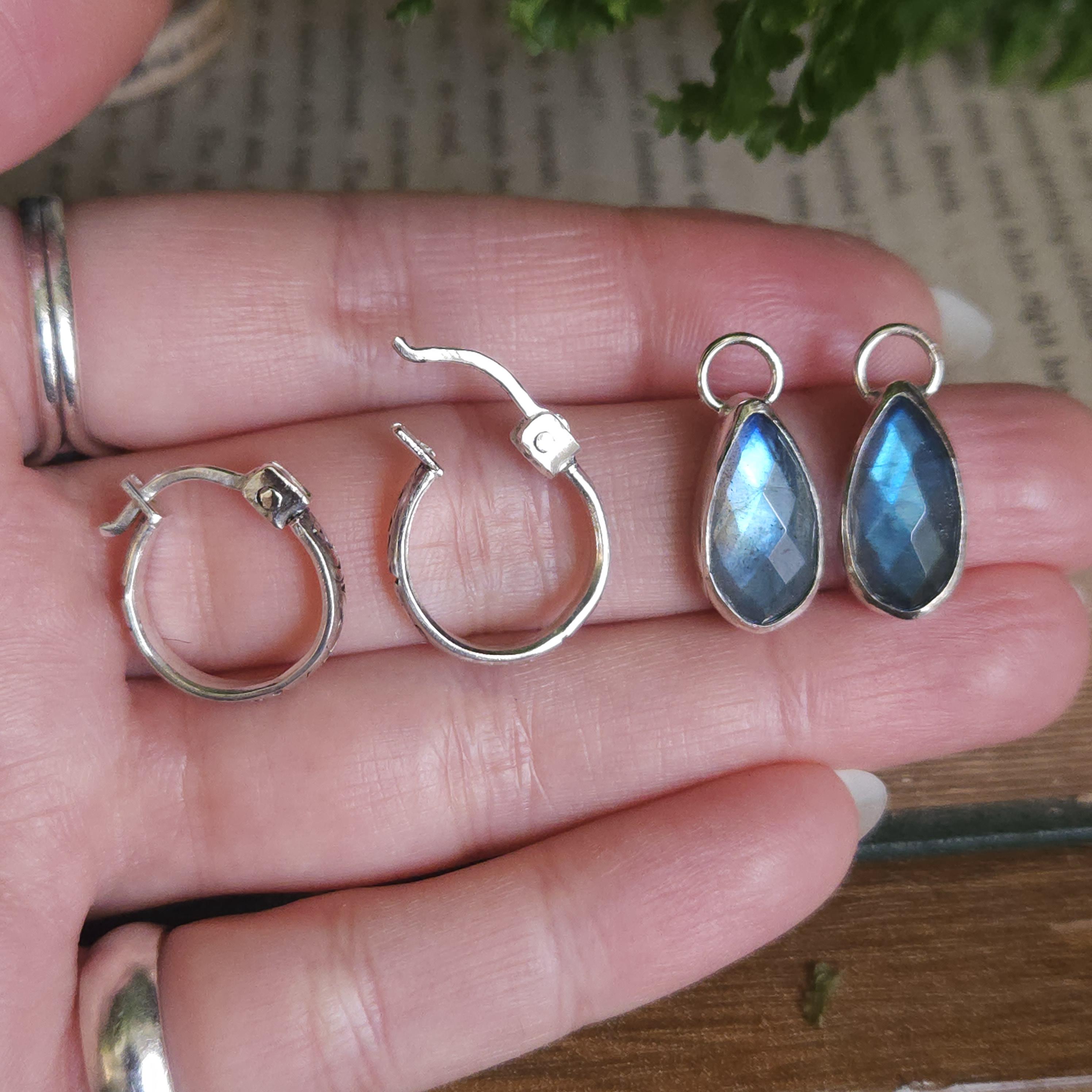 Made using sterling silver and labradorite. The charms are unattached, so you can take them off and wear just the hoops if you'd like.