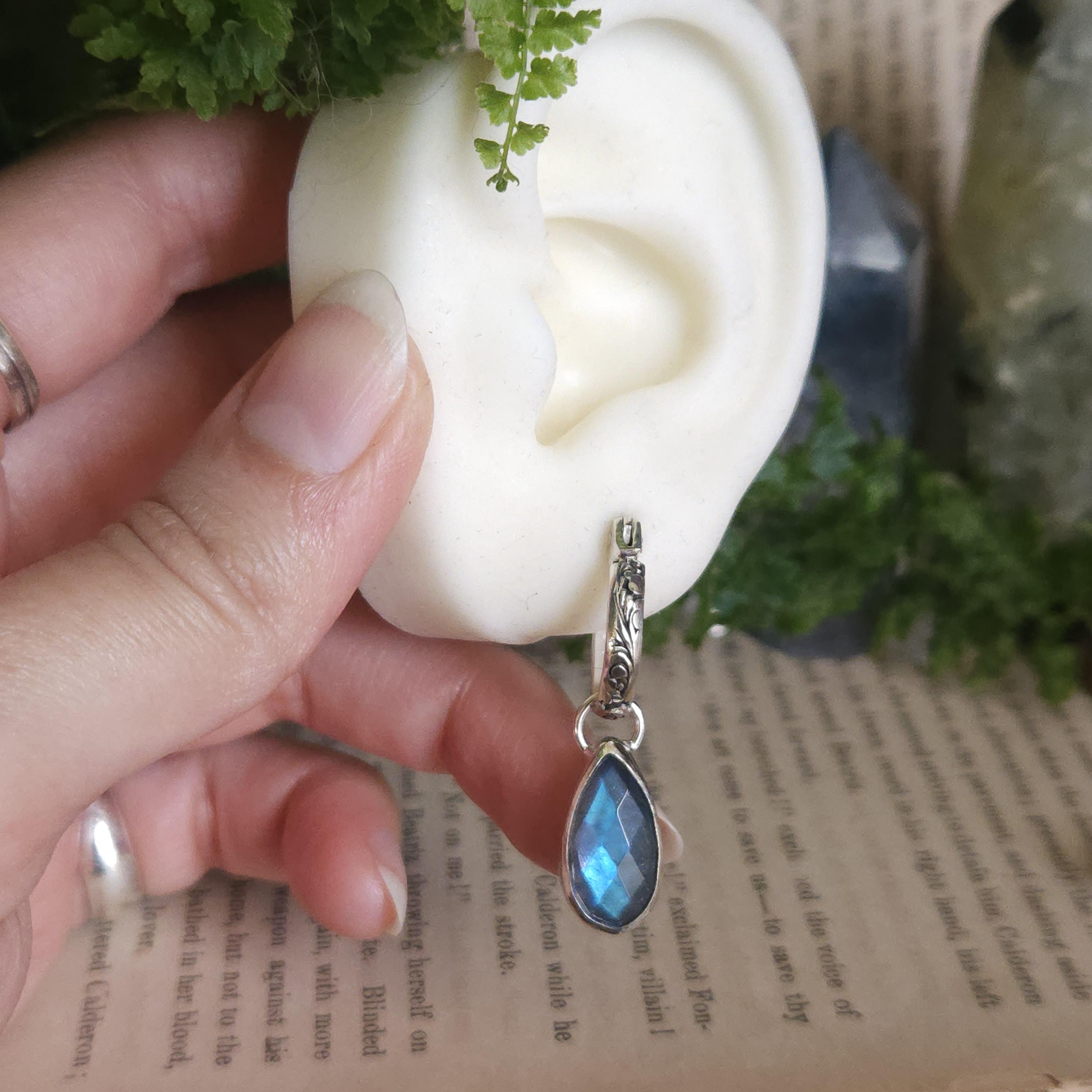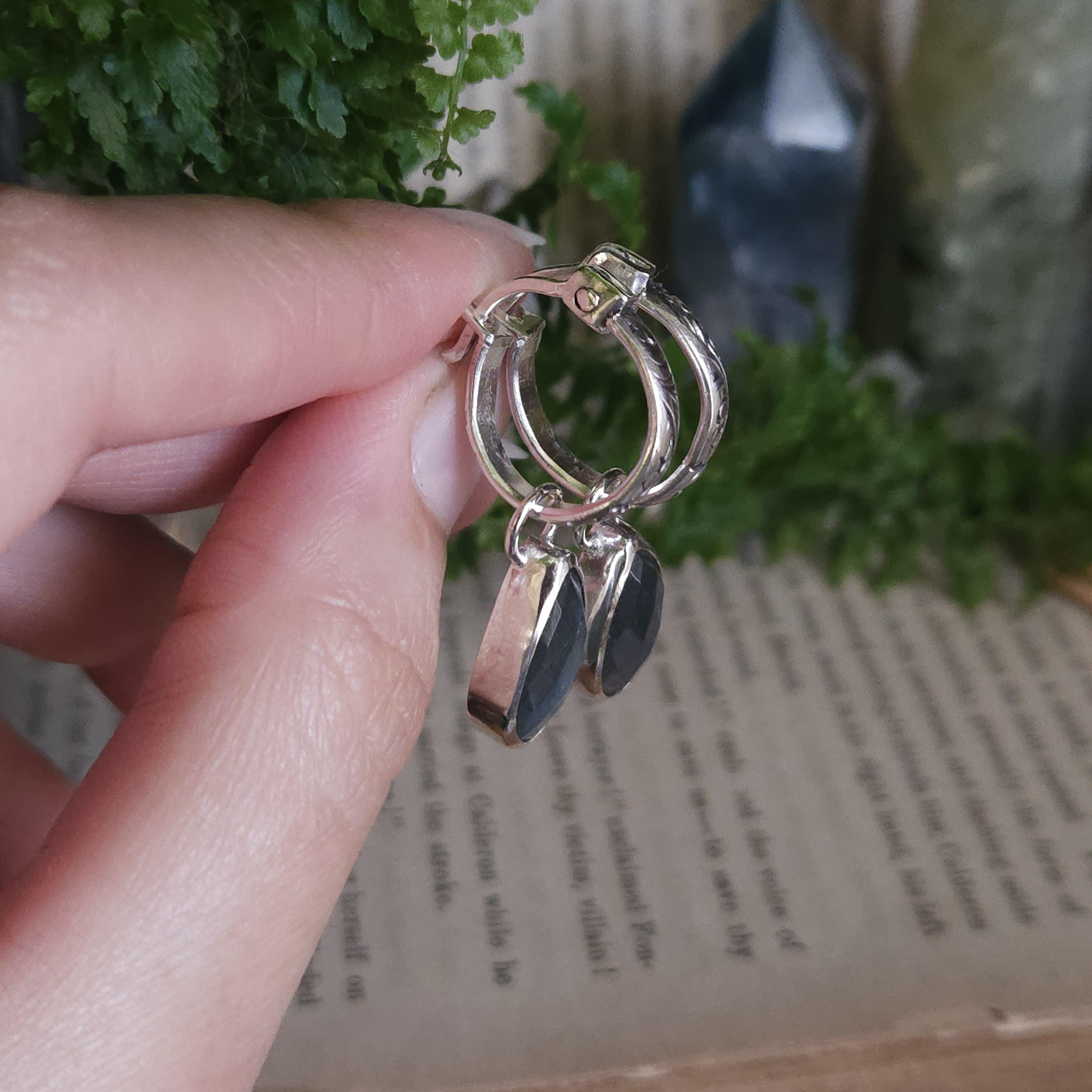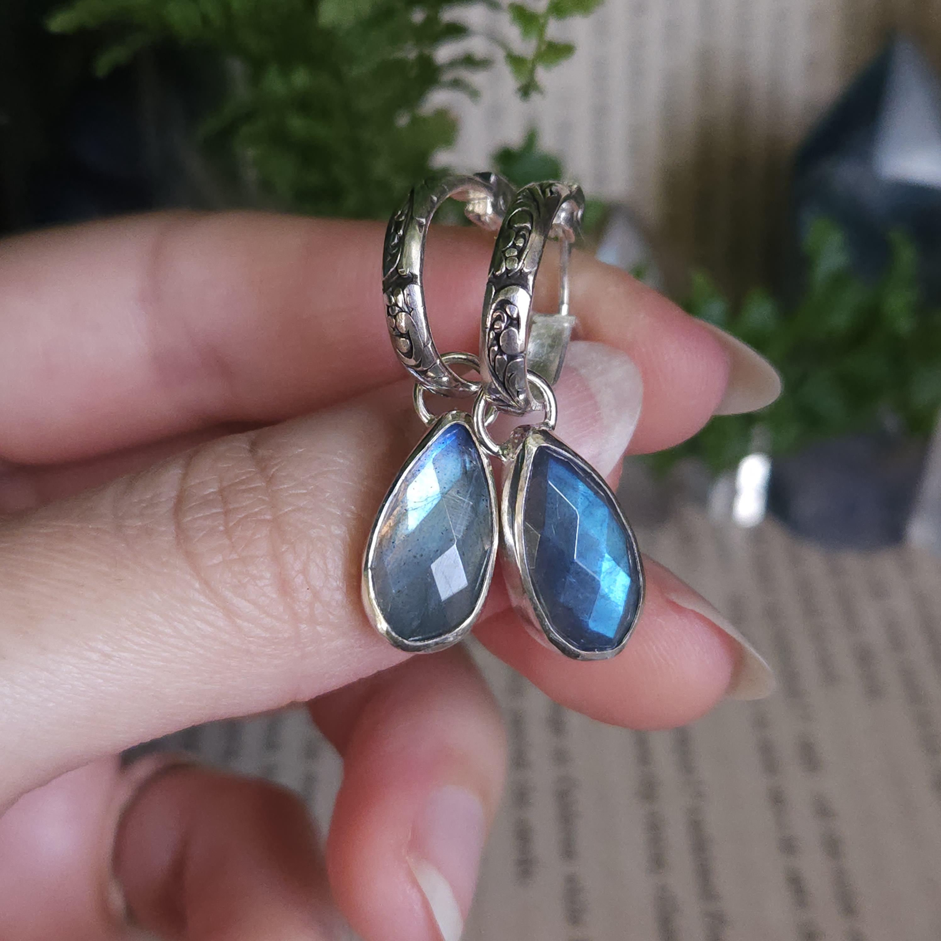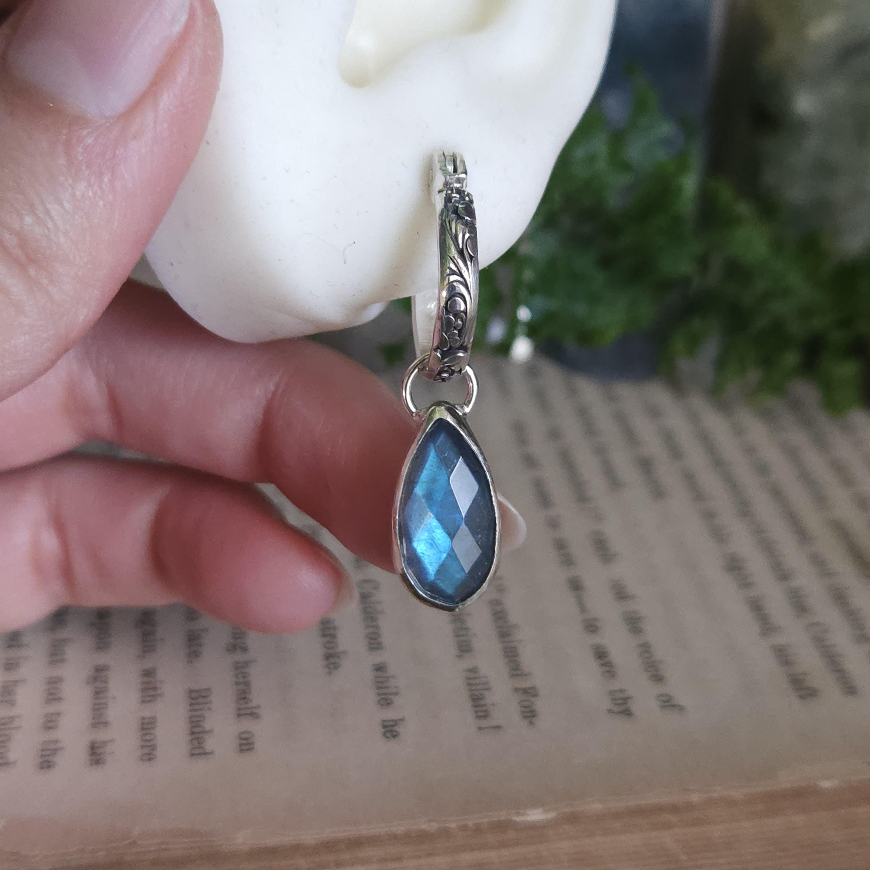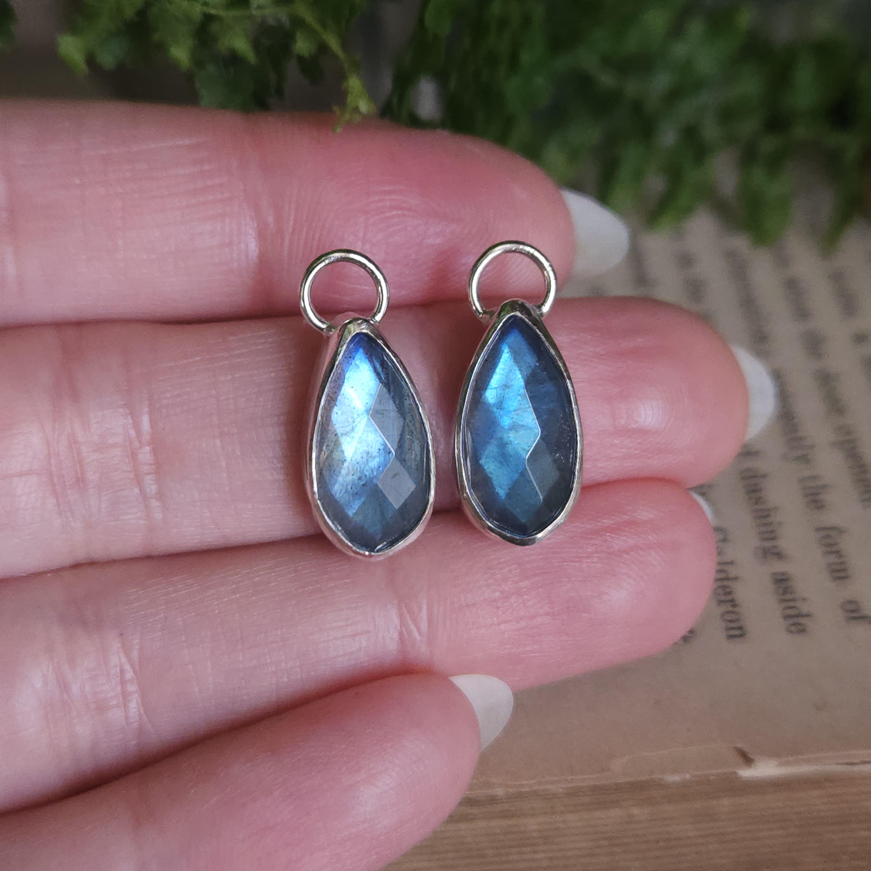Made using sterling silver and labradorite. The charms are unattached, so you can take them off and wear just the hoops if you'd like.